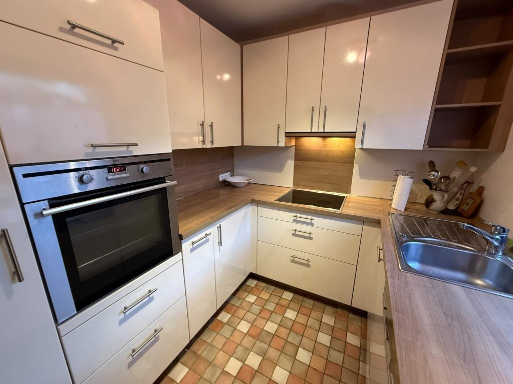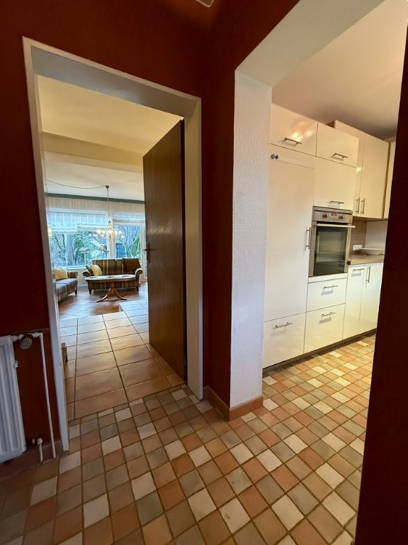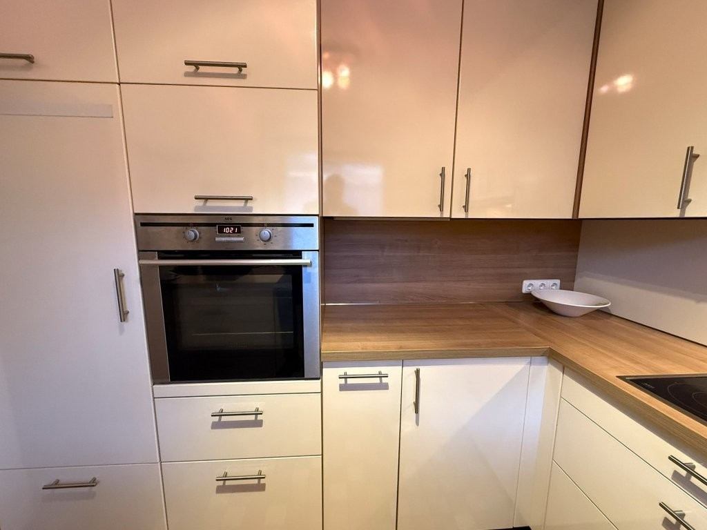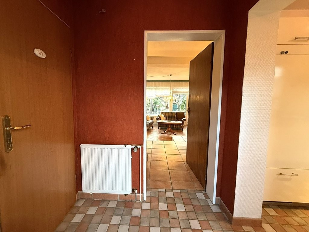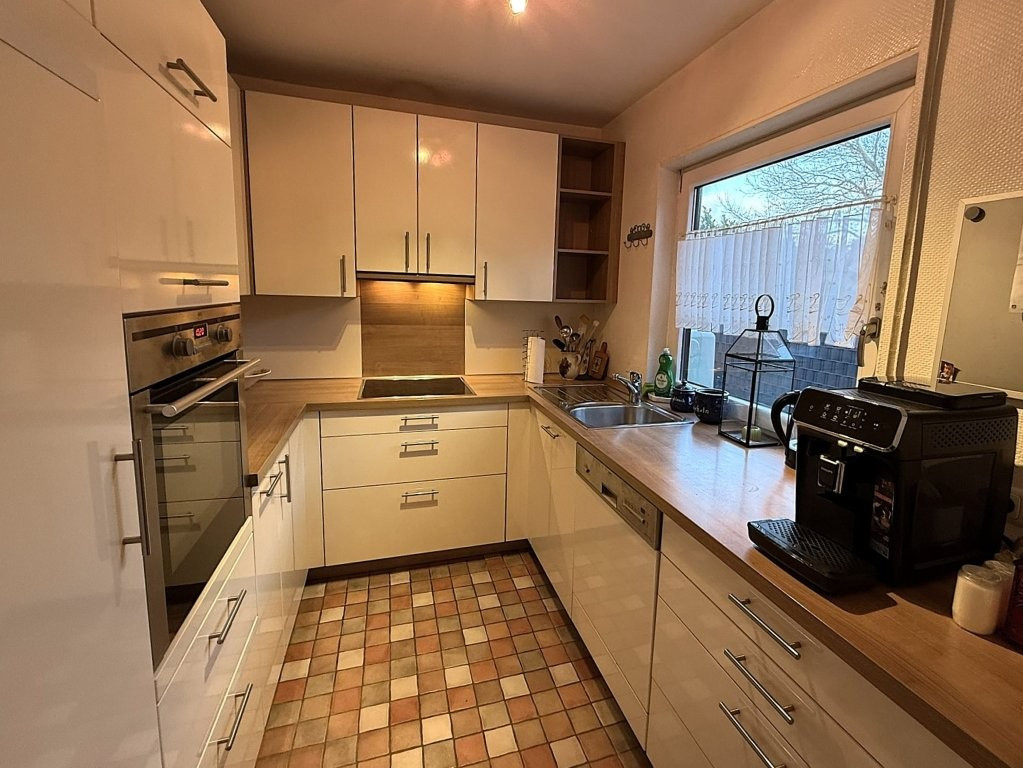 Über eine dreistufige Eingangstreppe erreichen Sie Ihr neues Zuhause und gelangen zunächst in die Diele. Linkerhand befindet sich ein hell gefliestes Gäste-WC mit einem kleinen Fenster. Rechterhand erwartet Sie die Küche. Sie ist ausgestattet mit einer U-förmigen Einbauküche mit cremefarbenen Hochglanzfronten. Neben zahlreichen Ober- und Unterschränken verfügt diese über einen großen Kühlschrank, einen hochgesetzten Backofen, ein Cerankochfeld mit Dunstabzugshaube und einen Geschirrspüler – alles aus dem Hause AEG – und bietet somit alle Möglichkeiten zum Ausleben Ihrer Kochkünste.