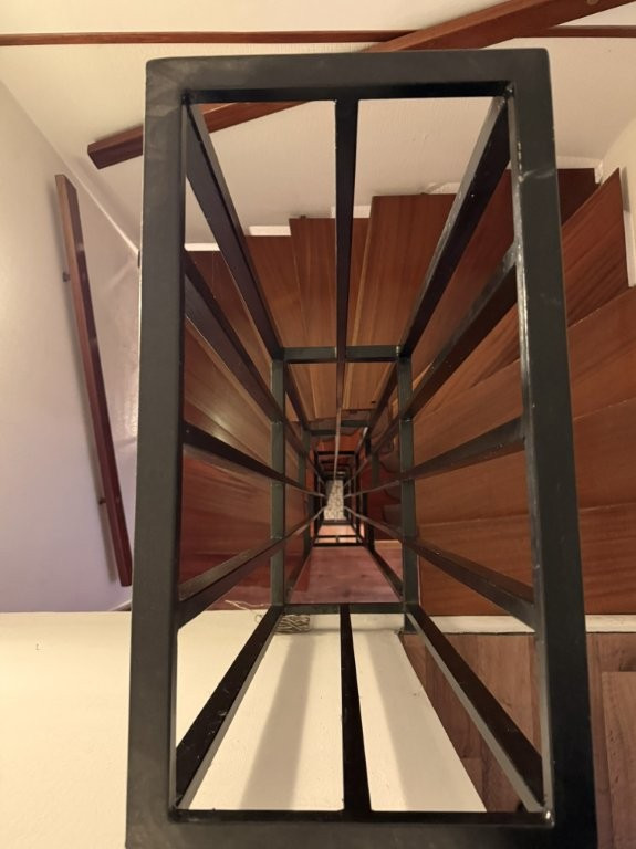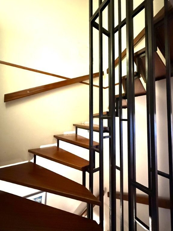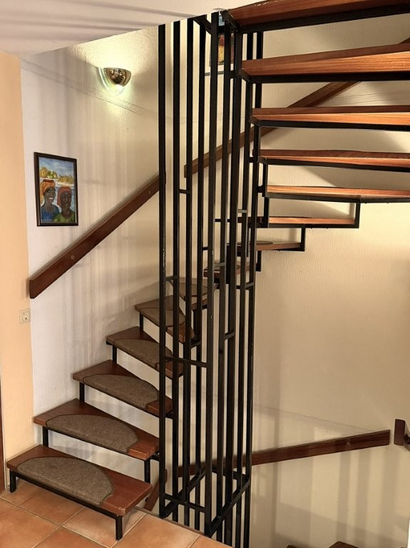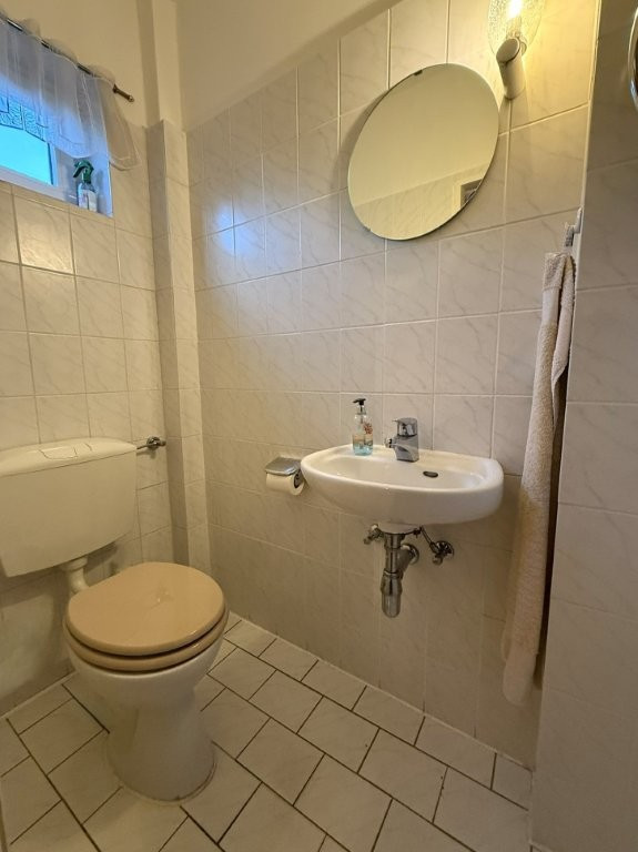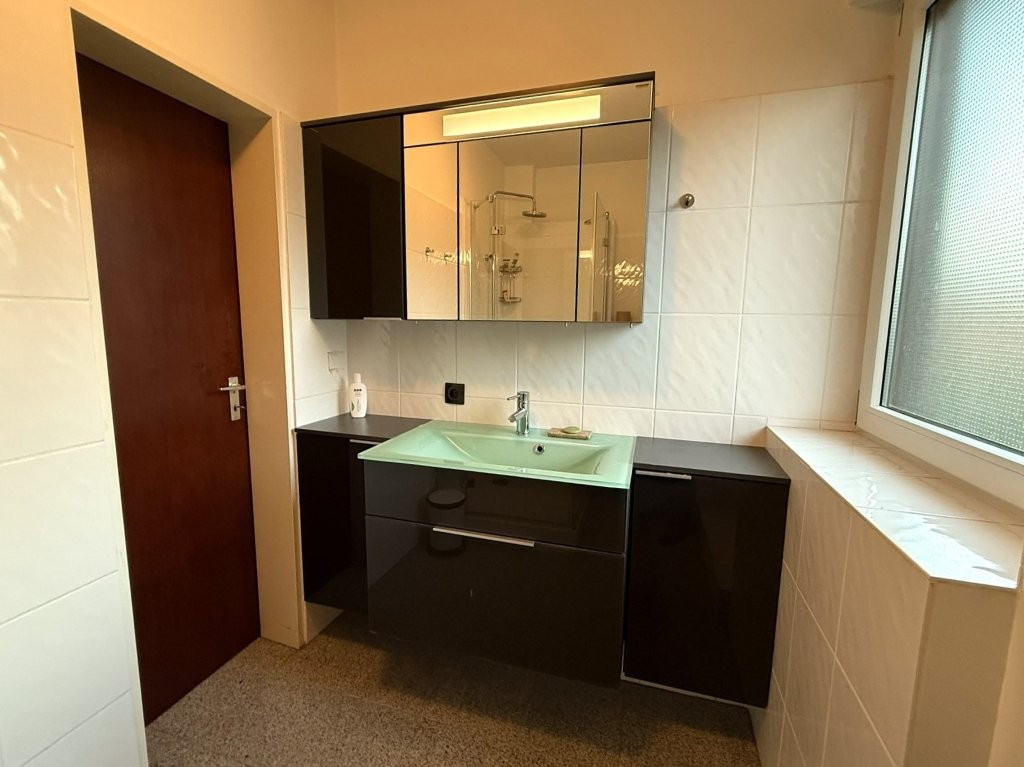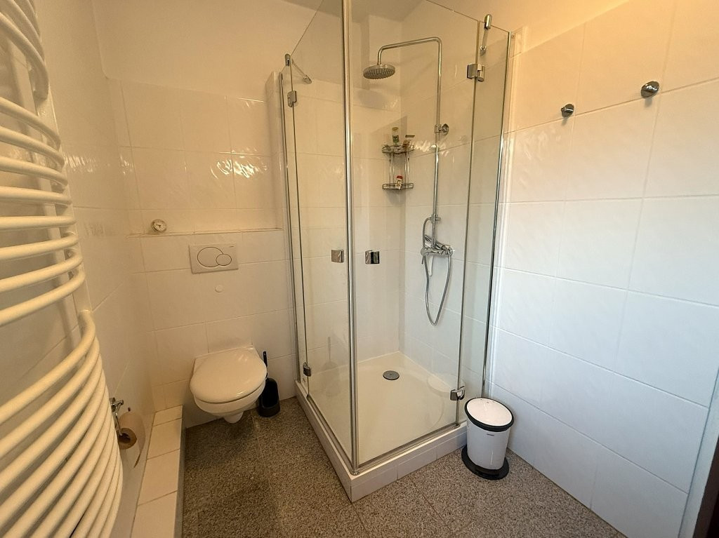 Die Treppenanlage, baujahrestypisch als Metall-Holz-Kombination konstruiert, führt Sie in sämtliche Etagen des Hauses. Das Obergeschoss bietet drei Zimmer zur flexiblen Nutzung. In ihnen wurde, ebenso wie im Flur, Laminatboden verlegt. Das größte der drei Zimmer verfügt über einen Zugang zu dem vorgelagerten Balkon mit Blick in den Garten. Das sich auf dieser Ebene befindende Badezimmer besitzt weiße Wandfliesen und einen grauen Granitboden. Neben einem wandhängenden WC und einem Waschtisch sind eine Dusche mit Echtglasabtrennung und ein Handtuchheizkörper vorhanden. Durch das große Fenster gelangen Tageslicht hinein und feuchte Luft hinaus.