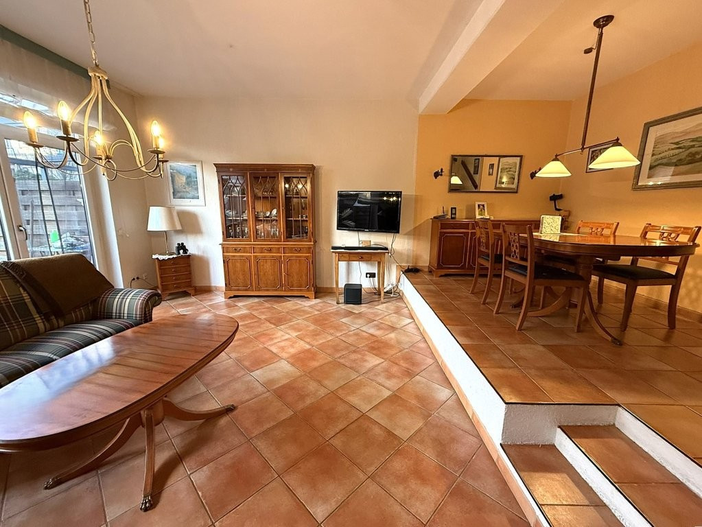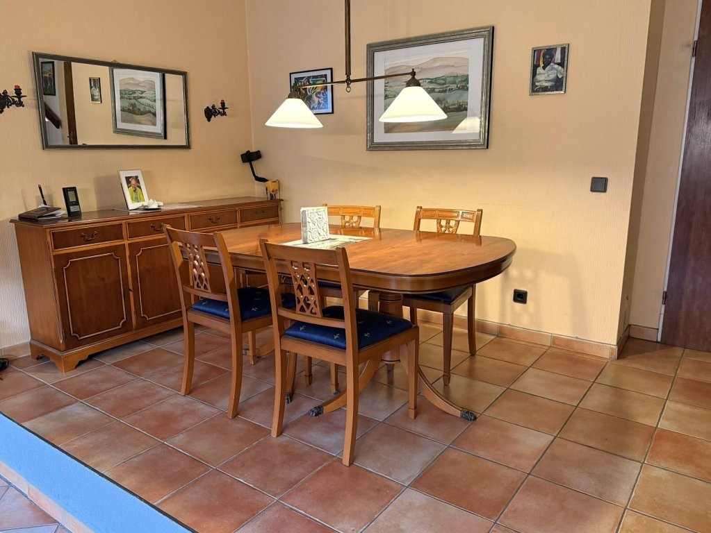 Aus der Diele geradezu erreichen Sie den Wohn- und Essbereich. Letzterer liegt etwas erhöht und verbindet auf diese Weise eine optische Trennung bei gleichzeitiger Großzügigkeit. Vom Wohnbereich aus gelangen Sie auf die Terrasse und in den sich anschließenden Garten. Genießen Sie hier durch die optimale Ausrichtung Ihren sonnigen Feierabend. Der Schuppen bietet Stauraum für die notwendigen Gartengeräte. An kühleren Tagen sorgt der im Wohnbereich befindliche Kaminofen für gemütlicher Stunden. Wohn- und Essbereich wurden mit Terrakotta-Fliesen versehen und unterstützen auf diese Weise die wohlig-warme Atmosphäre.