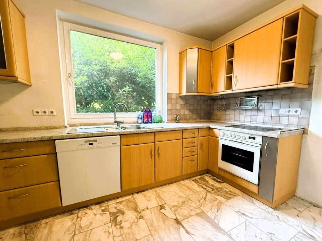 Sie betreten das Haus auf der mittleren Ebene, die zum allergrößten Teil über hochwertigen Naturstein-Bodenbelag verfügt. Rechterhand liegt die Küche. Sie ist mit einer älteren Einbauküche inklusive Elektrogeräten versehen. Von dort oder alternativ über den Flur durch eine zweiflüglige Tür ist der großzügige Wohn-Ess-Bereich, der über verschiedene Einbauschränke verfügt, zugänglich. Ihm vorgelagert ist der Balkon, auf dem Sie sonnige Abendstunden mit Blick ins Grüne genießen können. Von der Diele aus linkerhand befinden sich ein weiteres Zimmer sowie ein in weiß gehaltenes Bad mit Eckbadewanne, Waschtisch, WC und Handtuchheizkörper.