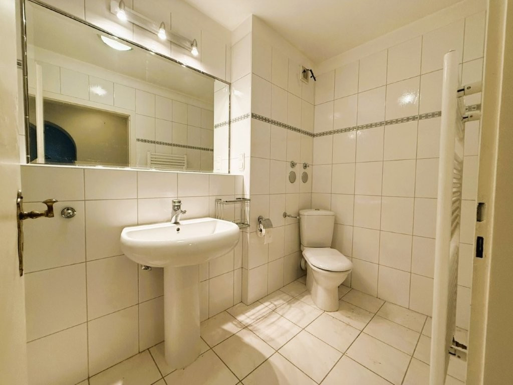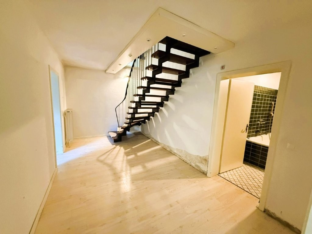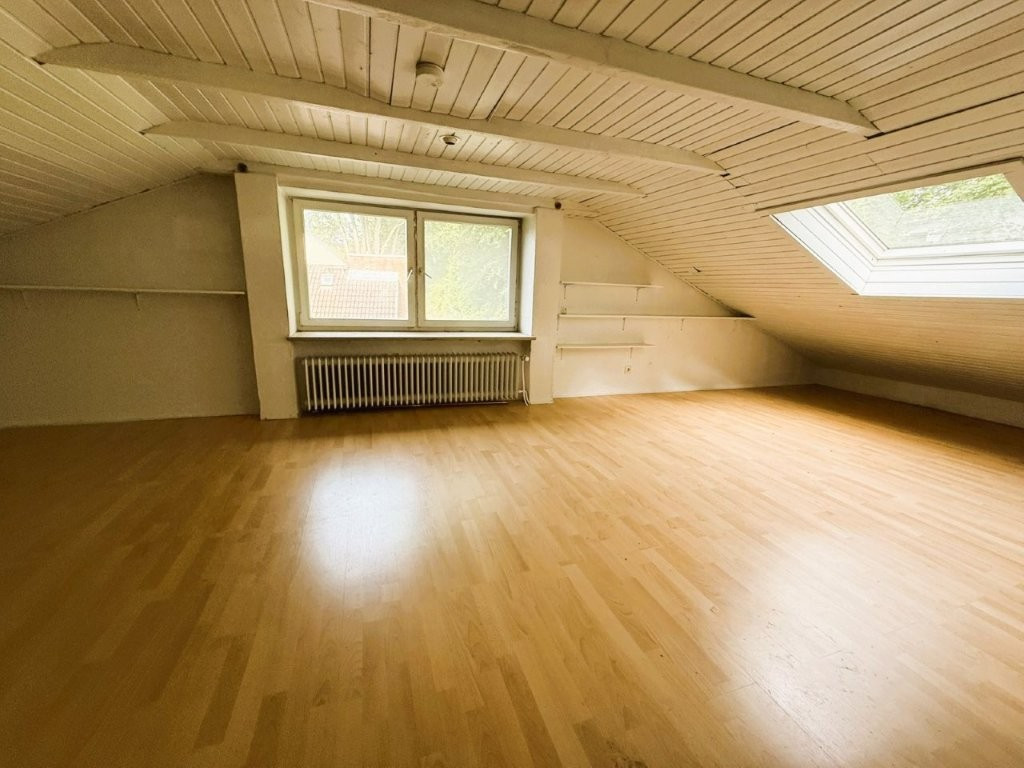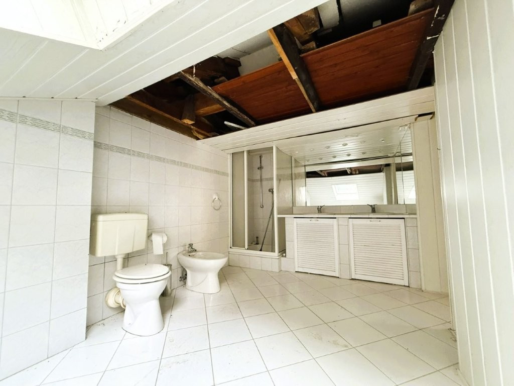 Eine weitere offene Holztreppe erschließt von der mittleren Ebene aus das Dachgeschoss. Die Deckenhöhe in den Bereichen ohne Schrägen beträgt 1,95 m, so dass diese Räume nicht in die Wohnfläche eingeflossen sind. Hier sind ein großes, helles Studio mit Laminatboden und ein angeschlossenes, drittes Badezimmer mit Dusche, Doppelwaschtisch, WC und Bidet in weiß vorhanden. Abgerundet wird das Raumangebot dieser Ebene durch einen Abstellraum.