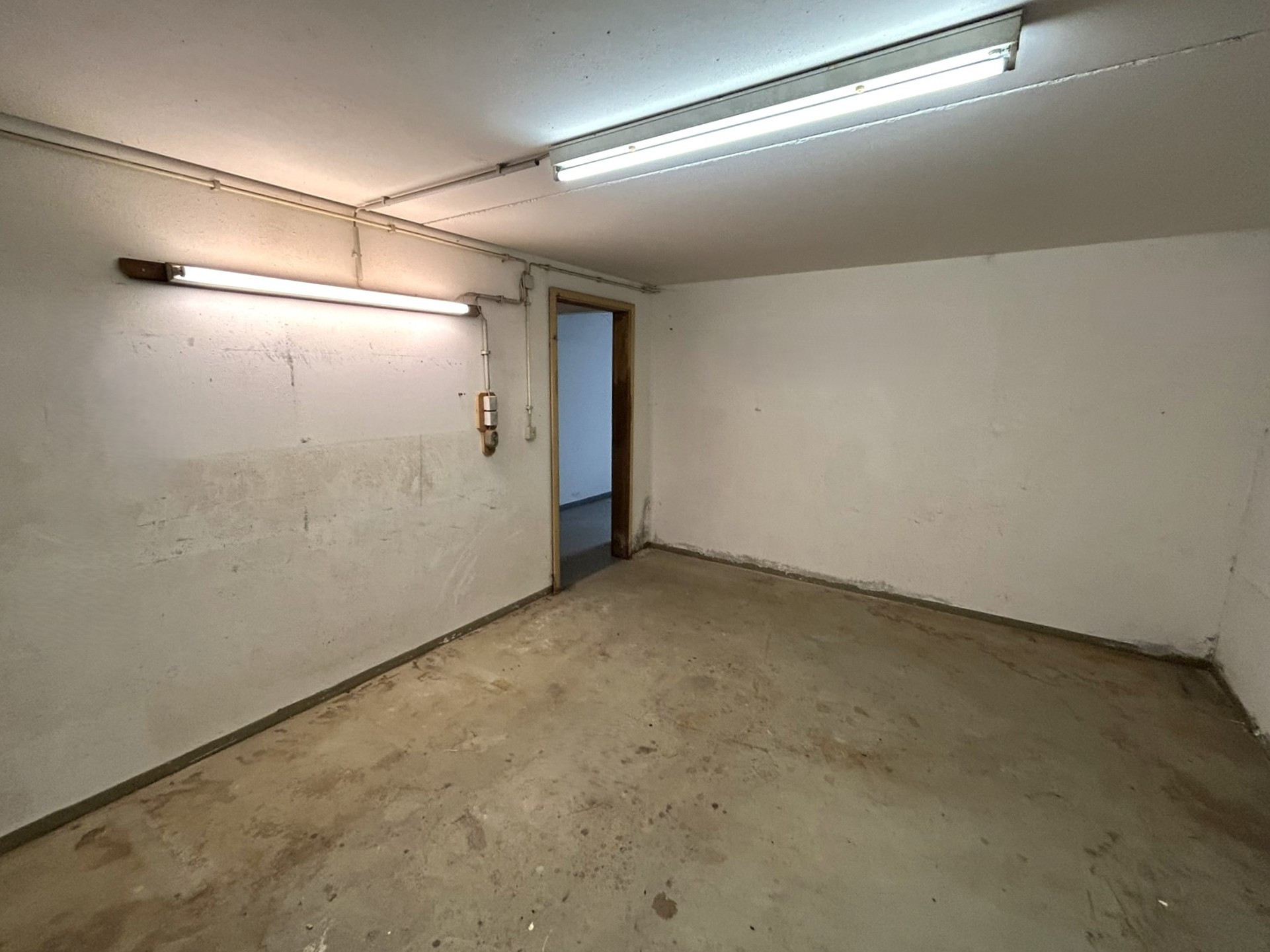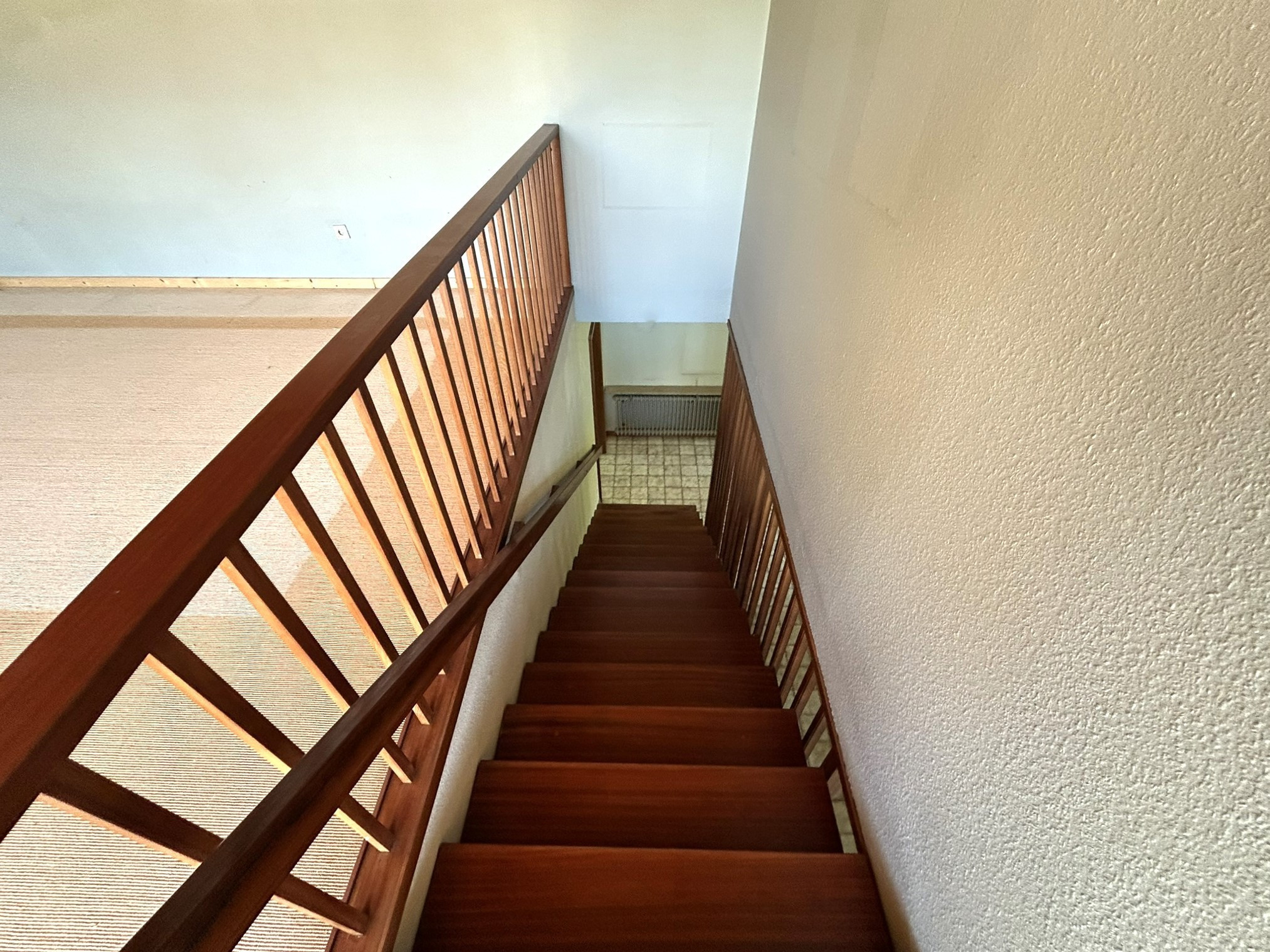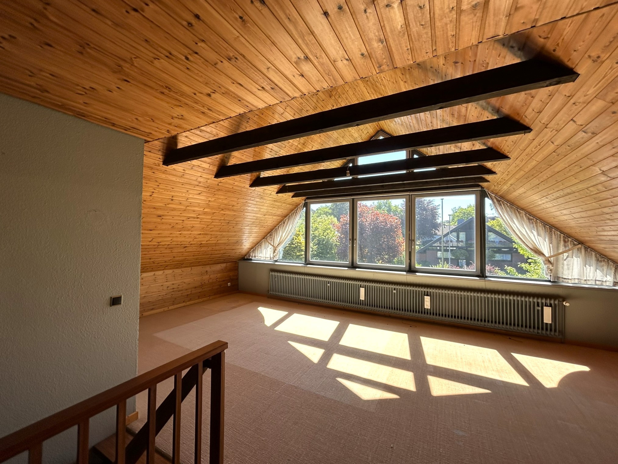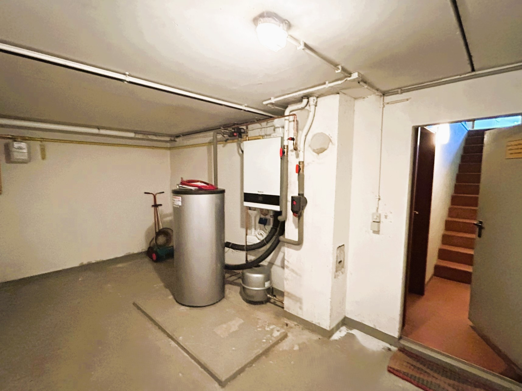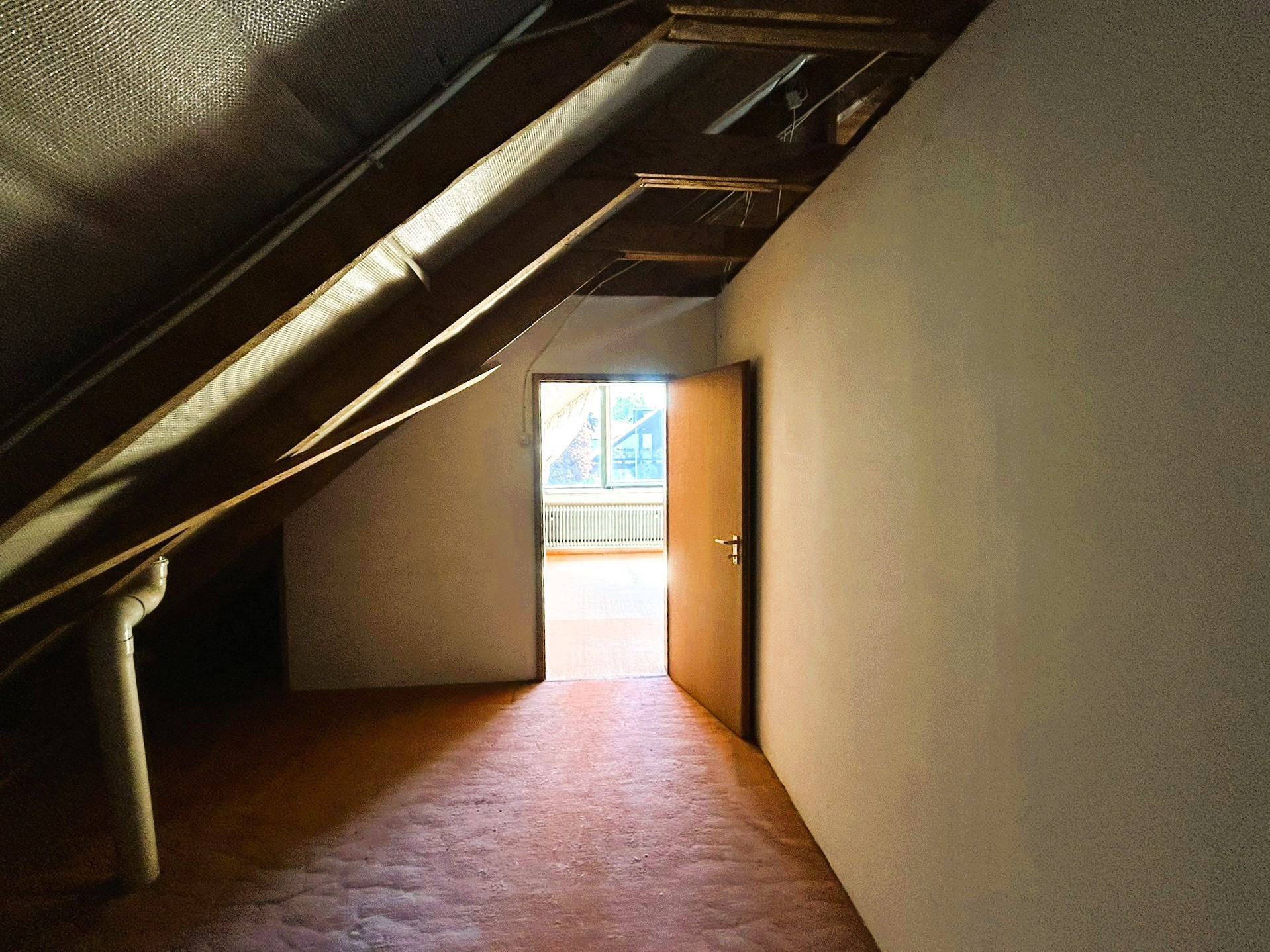 Eine offene Massivholztreppe führt Sie in das zum Teil ausgebaute Obergeschoss. Der weitläufige, studioartige Raum beeindruckt durch seine übergroße Fensterfront sowie die zum Teil freiliegenden Deckenbalken. Hier stehen Ihnen derzeit ca. 38,53 m² Wohnfläche zur Verfügung. Der Rest des Obergeschosses wird aktuell als Dachboden genutzt und bietet Ihnen somit ggf. noch weitere Ausbaumöglichkeiten. Unter Berücksichtigung der Schrägen könnten weitere ca. 40,29 m² Wohnfläche entstehen. Da ein Bebauungsplan nicht besteht, richtet sich die Zulässigkeit nach der Nachbarbebauung. Das konkrete Vorhaben ist mit dem Bauamt abzuklären.Reichlich Abstellfläche und Raum für diverse anderen Nutzungen finden Sie im Vollkeller des Hauses. Er umfasst ca. 112,46 m² verteilt auf sieben Räume und verfügt über eine Deckenhöhe von ca. 2,20 m. Unter anderem befinden sich dort zur Zeit die Waschküche und die Ende des Jahres 2022 installierte Gasbrennwertheizung mit zentraler Warmwasseraufbereitung von Buderus.