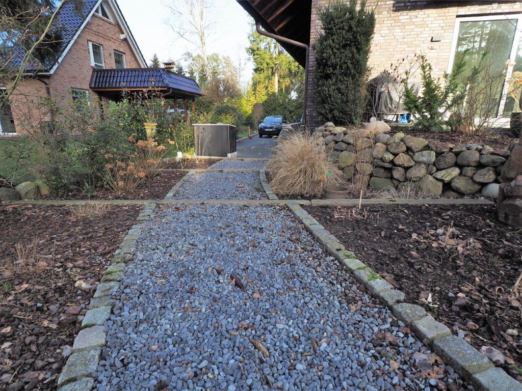 Rund um das Haus wurde die sorgfältige Auswahl hochwertiger Materialien selbstverständlich fortgesetzt. Unterschiedliche Terrassierungen unter Verwendung von Fels- und Granitsteinen, sogenannten Hamburger Kanten, geschmackvolle Beleuchtung und abwechslungsreiche Bepflanzung schaffen ein stimmiges Gesamterscheinungsbild, das sich gleichermaßen in die umliegende Natur einfügt als auch positiv hervorhebt. Auf dem bereits gepflasterten Bereich rechts des Hauses besteht die Möglichkeit, einen Carport zu errichten. Stromanschlüsse sowie Entwässerung sind auch hier schon vorhanden.