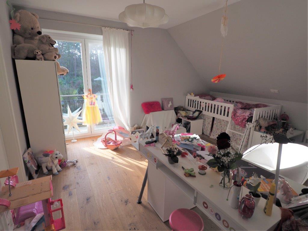Von der Diele führt Sie eine Treppe in das Obergeschoss. Diese wurde aufwändig mit dem passenden Parkett belegt und wird sowohl über ein Fenster als auch über kleine Wandeinbauleuchten belichtet. Neben einem gemütlichen Plätzchen auf der Galerie erwarten Sie im Obergeschoss drei Räume zur freien Verfügung. Von zwei Räumen aus erreichen Sie den großen, ebenfalls nach Südwesten ausgerichteten Balkon. Als Bodenbelag fand auch hier überwiegend das handgeschroppte Eichenparkett Verwendung, in einem Raum ist strapazierfähiger Sisal-Teppich verlegt. Alle Räume dieser Etage haben bodentiefe Fenster, auch das weitläufige Badezimmer, das neben einem Doppelwaschtisch ein WC und eine große Dusche beherbergt.
