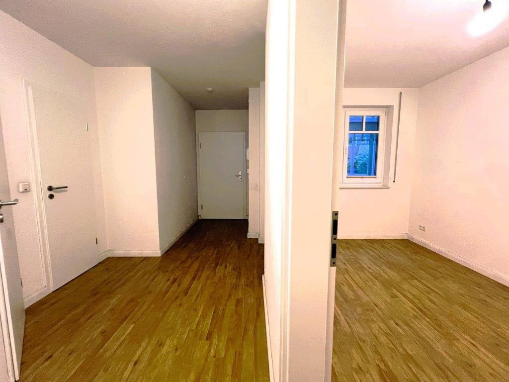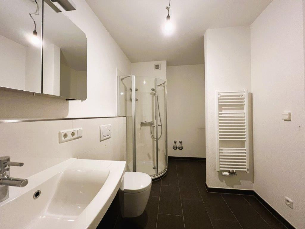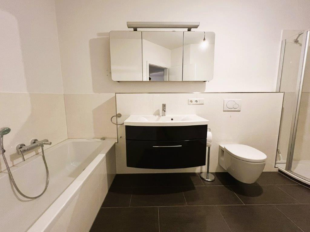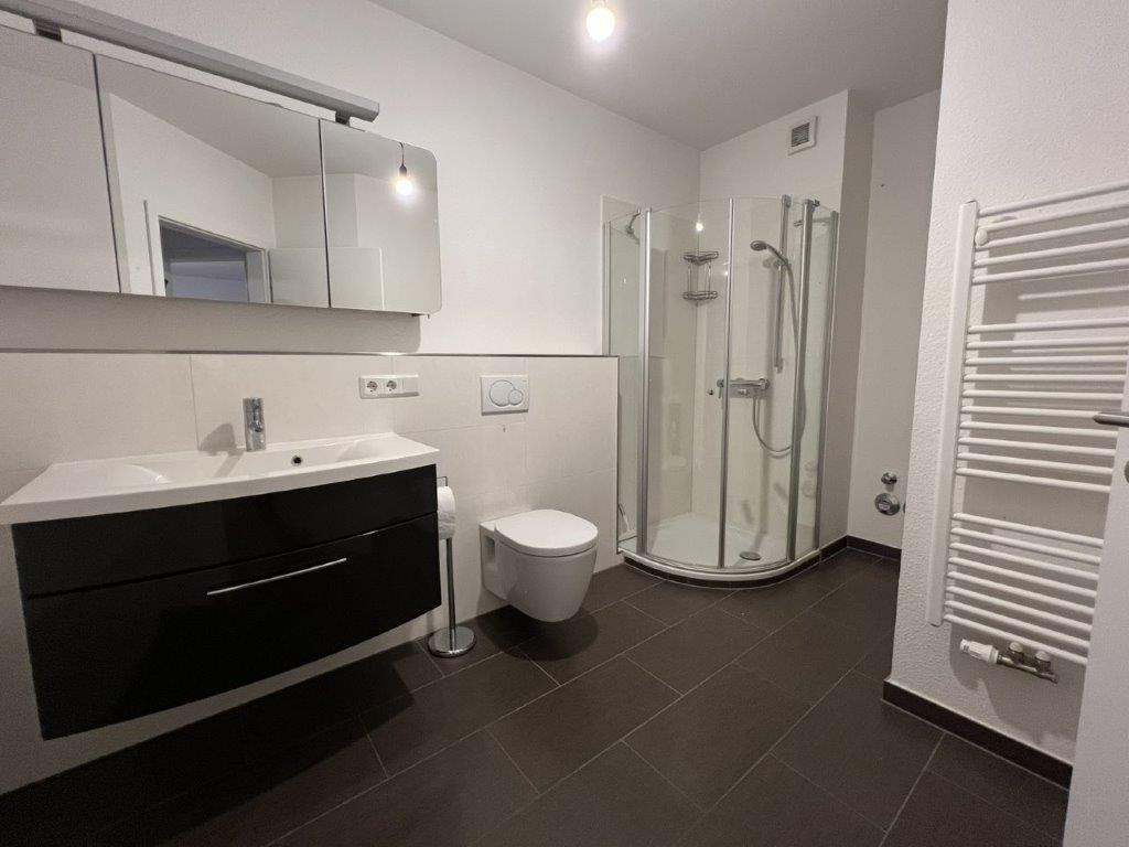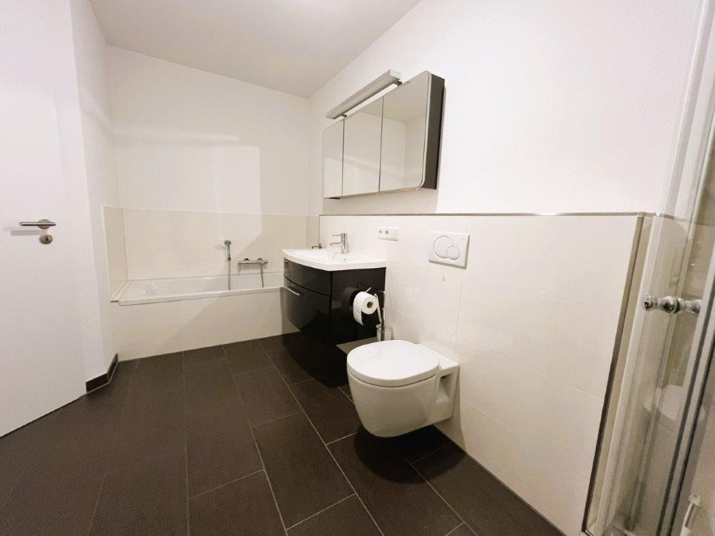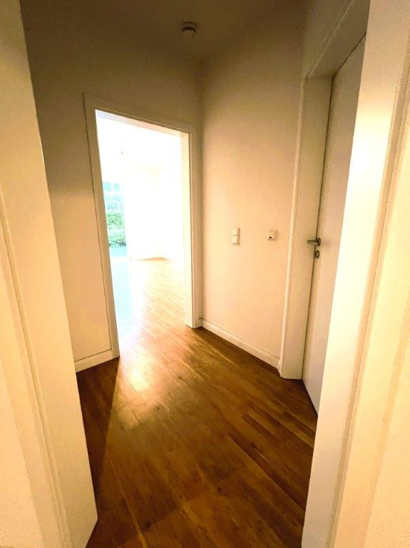 Ein kleiner Vorflur weist Ihnen den Weg in das Schlafzimmer sowie in das großzügige Badezimmer der Wohnung. Letzteres verfügt über eine Badewanne, einen großen Waschtisch mit Unterschrank und Spiegelschrank, ein wandhängendes WC, eine niedrigschwellige Dusche und Anschlussmöglichkeiten für Waschmaschine und Trockner. Zusätzlich zu der in der gesamten Wohnung vorhandenen und wohlige Wärme verbreitenden Fußbodenheizung ist hier auch ein Handtuchheizkörper vorhanden. Das benachbarte Schlafzimmer, hell und freundlich, besitzt ebenfalls Zugang zur Terrasse.