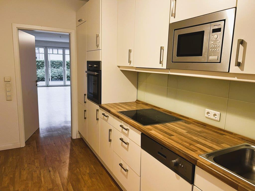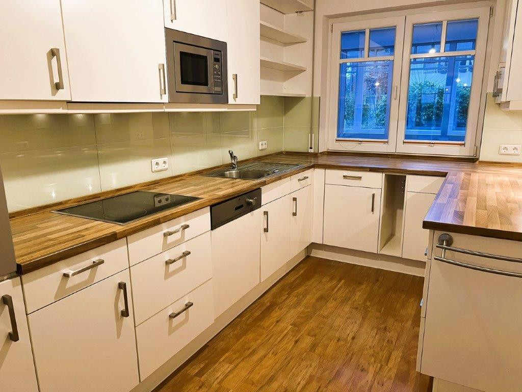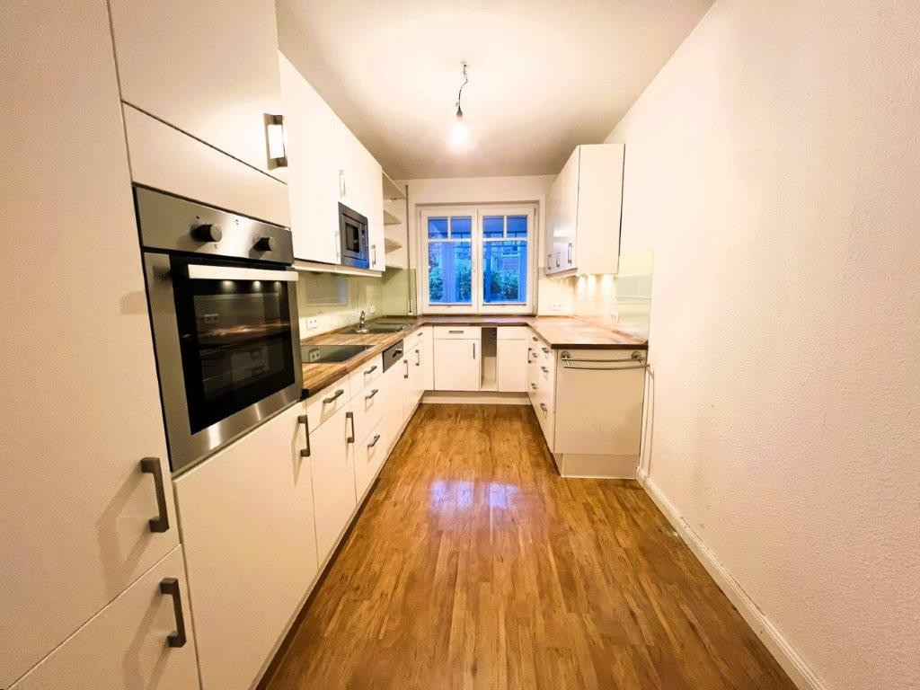 Dem Raum vorgelagert ist die üppig bemessene, mit Granitplatten belegte Südterrasse, die Ihnen sonnige und erholsame Stunden verspricht. Sie ist umsäumt von Heckenrosen und Koniferen und bietet Ihnen somit ein hohes Maß an Privatsphäre. Wenn Sie es etwas schattiger bevorzugen, steht Ihnen eine 7 m breite, elektrisch betriebene Markise zur Verfügung. Auch ein Außenwasseranschluss ist auf der Terrasse vorhanden. Aus dem Wohn-Ess-Bereich gelangen Sie direkt in die Küche, ebenfalls mit Blick in das Atrium. Sie ist mit einer zeitlosen, hellen Einbauküche versehen. Zahlreiche Ober- und Unterschränke sorgen für ausreichend Stauraum. Ein hochgesetzter Backofen, ein großer Kühlschrank, ein Ceranfeld, eine Mikrowelle und ein Geschirrspüler bieten alle Möglichkeiten zum Ausleben Ihrer Kochkünste.