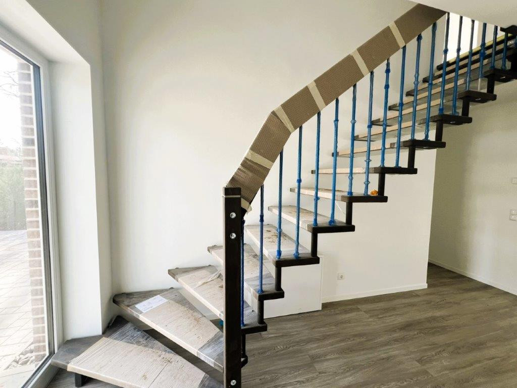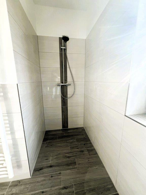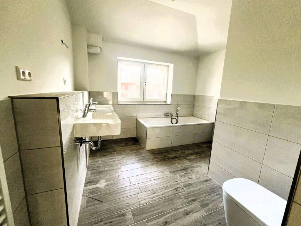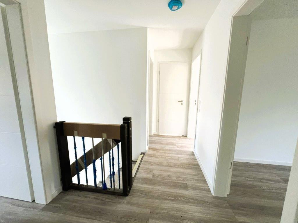 Über eine offene Holztreppe gelangen sie in das Obergeschoss. Hier warten vier Zimmer auf ihre individuelle Nutzung. Das Hauptschlafzimmer verfügt zusätzlich über einen angegliederten Ankleidebereich und bietet einen schönen Blick ins Grüne. Auch im großzügigen Badezimmer werden Sie sich wohlfühlen. Mit zwei Waschtischen, einer Badewanne, einer bodengleichen Dusche, einem WC und einem Handtuchheizkörper ist es umfangreich ausgestattet. Zusätzlich ist auf dieser Ebene ein Abstellraum vorhanden. Weiteren Stauraum finden Sie auf den kleinen Dachboden. Alle Wände und Decken des Hauses sind glatt gespachtelt und weiß gestrichen. Die dreifach verglasten Fenster verfügen allesamt über elektrisch betriebene Rollläden. Als Bodenbelag fand hochwertiger Design-Vinylbelag Verwendung. Die Fußbodenheizung ist raumweise regelbar und sorgt in Verbindung mit der kontrollierten Be- und Entlüftungsanlage für niedrige Heizkosten.