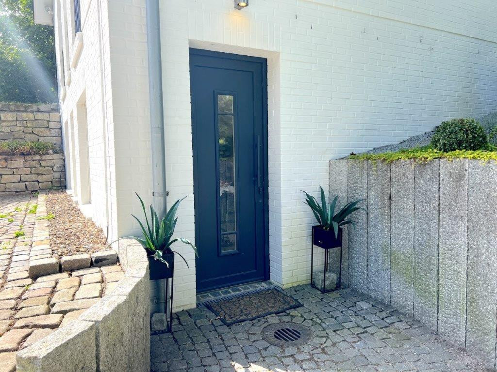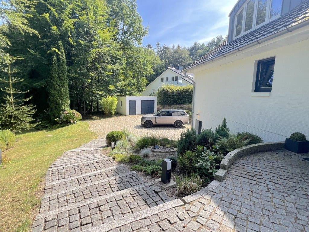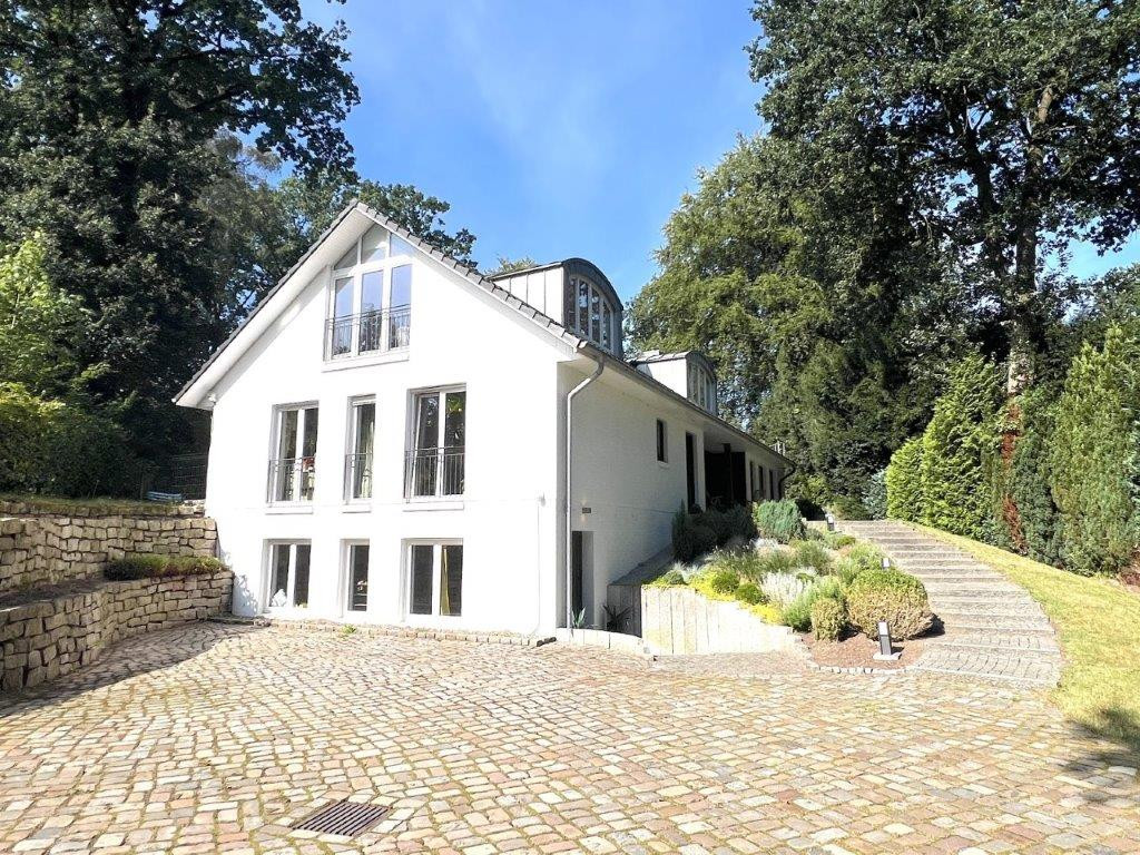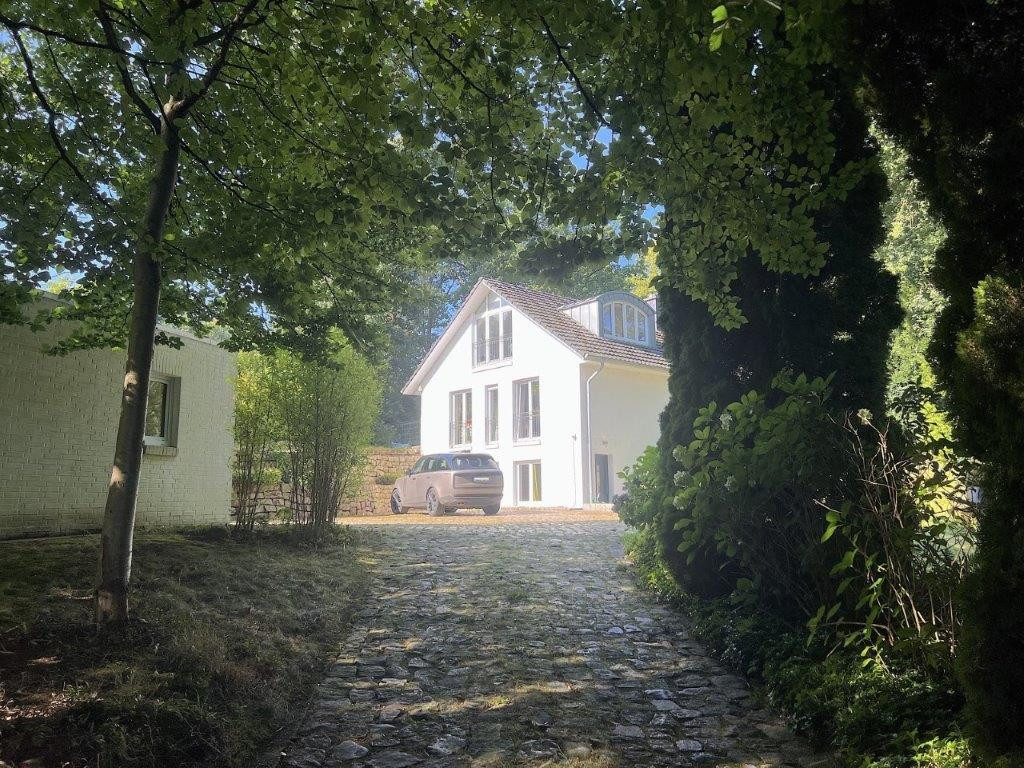 Durch das elektrische Tor erreichen Sie über eine geschwungene, mit Kopfsteinpflaster versehene Auffahrt Ihr neues Zuhause. Linker Hand befindet sich ein separates Garagengebäude mit Platz für ein Fahrzeug und einem separaten Werkraum. Weitere Fahrzeuge finden auf dem großen Vorplatz des Hauses ihren Platz. Geradezu erstrahlt das Gebäude mit seiner hell gestrichenen Klinkerfassade. Der Ursprungsbau stammt aus dem Jahr 1961. Er wurde im Jahr 2008 umfangreich erweitert und sowohl dann als auch fortlaufend regelmäßig modernisiert. Eine Natursteintreppe führt Sie entlang abwechslungsreicher Bepflanzung zu dem Eingangsportal, welches auch eine kleine Terrasse umfasst.