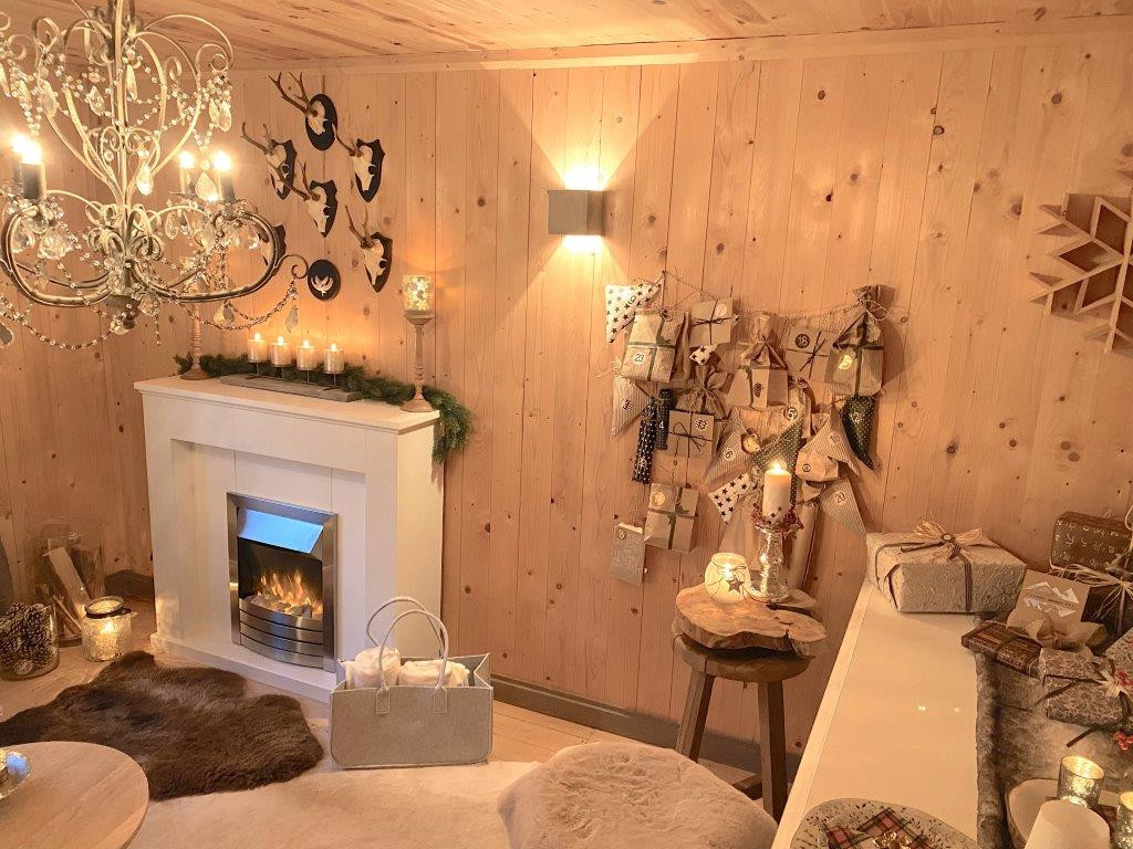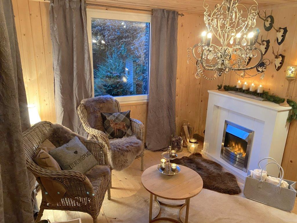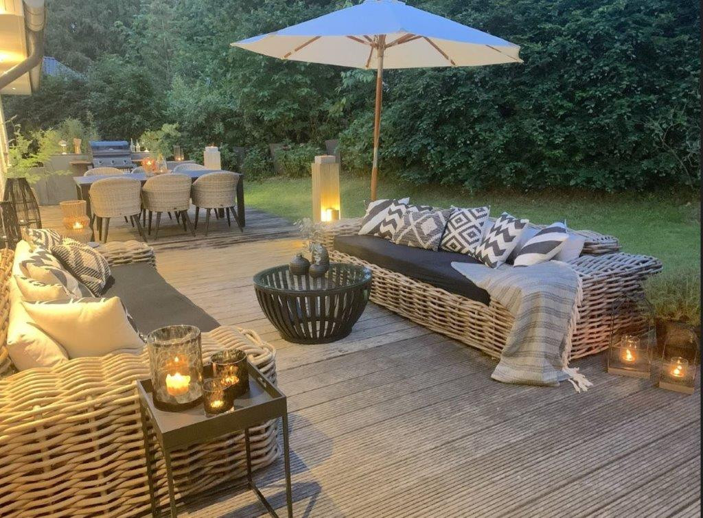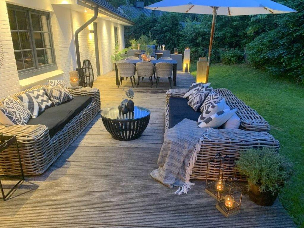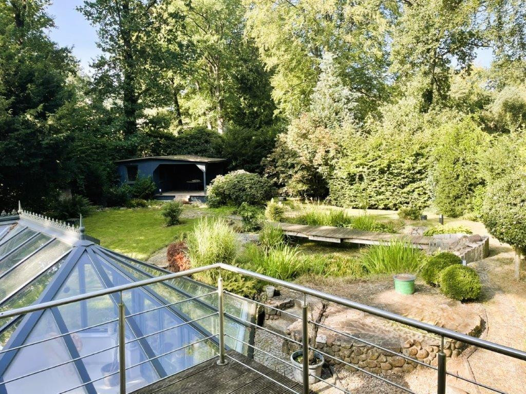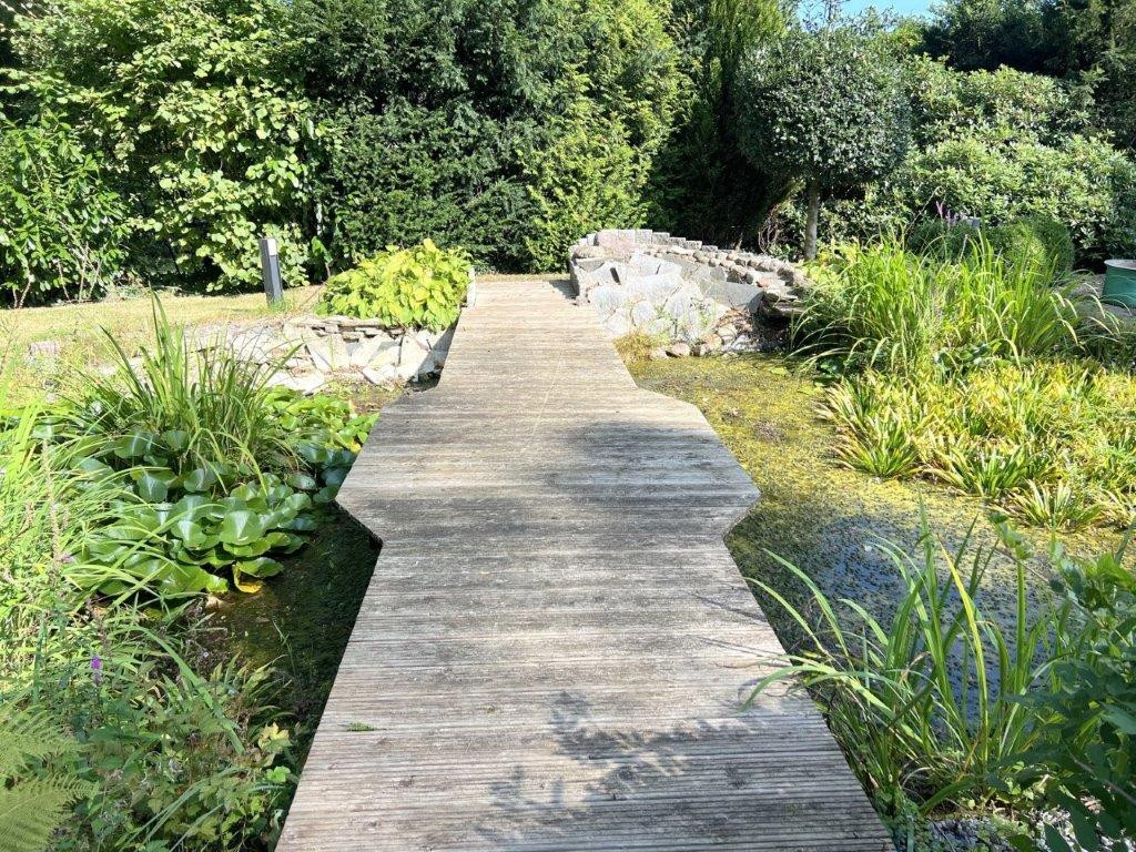 Ebenfalls über das Wohn-Esszimmer haben Sie Zugang zur großzügigen, mit Holzdielen versehenen Südterrasse sowie dem vorgelagerten Garten. Neben Rasenflächen und unterschiedlichen Gehölzen umfasst dieser verschiedene weitere Sitzmöglichkeiten sowie einen Gartenteich mit Brücke. Im hinteren Bereich befindet sich ein Blockhaus, dass im Berghüttenstil eingerichtet ist und über eine weitere Terrasse verfügt.