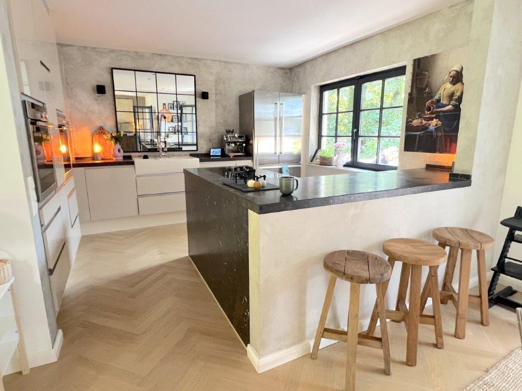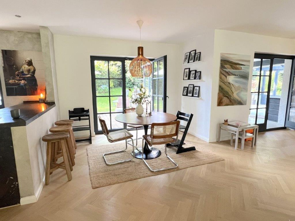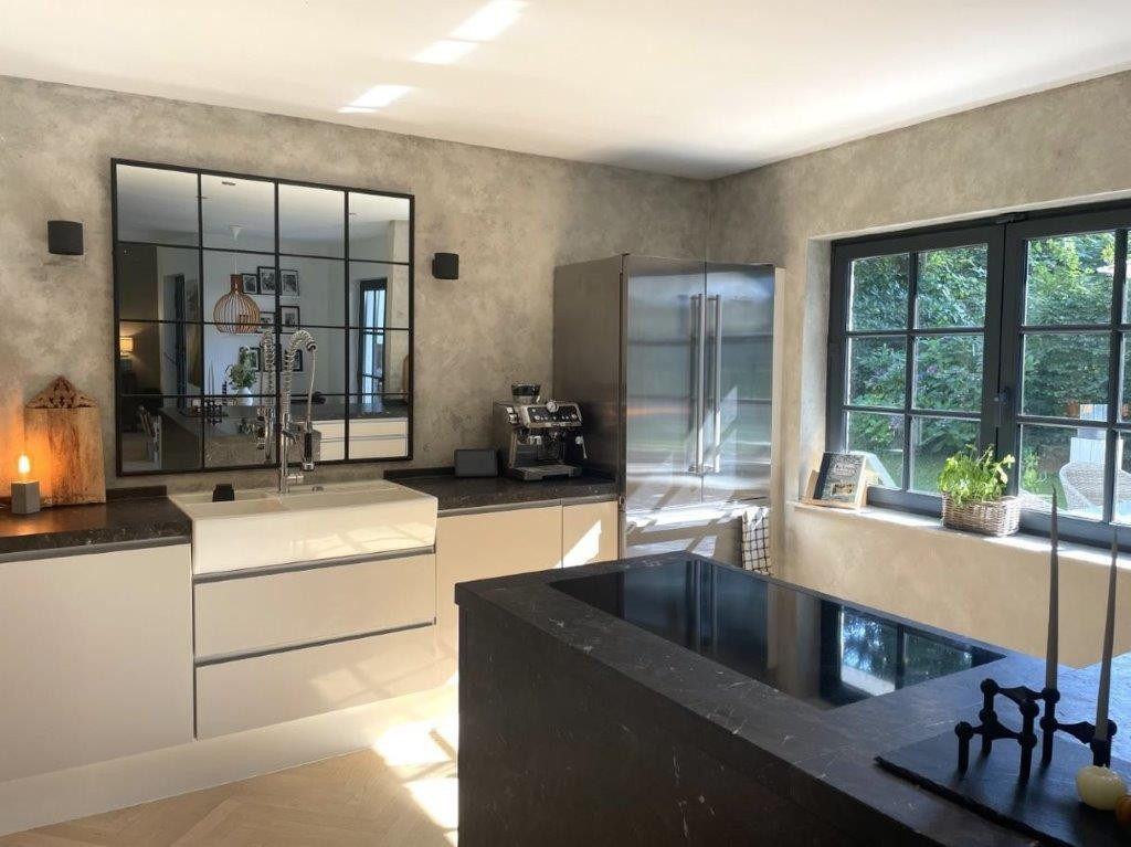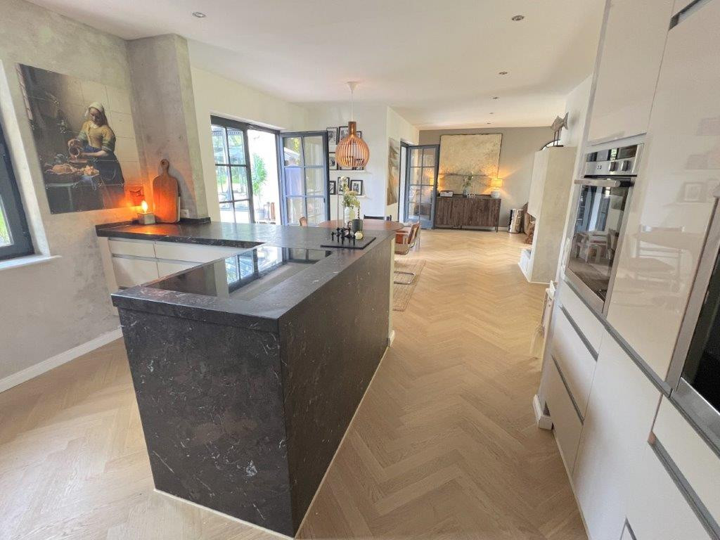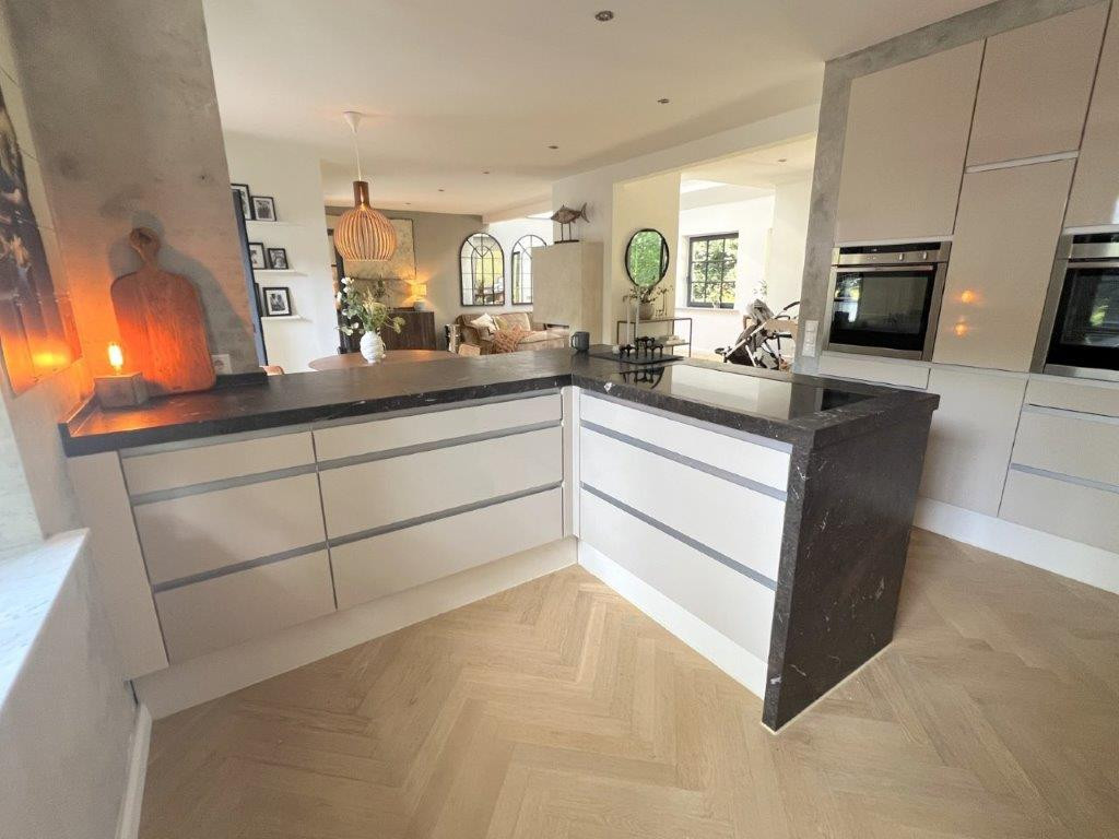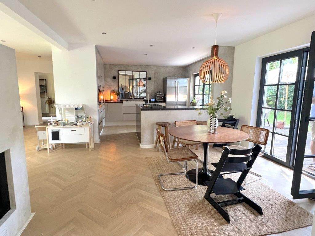 Sie betreten das Haus und erreichen von der Diele aus rechts den großzügigen Wohn-Essbereich. Er wurde in Teilen bis unter das Dach geöffnet, mit zahlreichen Dachflächenfenstern versehen und bietet somit ein außergewöhnliches Maß an Helligkeit. Der hochwertig im Fischgratmuster verlegte Parkettboden und die installierte Fußbodenheizung verströmen eine wohlige Atmosphäre. Der zentral angeordnete Kaminofen strahlt nicht nur Gemütlichkeit aus, sondern ist auch an das Heizungssystem angeschlossen. Eine hochwertige zum Essbereich offene Küche lässt mit ihren zahlreichen Auszügen, dem großen Apothekerschrank, der massiven Natursteinarbeitsplatte sowie der hochwertigen Geräteausstattung (zwei hochgesetzte Backöfen, großes Induktionskochfeld, Mikrowelle, Geschirrspüler und Kühl-Gefrierkombination) keine Wünsche offen und bietet Ihnen alle Möglichkeiten zum Ausleben Ihrer Kochkünste.