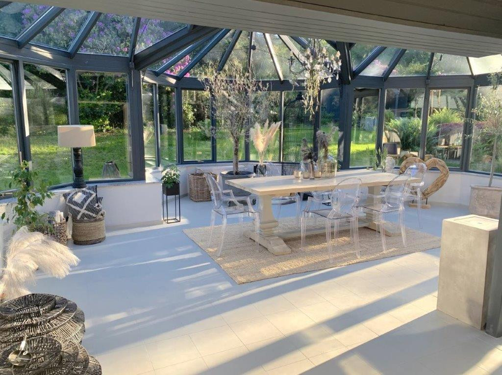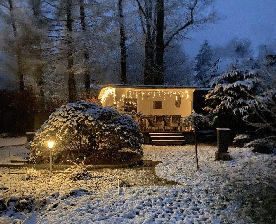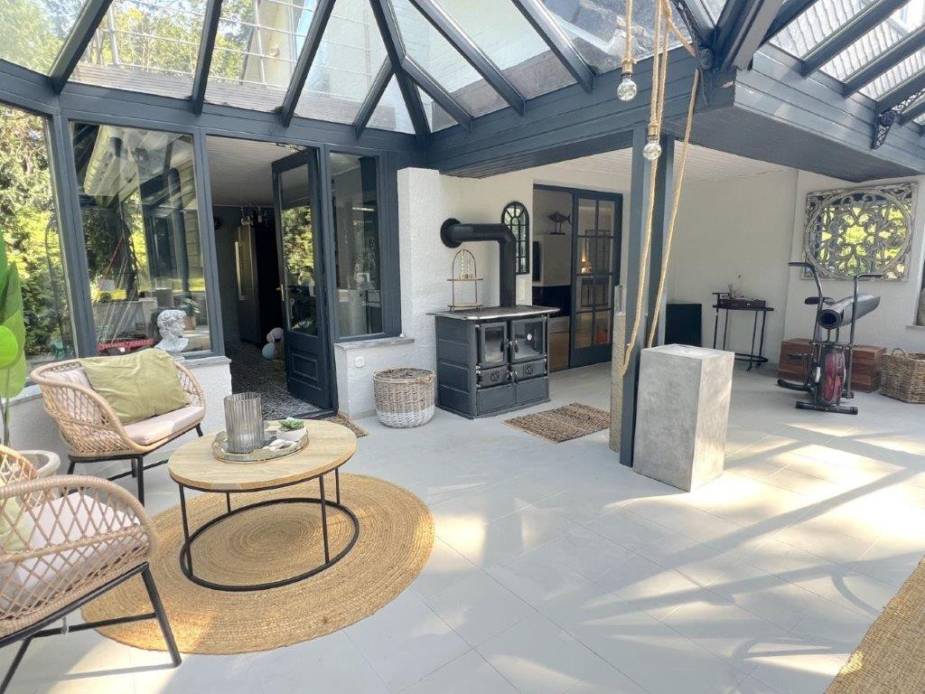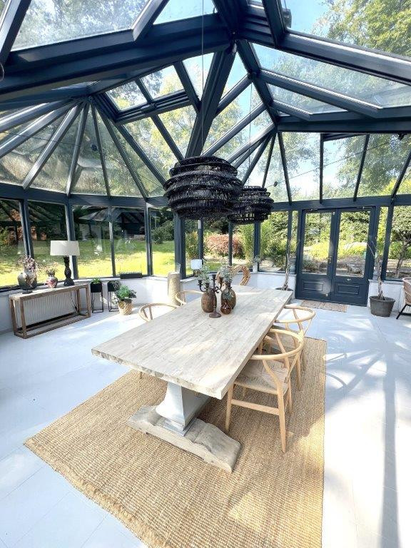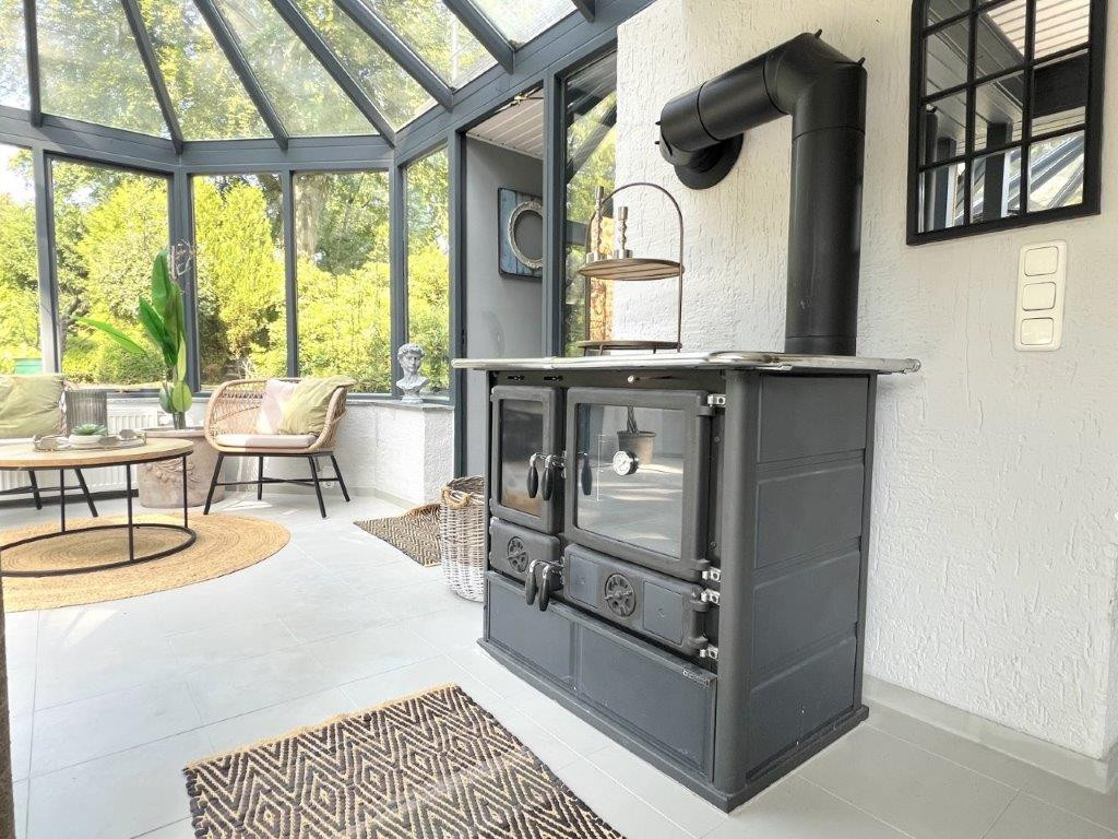 Eine zweiflüglige Tür führt Sie in den beeindruckenden, fast 50 m² großen Wintergarten im viktorianischen Stil mit tollem Blick in den Garten. Hier befindet sich auch ein voll funktionsfähiger historischer Herd, der zum Kochen, Backen oder einfach als Kaminofen für kuschelige Stunden verwendet werden kann. Ein Nebenraum bietet Möglichkeiten zur Lagerung oder Vorbereitung.