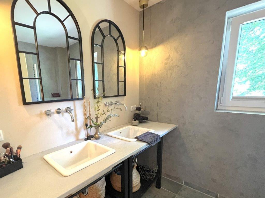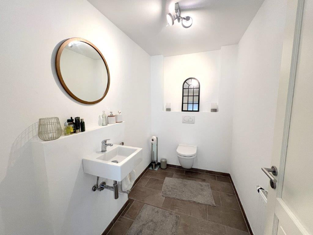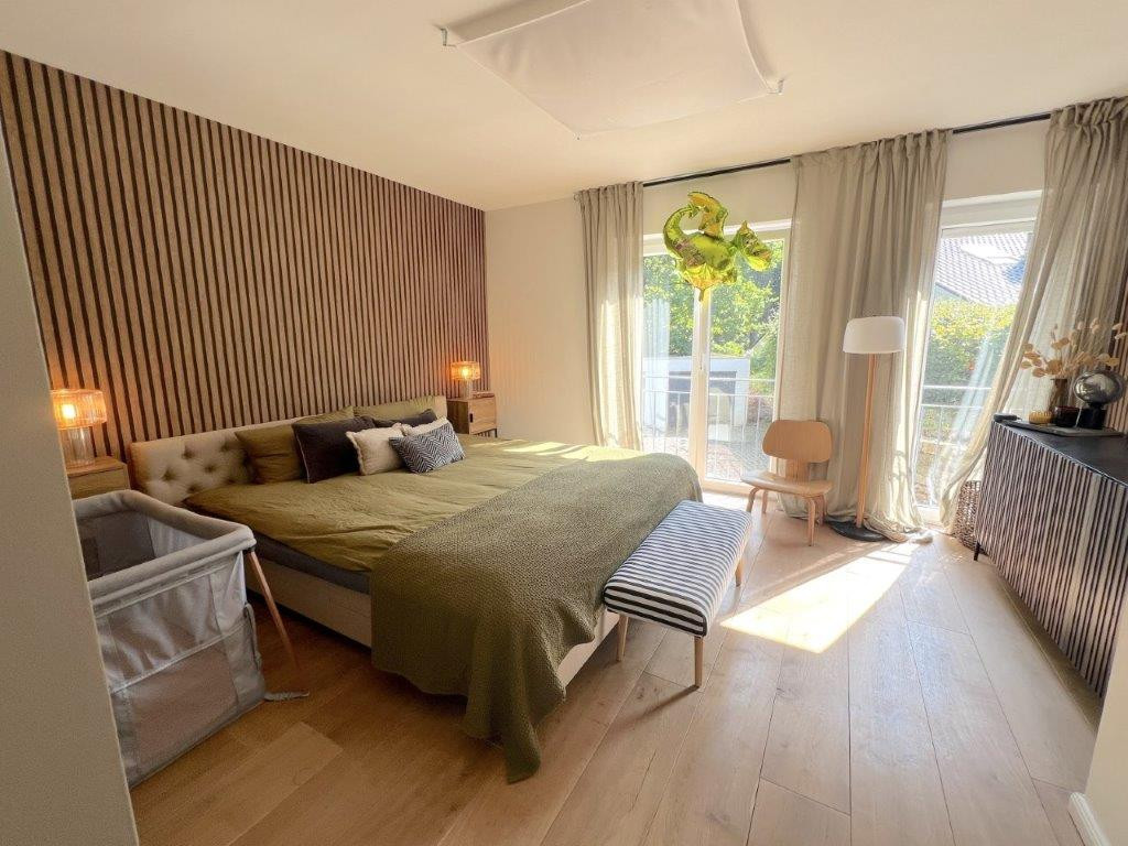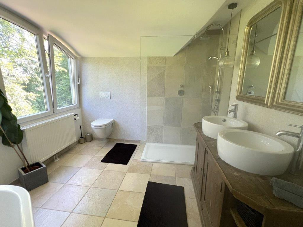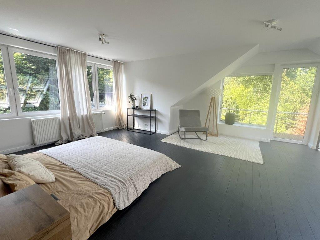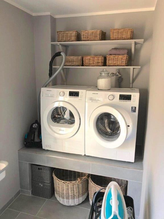 Von der anfänglich erwähnten Diele linker Hand erreichen Sie das geschmackvoll gestaltete Badezimmer dieser Ebene. Es bietet Ihnen einen Doppelwaschtisch, ein WC, eine Dusche und einen Handtuchheizkörper. Die elektrische Fußbodenerwärmung schützt Sie vor kalten Überraschungen. Die beiden benachbarten Zimmer verfügen ebenso wie die Diele über großzügige Eichendielen sowie bodentiefe Fenster und somit ein angenehmes Maß an Helligkeit. Ein Hauswirtschaftsraum mit Anschlüssen für Waschmaschine und Trockner rundet das Raumangebot dieser Ebene ab.