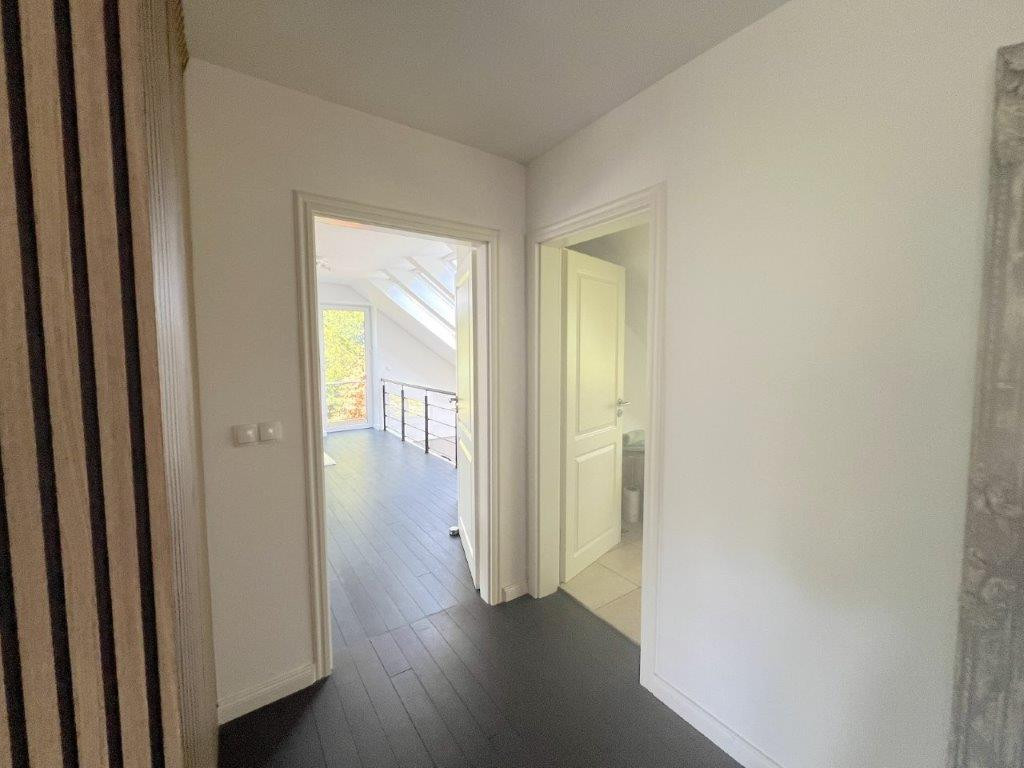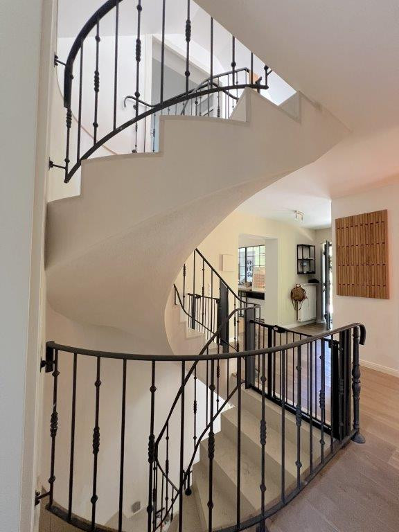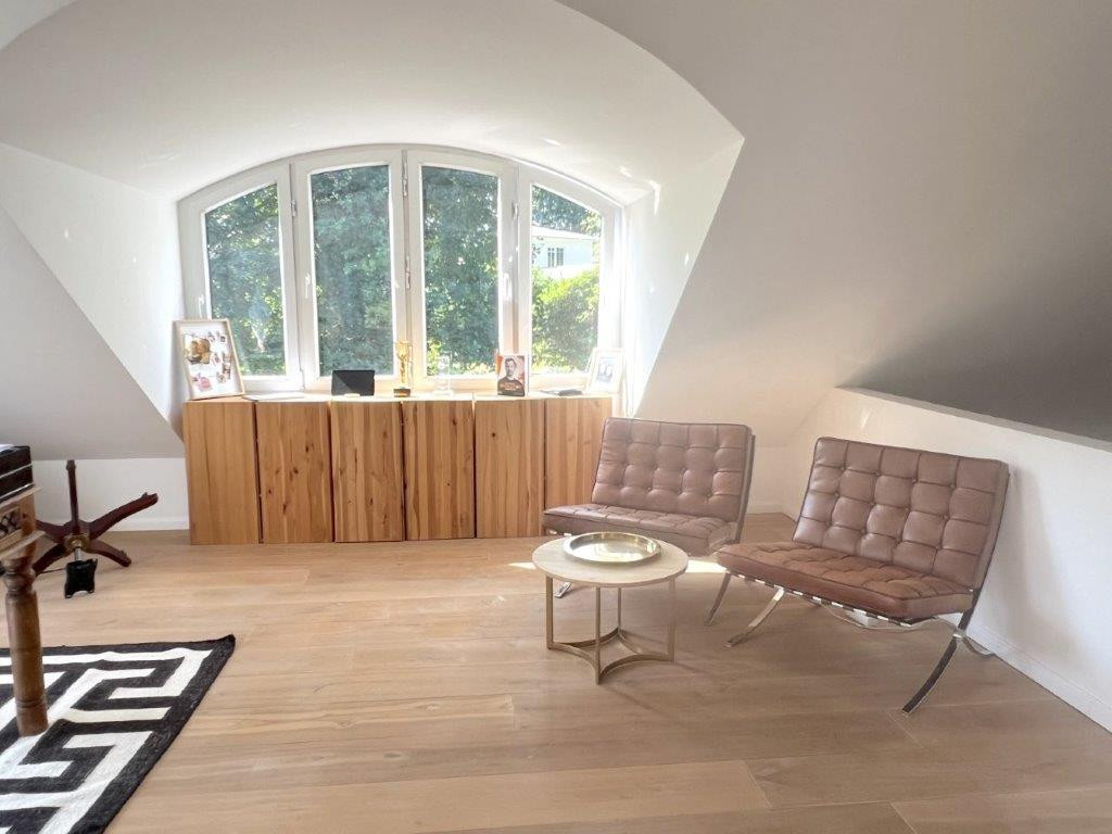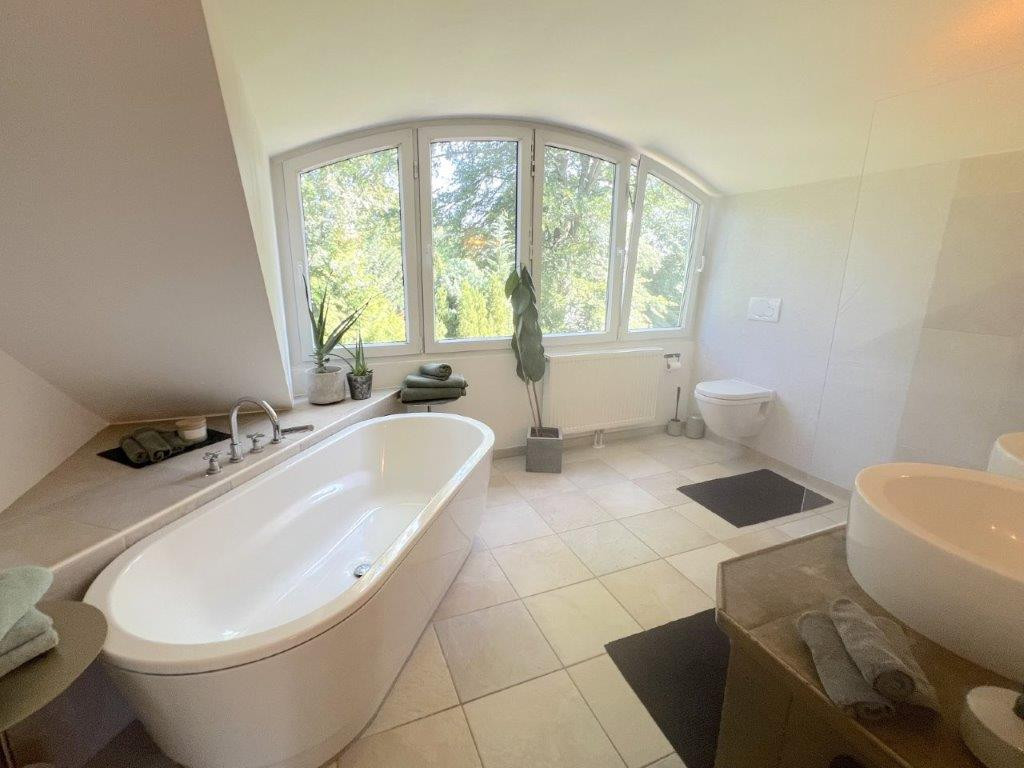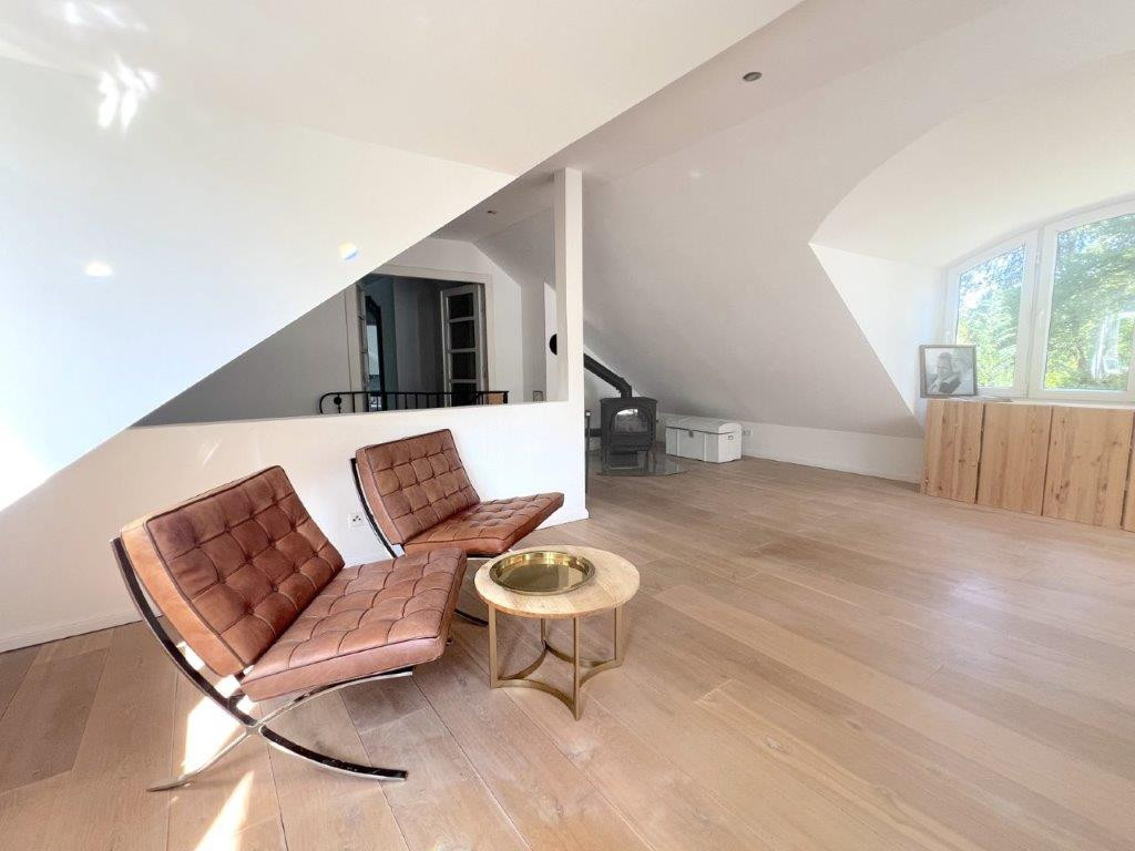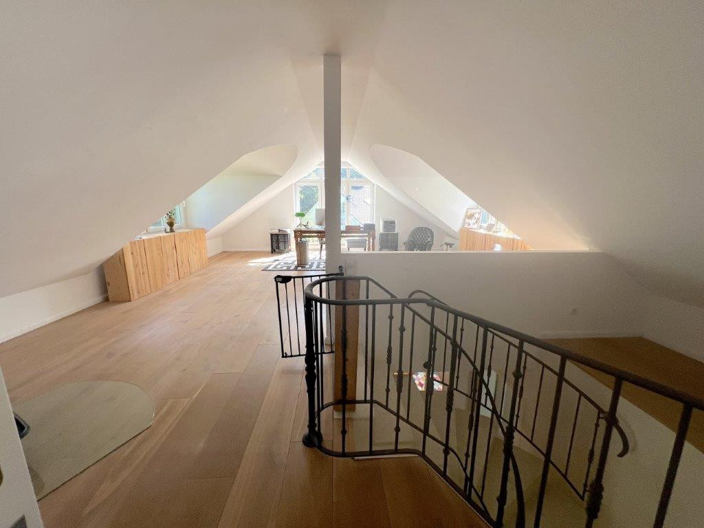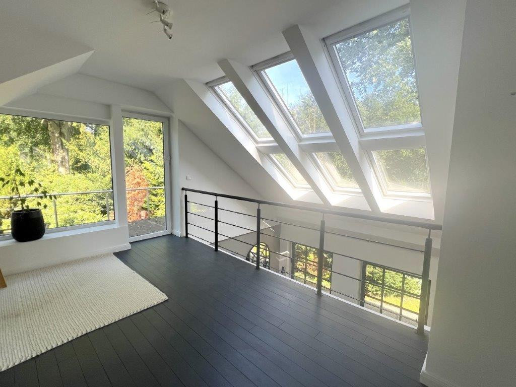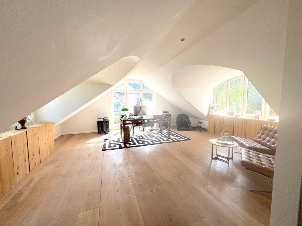 Eine gewendelte Marmortreppe führt Sie in das Obergeschoss. Dort empfängt Sie zunächst ein großzügiges Studio mit verglastem Erker sowie zwei großen Rundgauben. Auch hier ist ein kleiner Kaminofen verbaut sowie der aus dem Erdgeschoss bekannte Dielenboden verlegt. Vom Studio aus gelangen Sie in ein zurzeit als weitläufiges Ankleidezimmer genutzten Raum, von dem sowohl ein Abstellraum als auch das Badezimmer dieser Etage abzweigen. Letzteres ist mit einer großen Dusche, einem Doppelwaschtisch, einem WC sowie einer freistehenden Badewanne und einem Handtuchheizkörper ausgestattet. Das Raumangebot dieser Ebene komplettiert ein ausgedehntes Galeriezimmer mit Fensterfront zum Garten sowie offener Brüstung zum Wohn-Essbereich. Ihm vorgelagert ist ein großer Westbalkon, der Ihnen entspannte Stunden in der Abendsonne mit Blick auf den Teich bietet.