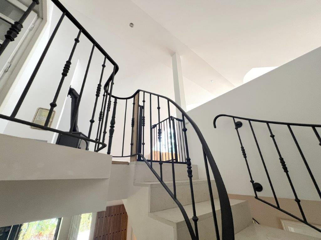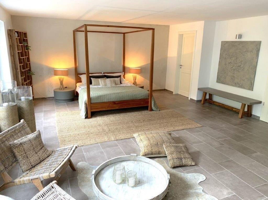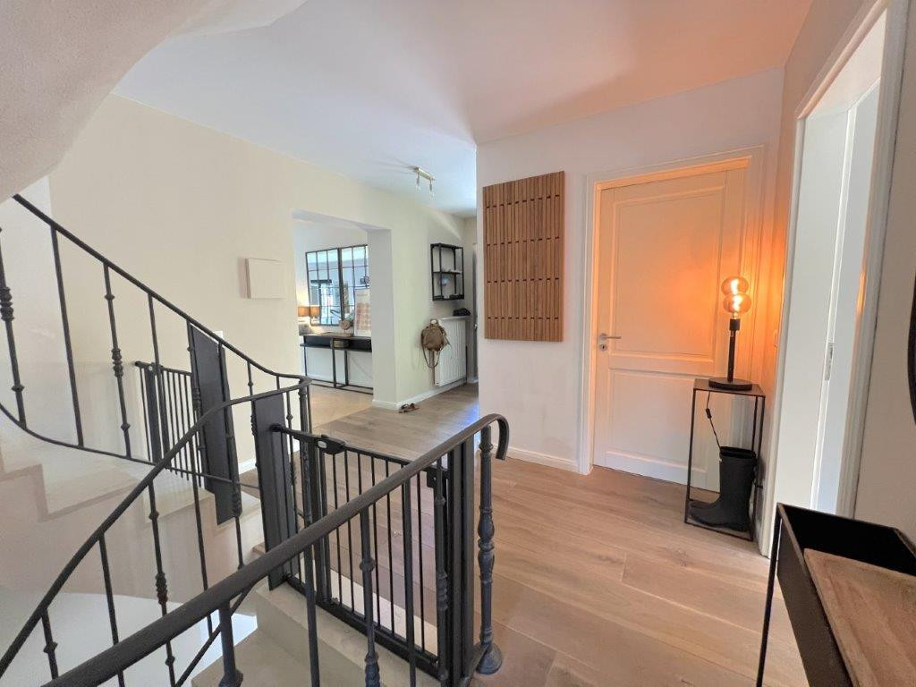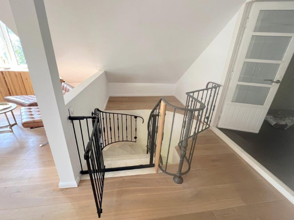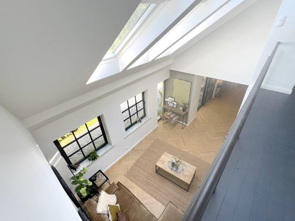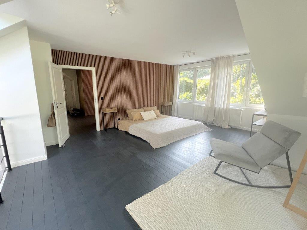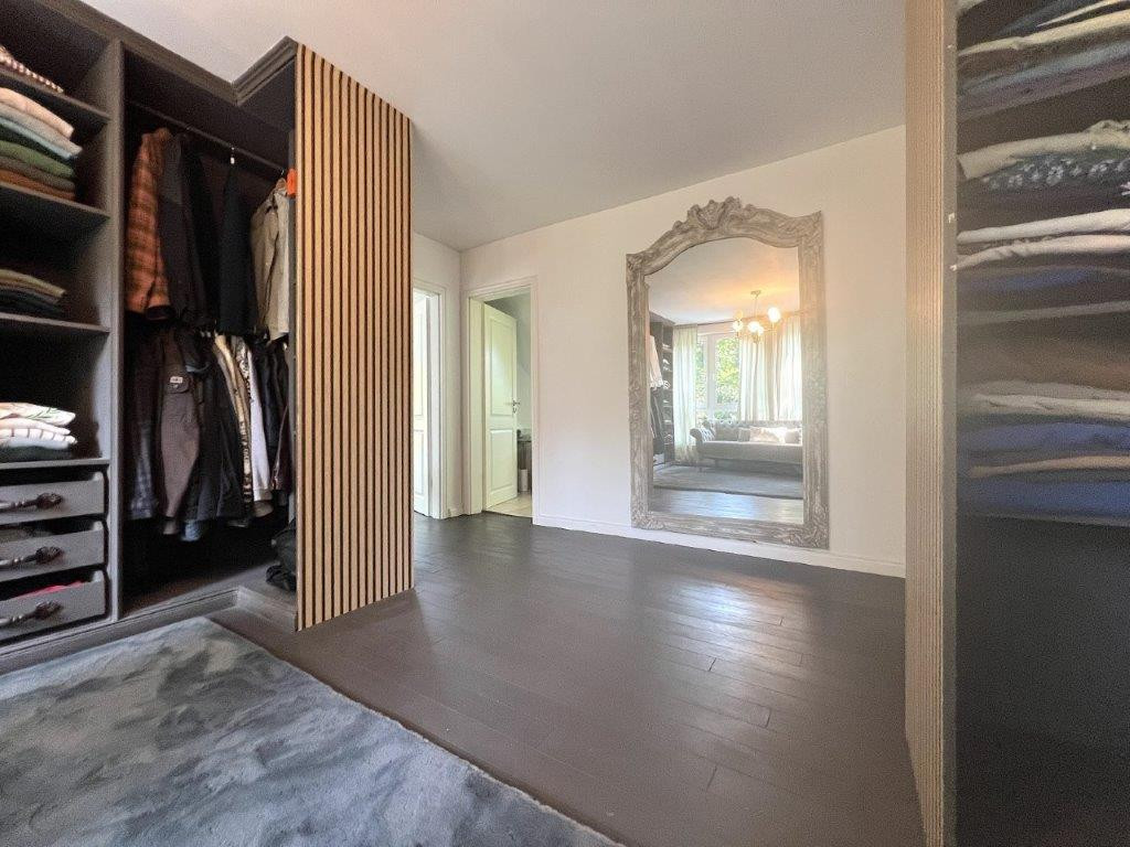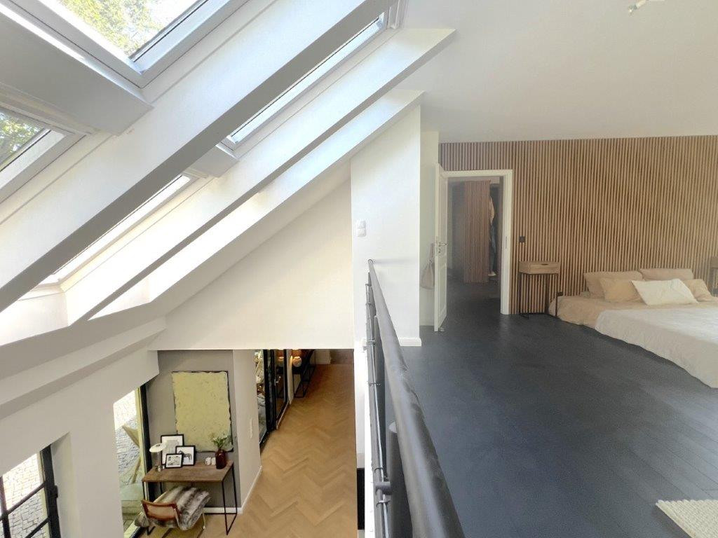 Eine gewendelte Marmortreppe führt Sie in das Obergeschoss. Dort empfängt Sie zunächst ein großzügiges Studio mit verglastem Erker sowie zwei großen Rundgauben. Auch hier ist ein kleiner Kaminofen verbaut sowie der aus dem Erdgeschoss bekannte Dielenboden verlegt. Vom Studio aus gelangen Sie in ein zurzeit als weitläufiges Ankleidezimmer genutzten Raum, von dem sowohl ein Abstellraum als auch das Badezimmer dieser Etage abzweigen. Letzteres ist mit einer großen Dusche, einem Doppelwaschtisch, einem WC sowie einer freistehenden Badewanne und einem Handtuchheizkörper ausgestattet. Das Raumangebot dieser Ebene komplettiert ein ausgedehntes Galeriezimmer mit Fensterfront zum Garten sowie offener Brüstung zum Wohn-Essbereich. Ihm vorgelagert ist ein großer Westbalkon, der Ihnen entspannte Stunden in der Abendsonne mit Blick auf den Teich bietet.