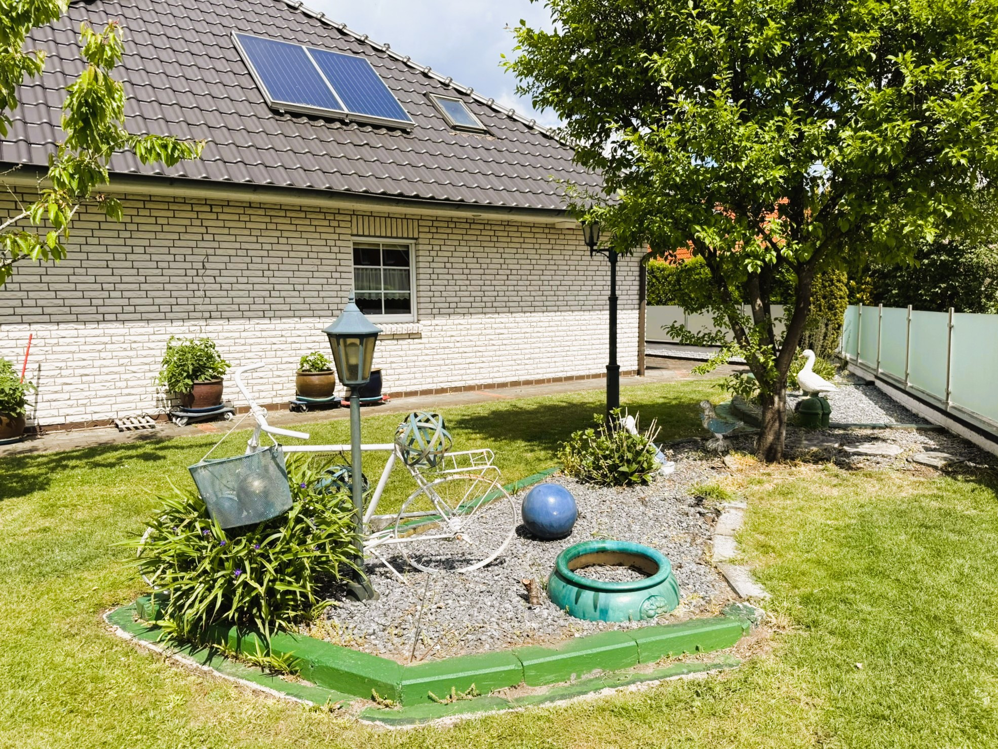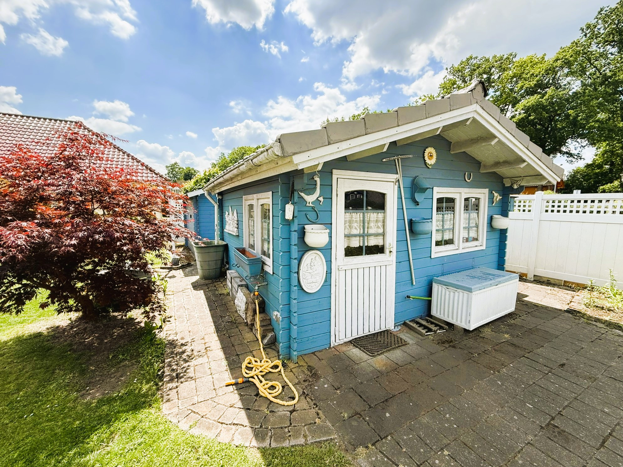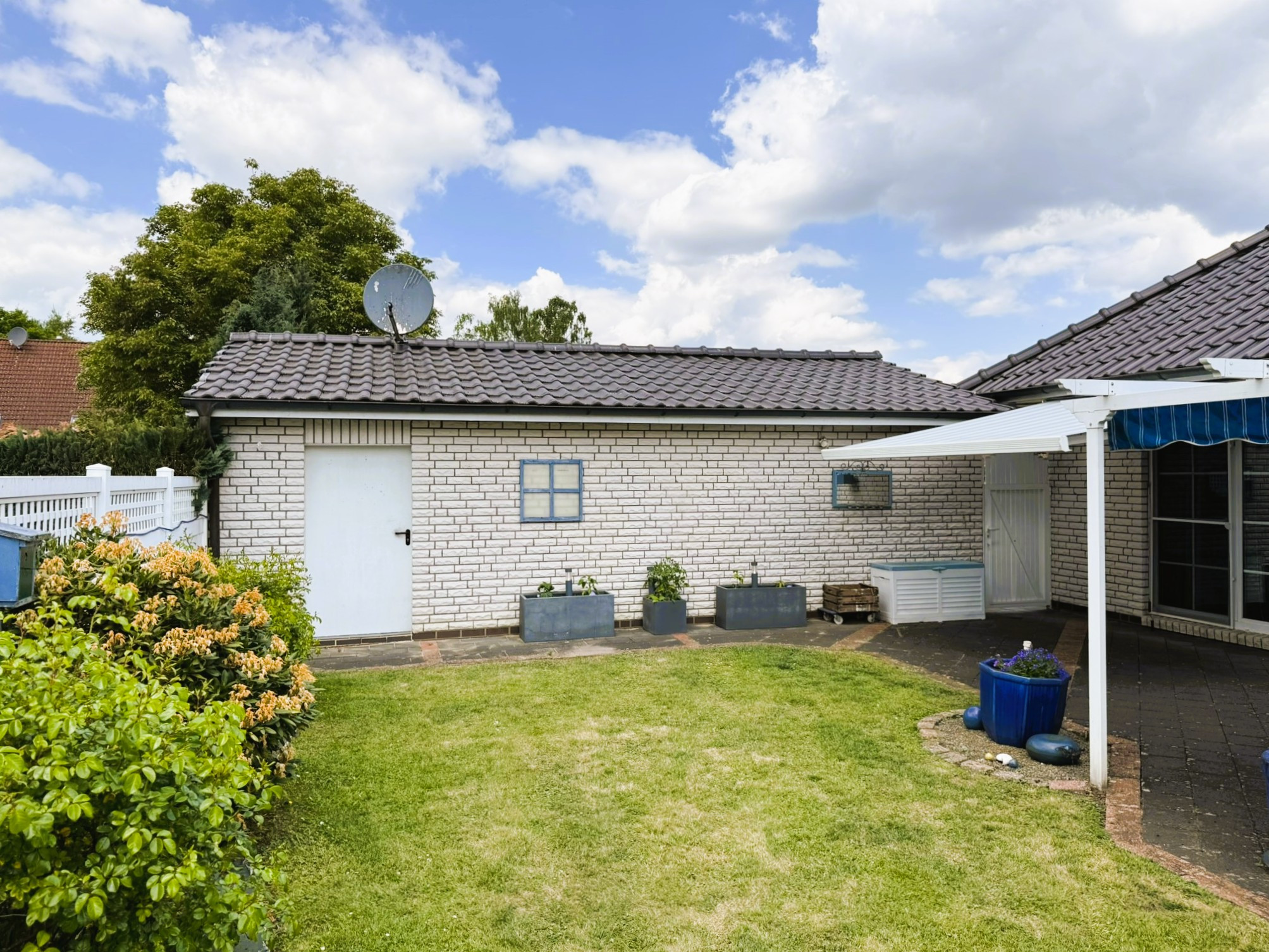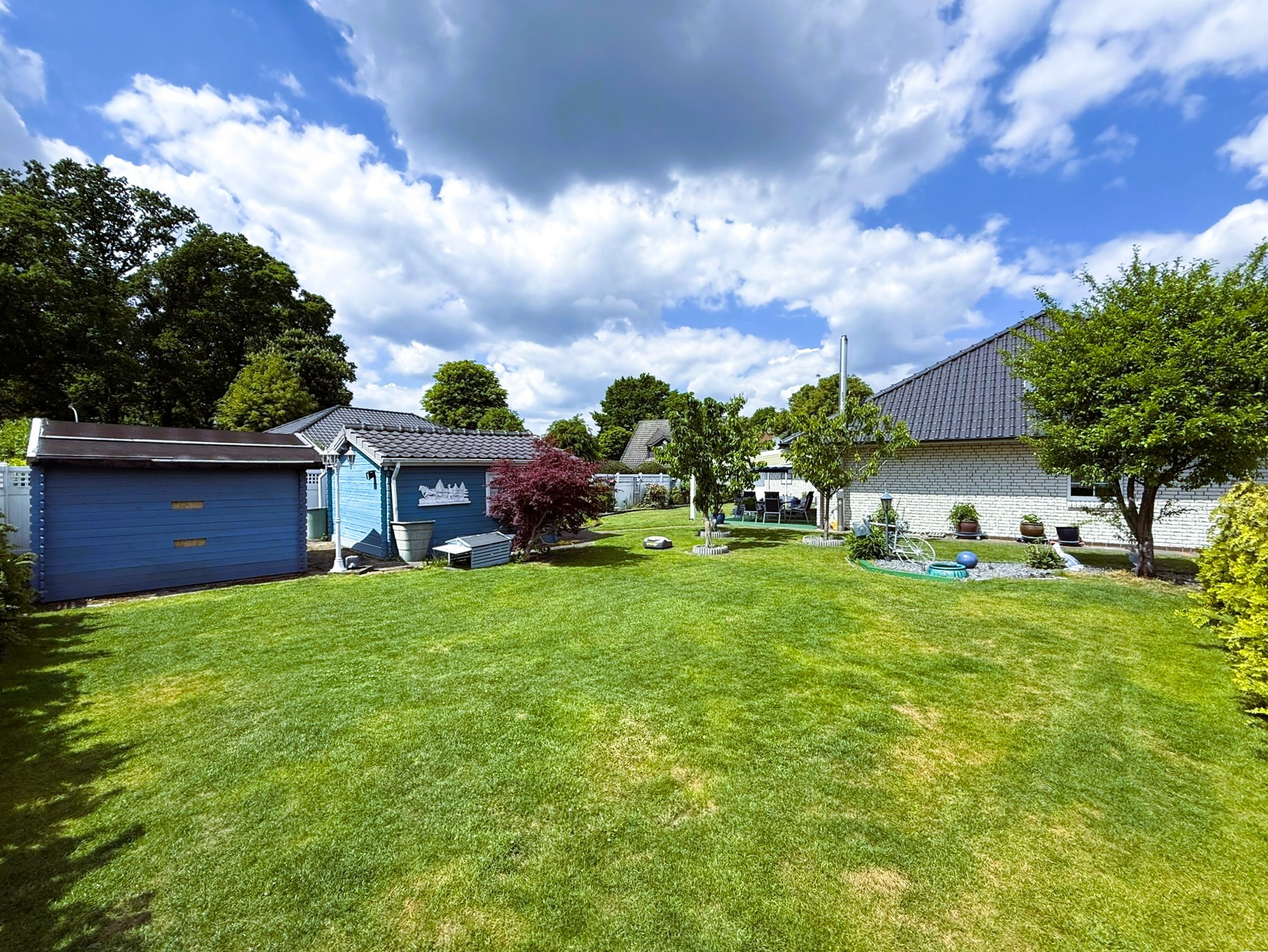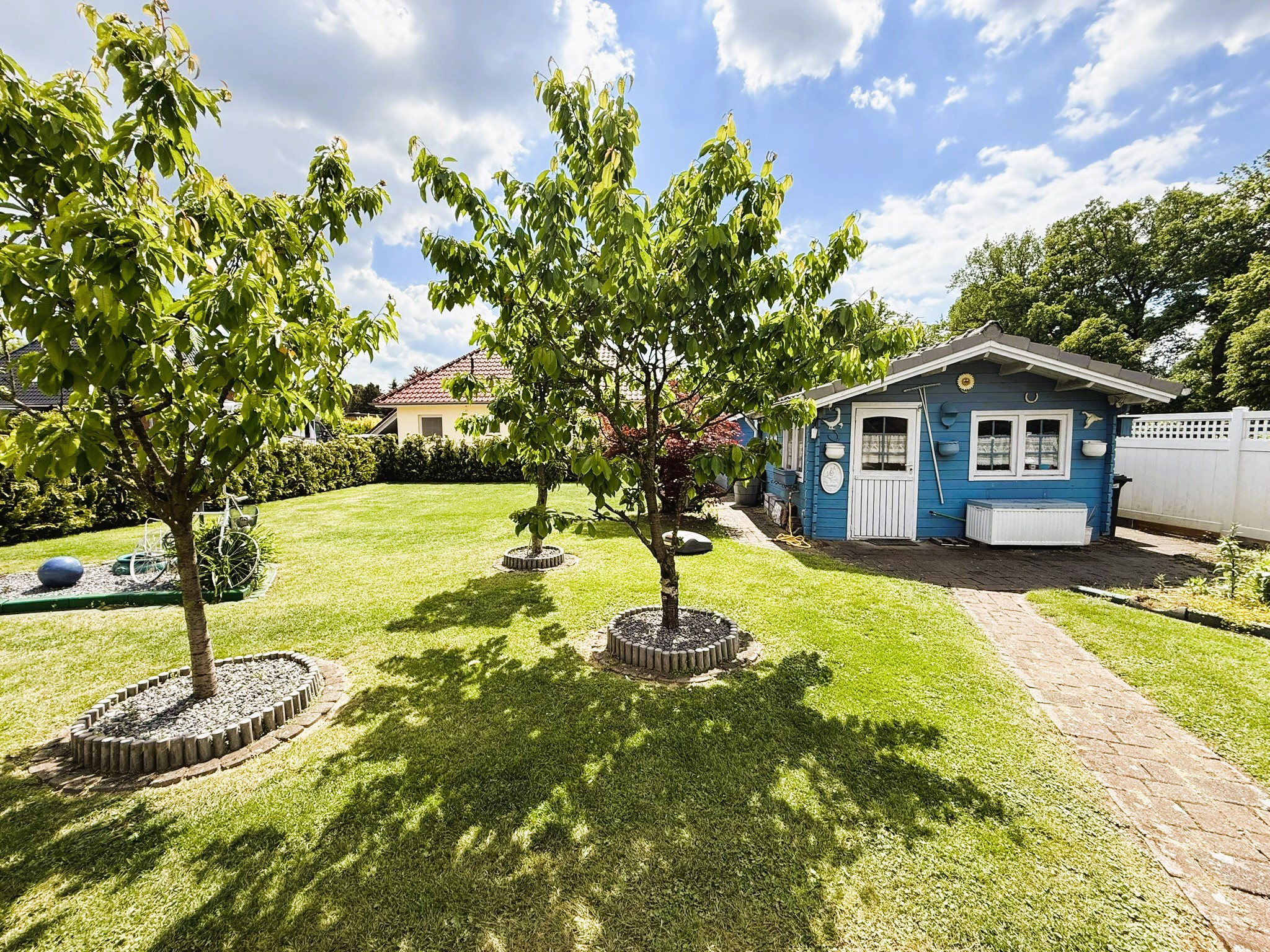 Es besteht die Möglichkeit, das Haus vollständig eingerichtet mit allem Drum und Dran zu übernehmen. Sie müssen in diesem Fall nur noch einziehen. Der Garten wurde pflegeleicht und dennoch abwechslungsreich angelegt. Zwei Gartenhäuser gestatten vielfältige Nutzungsmöglichkeiten. Der Glaszaun zur Straße wurde erst kürzlich neu gesetzt. Ihr Fahrzeug findet in der passend zum Haus weiß verblendeten Garage mit elektrischem Tor, Starkstromanschluss und separatem Abstellraum seinen Platz. Sollten weitere vorhanden sein, ist auch vor der Garage ausreichend gepflasterte Fläche vorhanden. Ob jung oder alt, wir sind der Meinung, dass diese Immobilie das Potenzial hat, für jeden zukünftigen Bewohner zum ganz persönlichen Lieblingsplatz zu werden. Lassen Sie sich diese Gelegenheit nicht entgehen und vereinbaren Sie Ihren Besichtigungstermin mit uns.