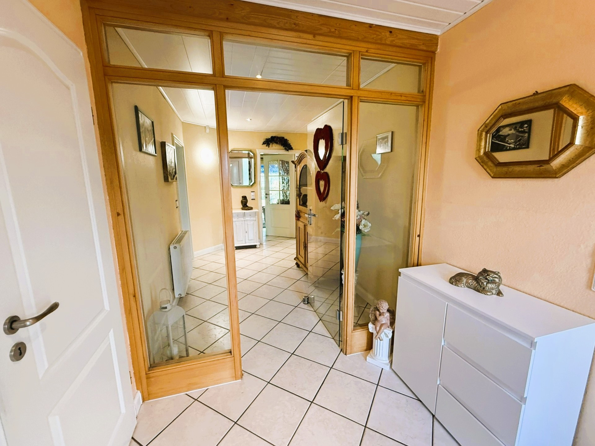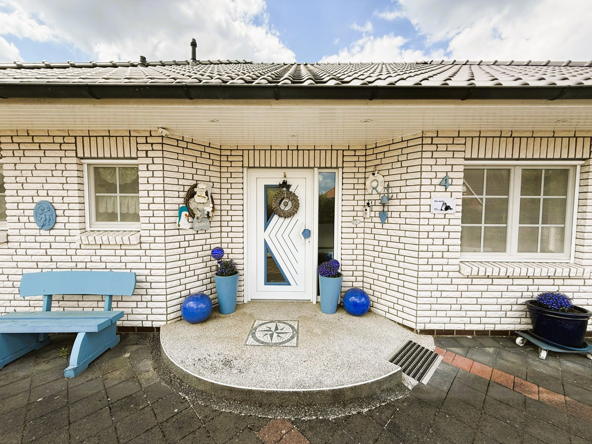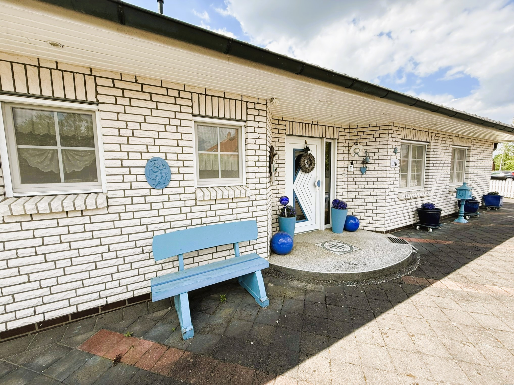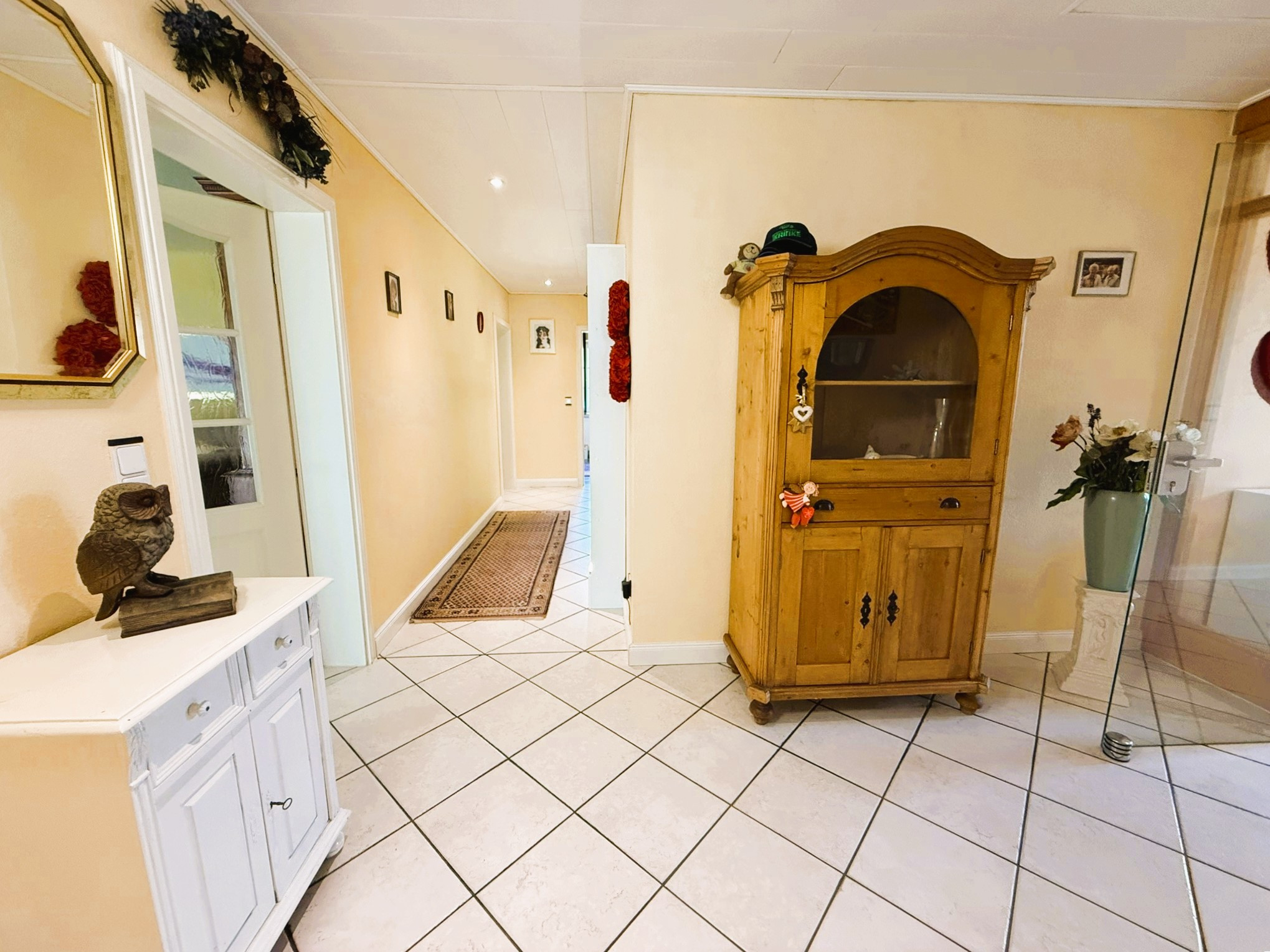 Dieser Bungalow wurde im Jahr 2000 auf einem 829 m² großem Eigenlandgrundstück individuell geplant und mit hochwertigen Materialien errichtet. Er verfügt derzeit über ca. 136 m² Wohnfläche. Der weiße Verblender und das anthrazitfarbene Walmdach verleihen ihm eine ansprechende, zeitlose Optik.Über ein geschmackvoll gestaltetes Eingangsportal erreichen Sie die etwas zurückversetzte, witterungsgeschützte Eingangstür und betreten den Windfang Ihres neuen Zuhauses. Linkerhand liegt das helle Gäste-Bad mit Waschtisch, WC, Dusche und Fenster. Durchschreiten Sie geradezu das Glaselement, befinden Sie sich im Flur, von dem alle weiteren Räume zu erreichen sind.