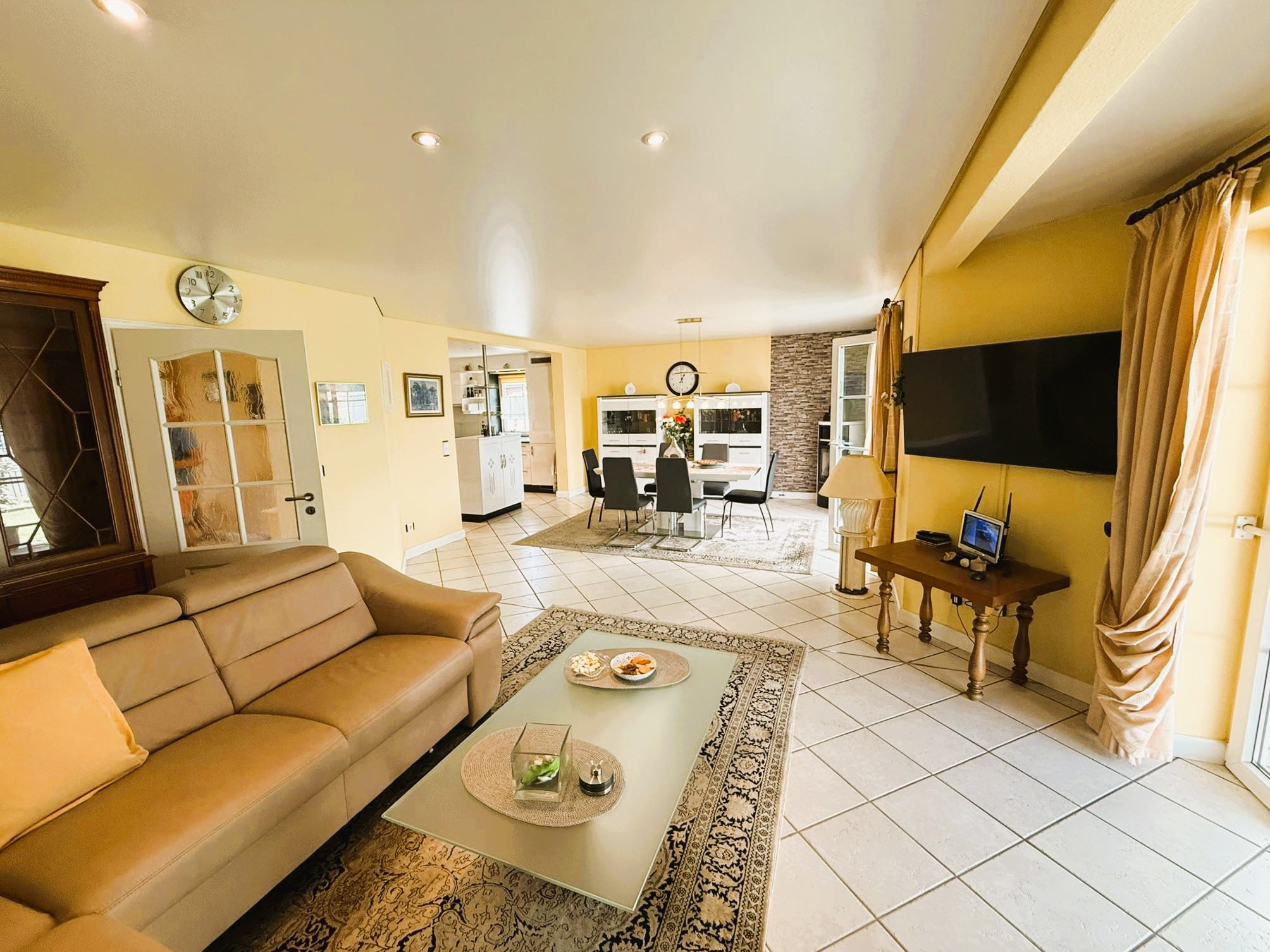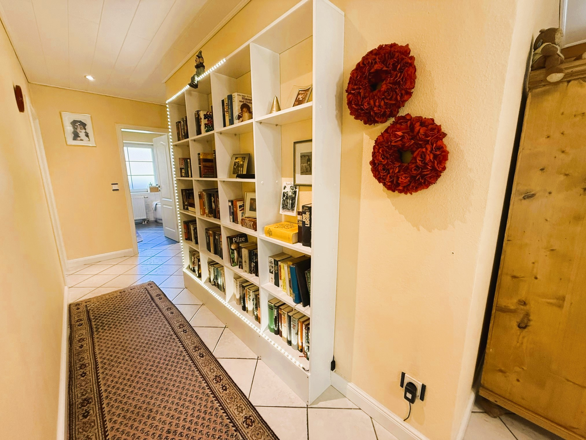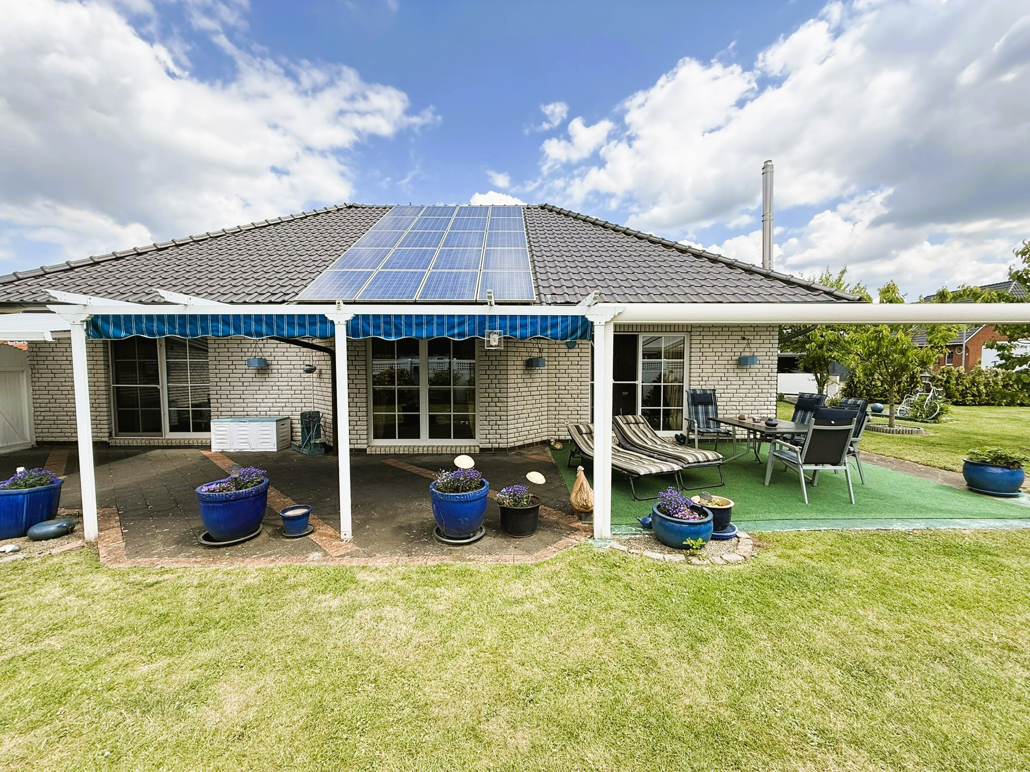 Dieser Bungalow wurde im Jahr 2000 auf einem 829 m² großem Eigenlandgrundstück individuell geplant und mit hochwertigen Materialien errichtet. Er verfügt derzeit über ca. 136 m² Wohnfläche. Der weiße Verblender und das anthrazitfarbene Walmdach verleihen ihm eine ansprechende, zeitlose Optik.Über ein geschmackvoll gestaltetes Eingangsportal erreichen Sie die etwas zurückversetzte, witterungsgeschützte Eingangstür und betreten den Windfang Ihres neuen Zuhauses. Linkerhand liegt das helle Gäste-Bad mit Waschtisch, WC, Dusche und Fenster. Durchschreiten Sie geradezu das Glaselement, befinden Sie sich im Flur, von dem alle weiteren Räume zu erreichen sind.