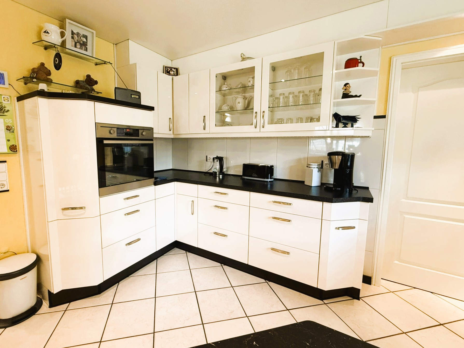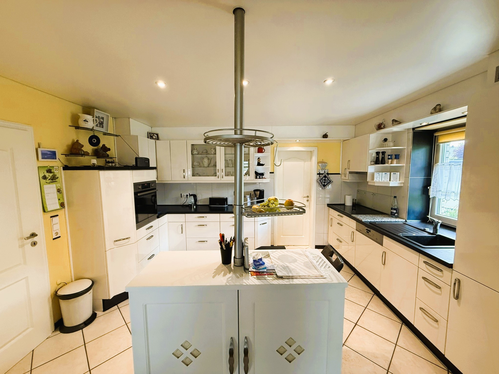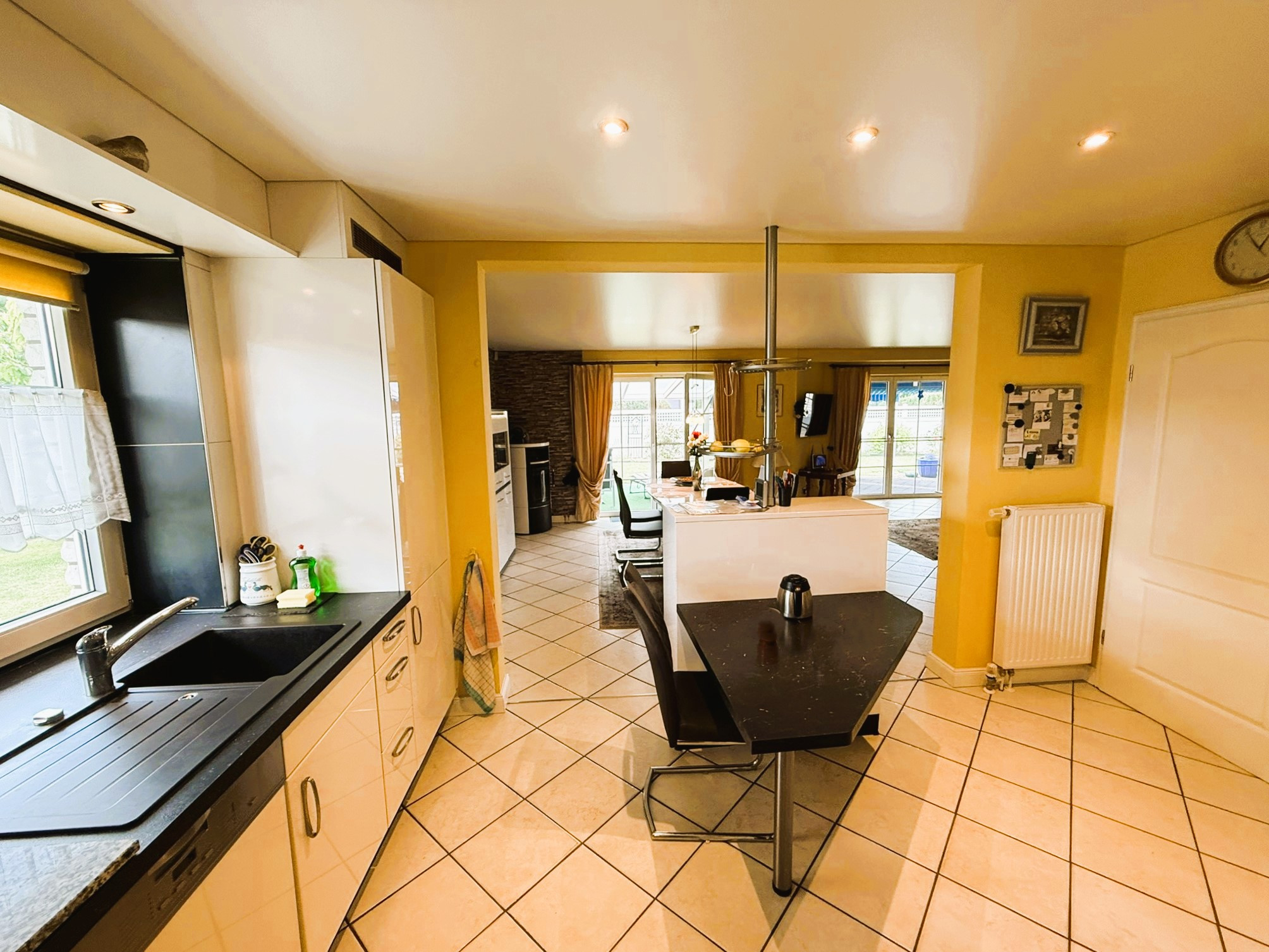 Mittelpunkt des Gebäudes ist der über 53 m² große Wohn-Ess-Bereich mit offener Küche. Die dort verbaute neuwertige Einbauküche verfügt über weiße Hochglanzfronten und dunkle Arbeitsplatten. Zahlreiche praktische Auszüge stehen zur Verfügung. Die Elektrogeräteausstattung lässt keine Wünsche offen. Der hochgesetzte Backofen, das Induktionskochfeld, die Abzugshaube, der Geschirrspüler und die Kühl-Gefrier-Kombination bieten alle Möglichkeiten zum Ausleben Ihrer Kochkünste. Der angegliederte Hauswirtschaftsraum schafft sichtgeschützte Vorbereitungs- und Lagerungsoptionen.