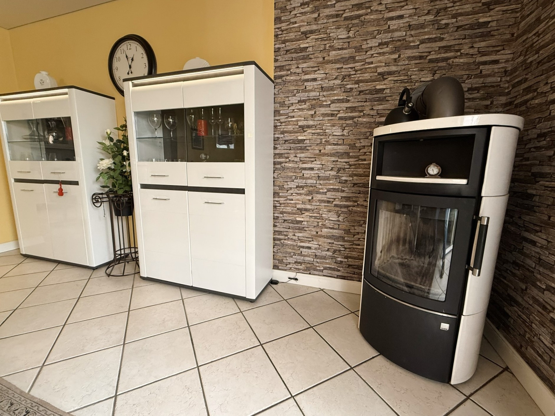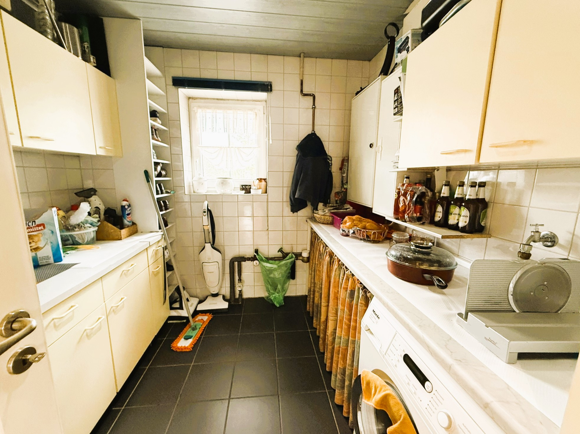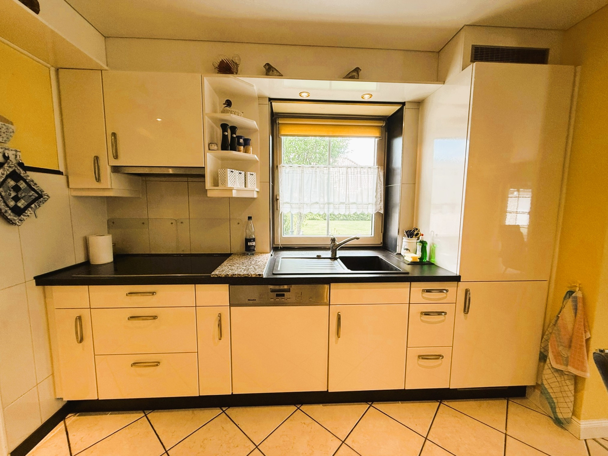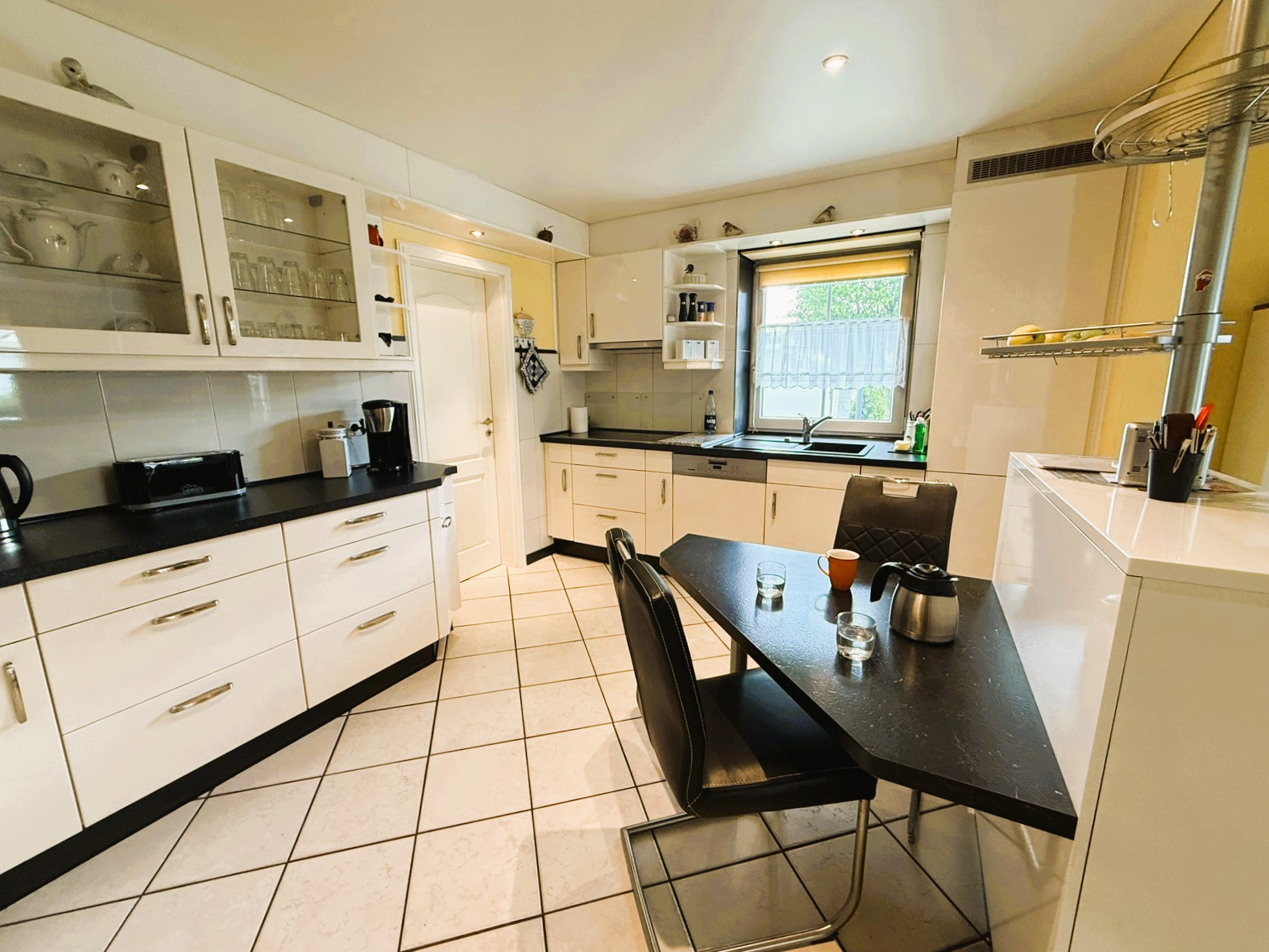 Mittelpunkt des Gebäudes ist der über 53 m² große Wohn-Ess-Bereich mit offener Küche. Die dort verbaute neuwertige Einbauküche verfügt über weiße Hochglanzfronten und dunkle Arbeitsplatten. Zahlreiche praktische Auszüge stehen zur Verfügung. Die Elektrogeräteausstattung lässt keine Wünsche offen. Der hochgesetzte Backofen, das Induktionskochfeld, die Abzugshaube, der Geschirrspüler und die Kühl-Gefrier-Kombination bieten alle Möglichkeiten zum Ausleben Ihrer Kochkünste. Der angegliederte Hauswirtschaftsraum schafft sichtgeschützte Vorbereitungs- und Lagerungsoptionen.
