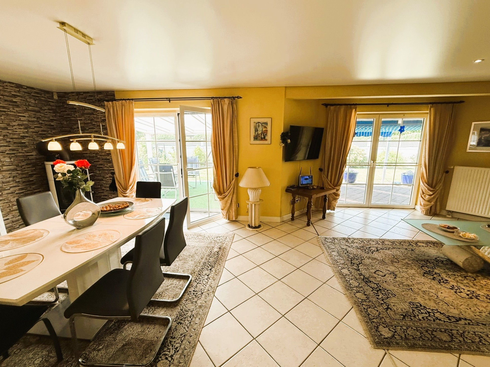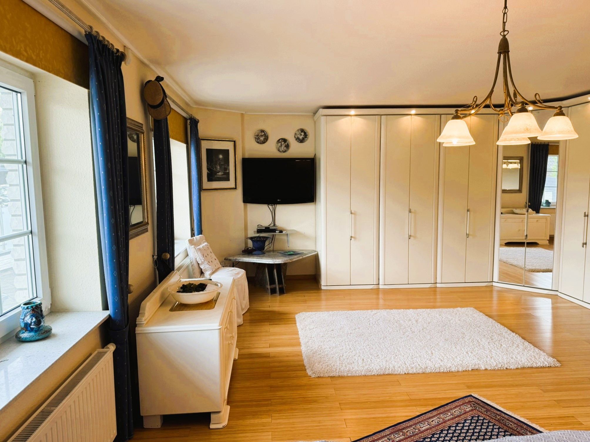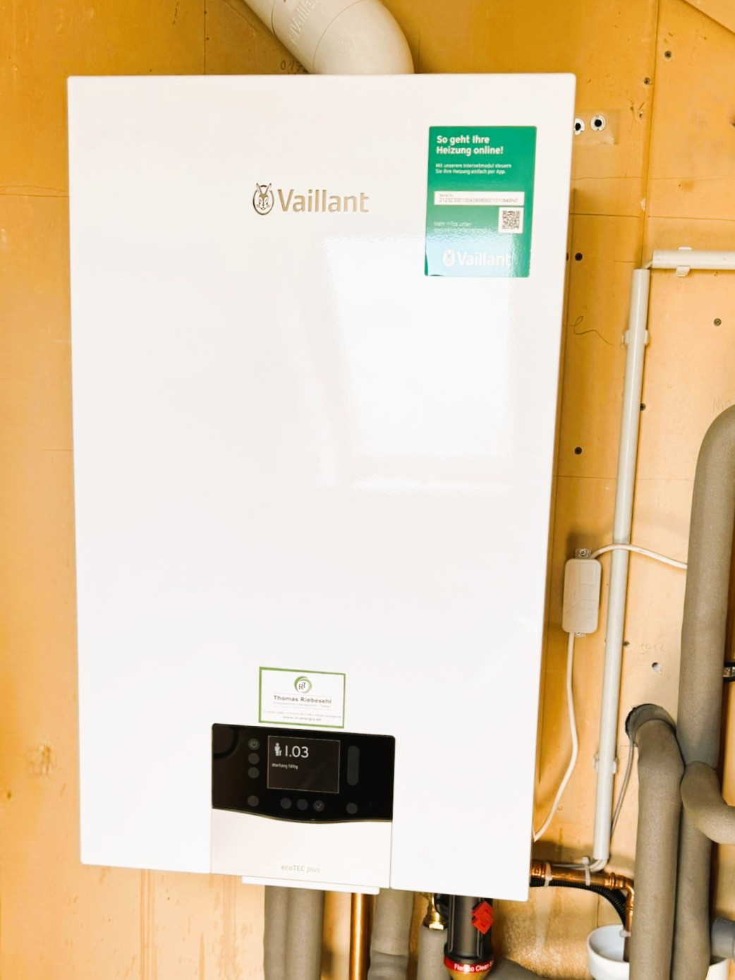 Beheizt wird das Gebäude durch eine im Jahr 2024 neu installierte Gasheizung von Vaillant mit Solarunterstützung. Zusätzlich zu den Heizkörpern verfügen die Küche und die Bäder über eine Fußbodenheizung. Auch zur Stromgewinnung wird die Sonne mittels der darüber hinaus installierten Fotovoltaikanlage genutzt. Die Fenster sind aus weißem Kunststoff mit innenliegenden Sprossen und besitzen einen auch heute noch zeitgemäßen Wärmedurchgangskoeffizient von 1,1 W/(m²K). Sie sind mit einer einbruchshemmenden Folie versehen. Darüber hinaus sorgen eine Alarmanlage und Überwachungskameras für Sicherheit. Unerwünschte tierische Eindringlinge werden durch die Insektenschutzgitter ferngehalten.