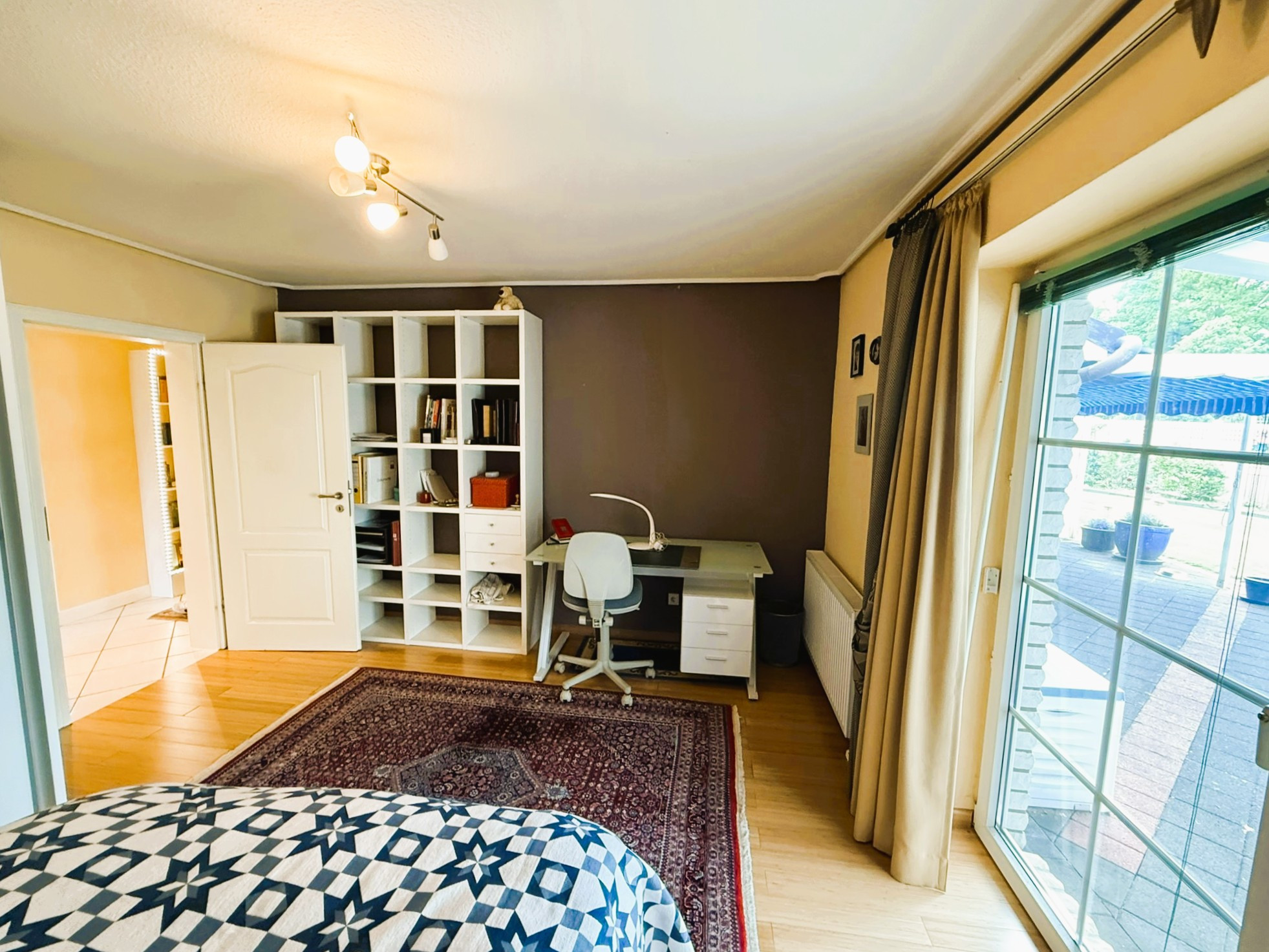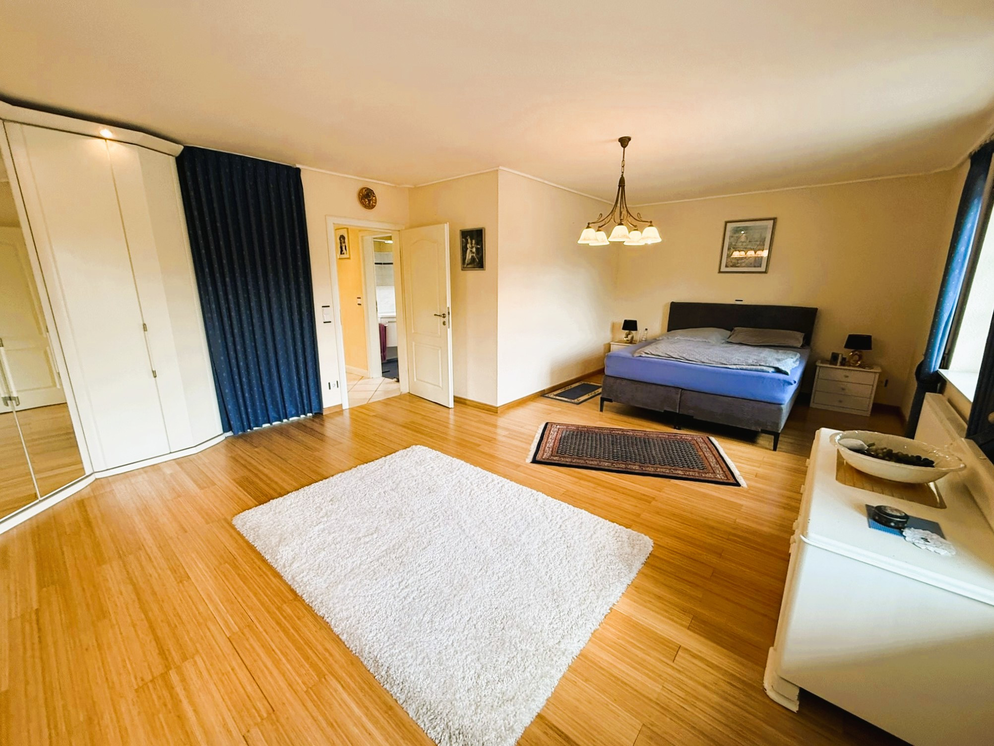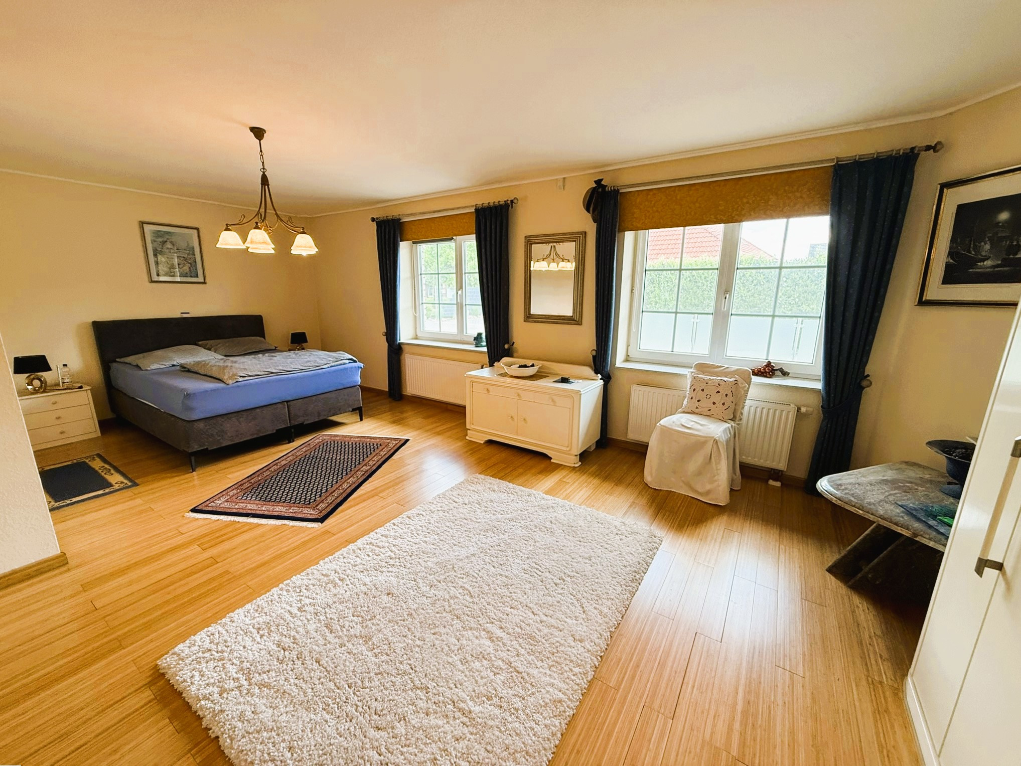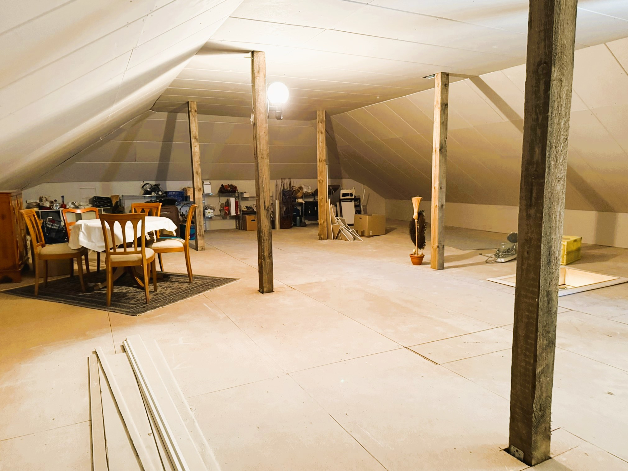 Der Boden des gesamten Bereiches ist hell gefliest und harmoniert wunderbar mit den verbauten, wertigen weißen Spanndecken. Ein Kaminofen sorgt für wohlige Atmosphäre. Zwei Türen führen Sie auf die großzügige Terrasse, die in Teilen überdacht ist und so auch bei etwas schlechterem Wetter ein gut geschütztes Plätzchen zum Entspannen offeriert.Auch das Schlafzimmer ist mit fast 31 m² überdurchschnittlich groß und bietet somit ein tolles Raumgefühl. Bei Bedarf ließen sich daraus auch zwei Räume machen. Als Bodenbelag fand hier, ebenso wie in dem gegenüberliegenden weiteren Zimmer, hochwertiges Echtholzparkett Verwendung. Zwischen den beiden Räumen liegt das hell geflieste Badezimmer mit Waschtisch, WC und großer Eckbadewanne. Das vorhandene Fenster lässt Tageslicht hinein und feuchte Luft hinaus. Der Dachboden des Hauses wird derzeit über eine Einschubtreppe erreicht und ist bereits isoliert, verkleidet und ausgedielt. Er bietet somit bei Bedarf beste Voraussetzungen für einen weiteren Ausbau und die Schaffung zusätzlicher Wohnfläche.