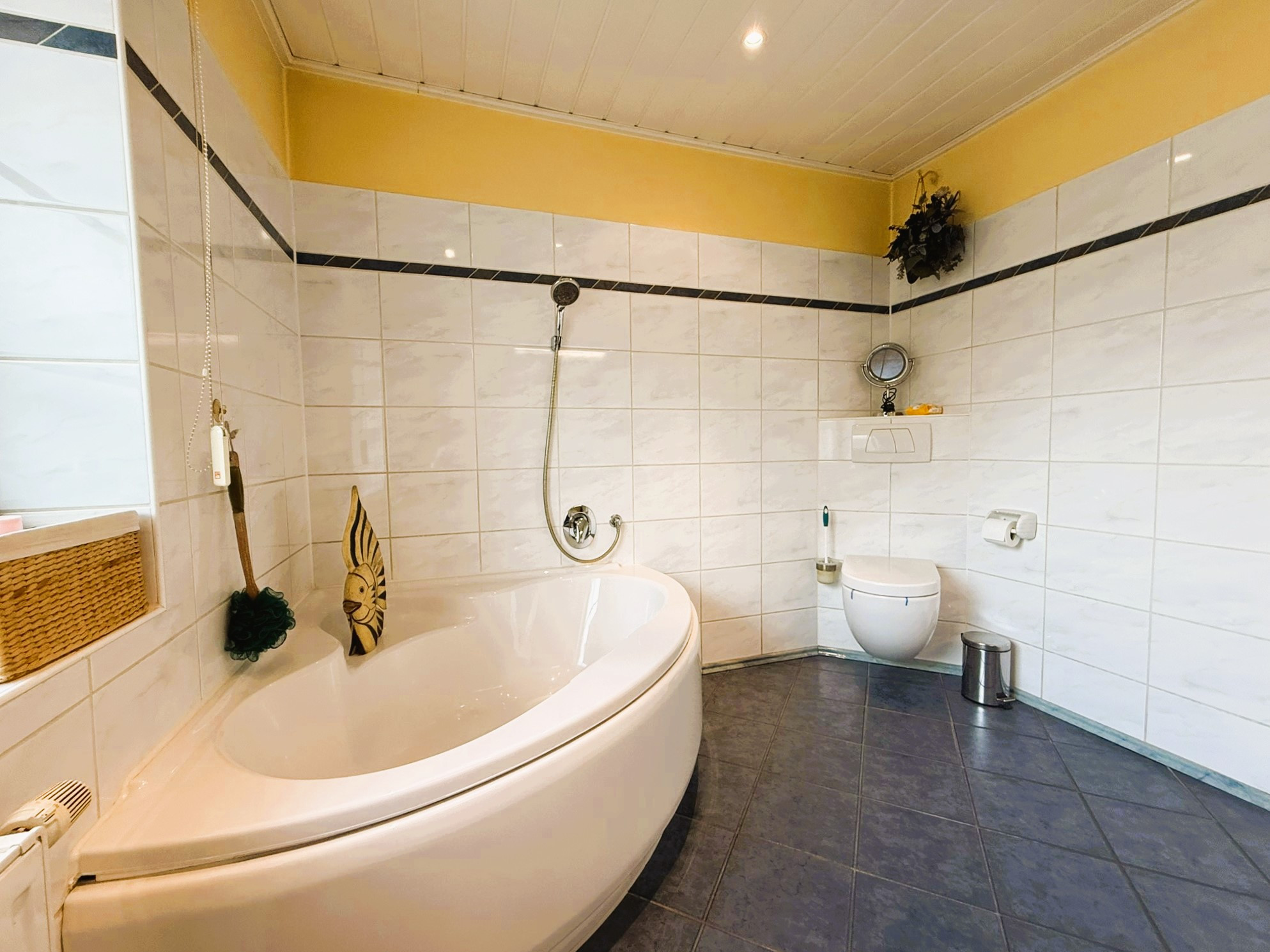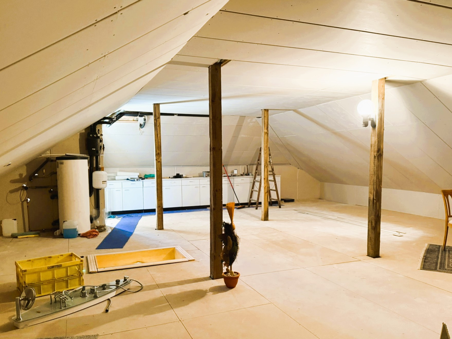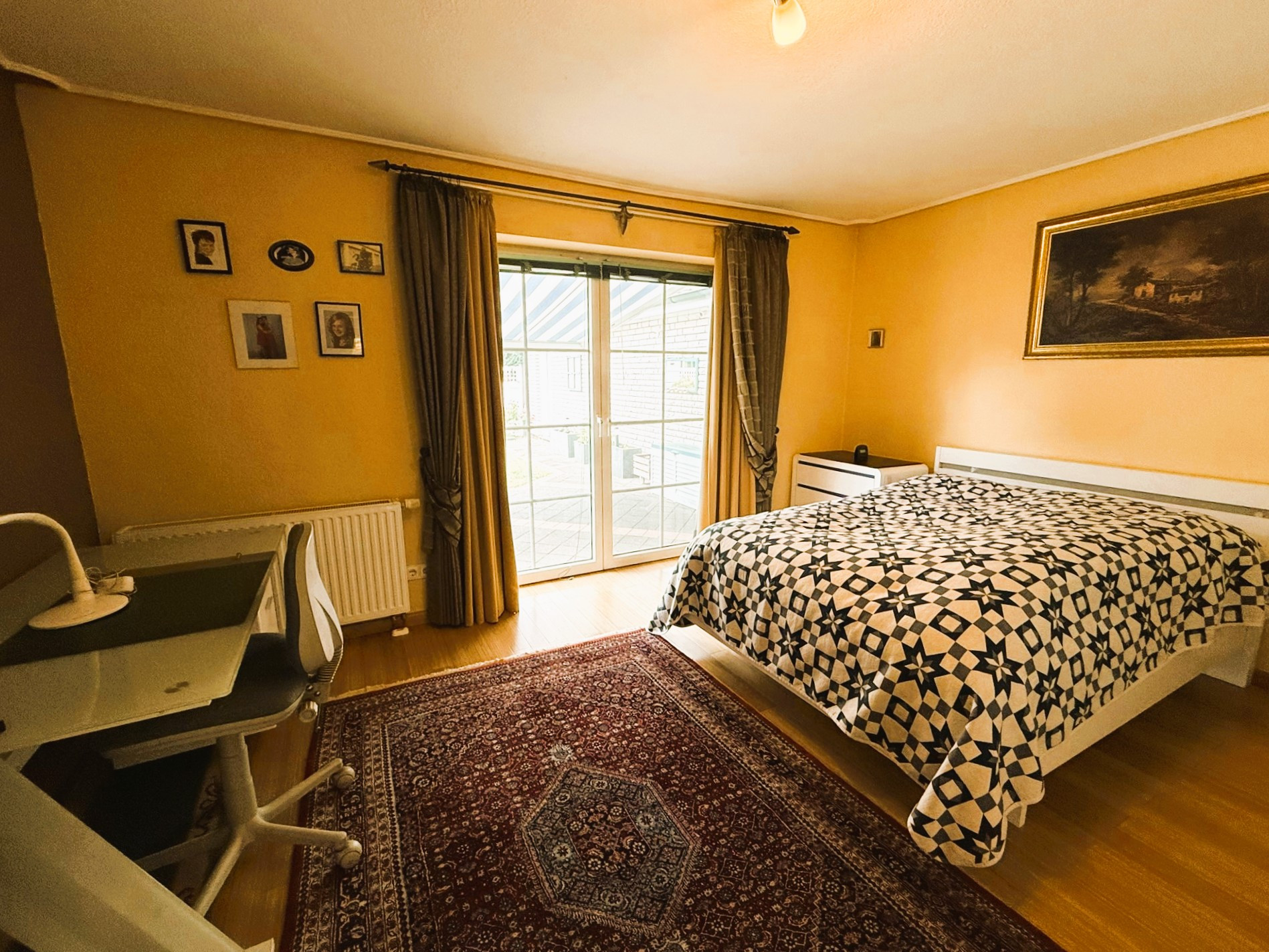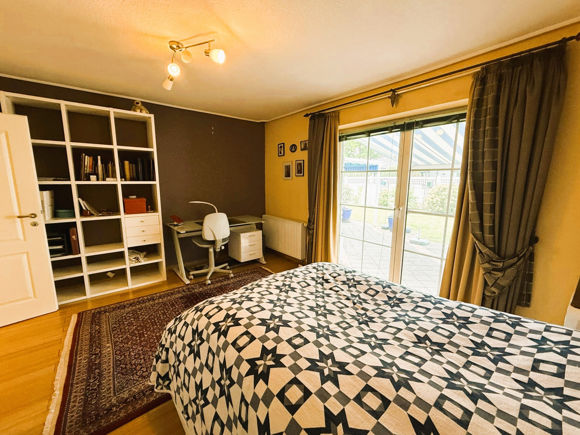 Der Boden des gesamten Bereiches ist hell gefliest und harmoniert wunderbar mit den verbauten, wertigen weißen Spanndecken. Ein Kaminofen sorgt für wohlige Atmosphäre. Zwei Türen führen Sie auf die großzügige Terrasse, die in Teilen überdacht ist und so auch bei etwas schlechterem Wetter ein gut geschütztes Plätzchen zum Entspannen offeriert.Auch das Schlafzimmer ist mit fast 31 m² überdurchschnittlich groß und bietet somit ein tolles Raumgefühl. Bei Bedarf ließen sich daraus auch zwei Räume machen. Als Bodenbelag fand hier, ebenso wie in dem gegenüberliegenden weiteren Zimmer, hochwertiges Echtholzparkett Verwendung. Zwischen den beiden Räumen liegt das hell geflieste Badezimmer mit Waschtisch, WC und großer Eckbadewanne. Das vorhandene Fenster lässt Tageslicht hinein und feuchte Luft hinaus. Der Dachboden des Hauses wird derzeit über eine Einschubtreppe erreicht und ist bereits isoliert, verkleidet und ausgedielt. Er bietet somit bei Bedarf beste Voraussetzungen für einen weiteren Ausbau und die Schaffung zusätzlicher Wohnfläche.