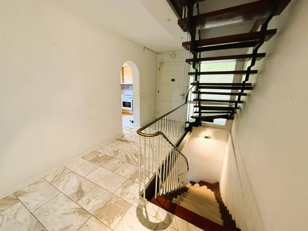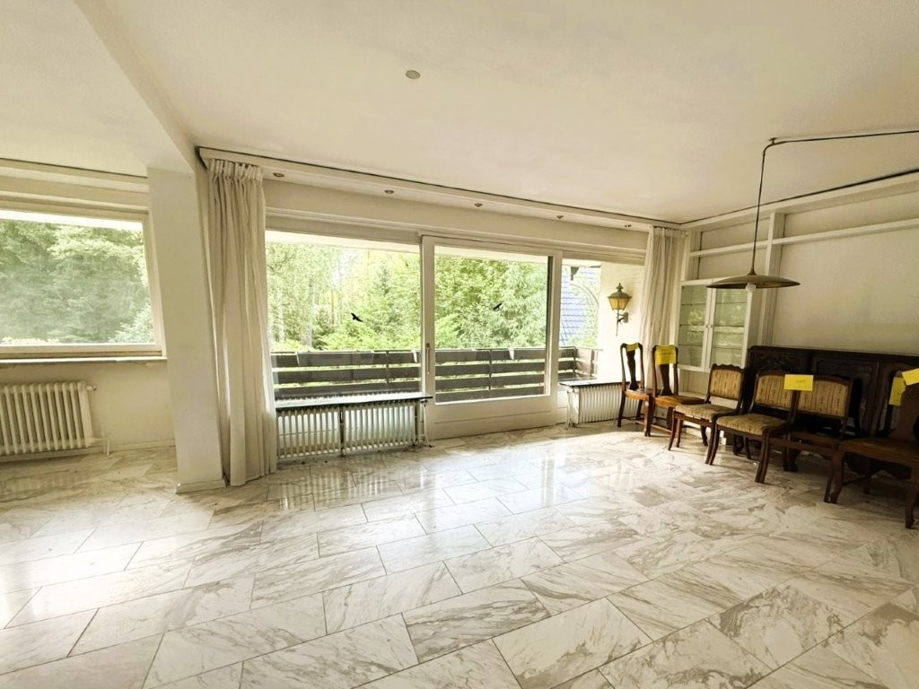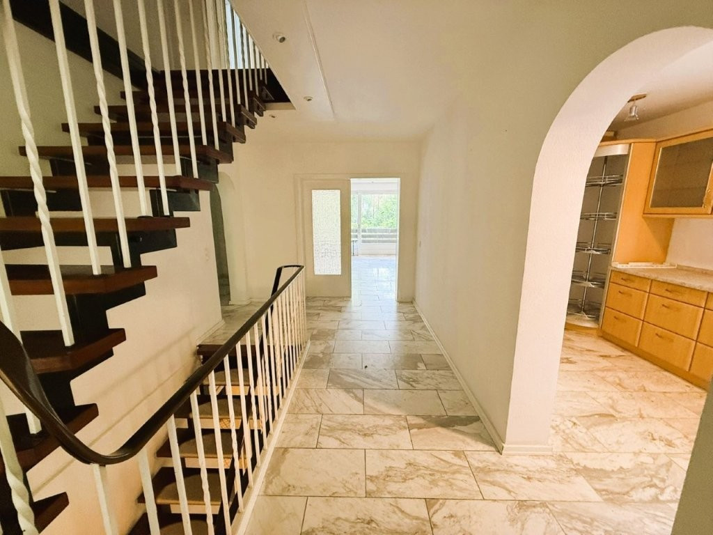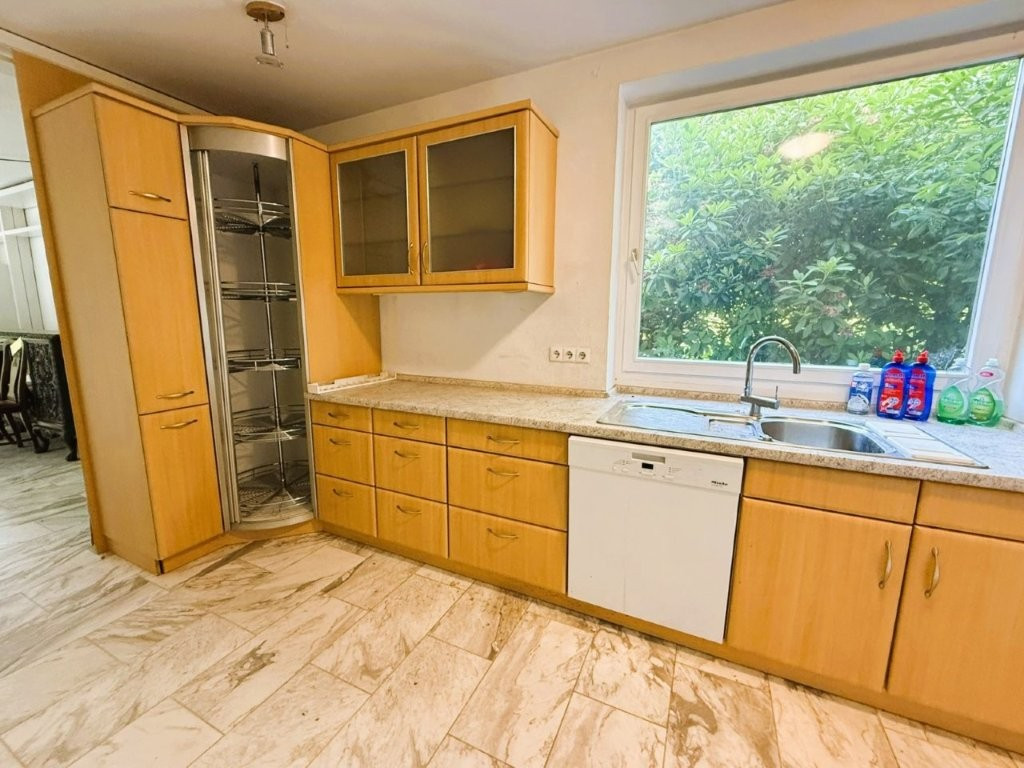 Sie betreten das Haus auf der mittleren Ebene, die zum allergrößten Teil über hochwertigen Naturstein-Bodenbelag verfügt. Rechterhand liegt die Küche. Sie ist mit einer älteren Einbauküche inklusive Elektrogeräten versehen. Von dort oder alternativ über den Flur durch eine zweiflüglige Tür ist der großzügige Wohn-Ess-Bereich, der über verschiedene Einbauschränke verfügt, zugänglich. Ihm vorgelagert ist der Balkon, auf dem Sie sonnige Abendstunden mit Blick ins Grüne genießen können. Von der Diele aus linkerhand befinden sich ein weiteres Zimmer sowie ein in weiß gehaltenes Bad mit Eckbadewanne, Waschtisch, WC und Handtuchheizkörper.