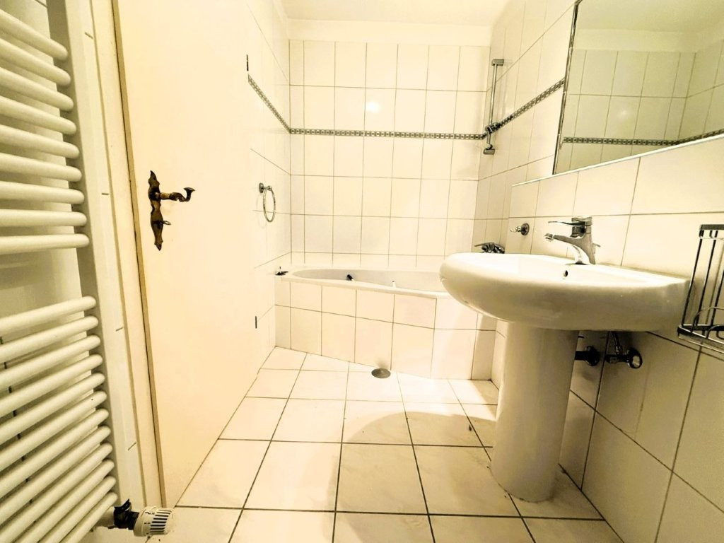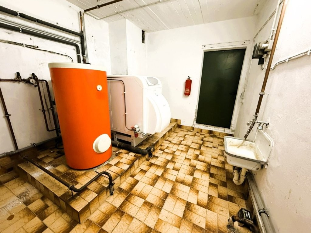 Eine offene Echtholztreppe führt Sie in die untere Ebene. Hier wurde größtenteils heller Laminatboden verlegt. Rechts von der dortigen Diele steht ein flexibel nutzbarer Raum zur Verfügung, geradezu ein großzügiges, helles Zimmer mit Zugang zu einer weiteren Terrasse. Sie ist ebenfalls von dem benachbarten dritten Zimmer dieser Etage erreichbar. Links von der Diele befindet sich ein in dunkelgrün gehaltenes Badezimmer. Dieses wurde mit einer Badewanne, zwei Waschtischen, einem WC und einem Bidet ausgestattet. In dem von dort begehbaren Heizungsraum, der auch als Waschküche dient, ist die Ölbrennwertheizung mit zentraler Warmwasseraufbereitung von Brötje aus dem Jahr 2008 untergebracht. Sie versorgt sowohl die hier zum Verkauf stehenden Doppelhaushälfte als auch die benachbarte. Die laufenden Kosten werden zwischen beiden Parteien aufgeteilt. Zurzeit sind weder hierfür noch für die Wasserversorgung getrennte Zähler vorhanden. Inwieweit dies zukünftig bestehen bleibt, ist mit dem Nachbarn zu klären.