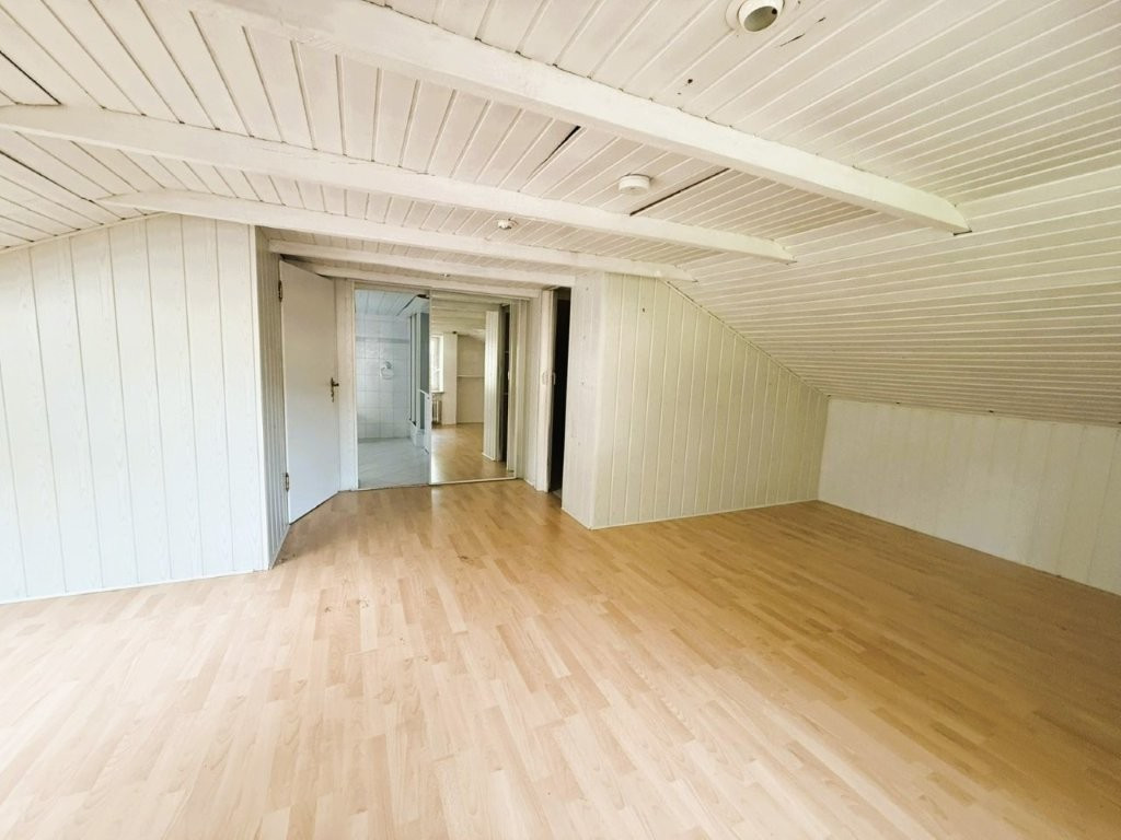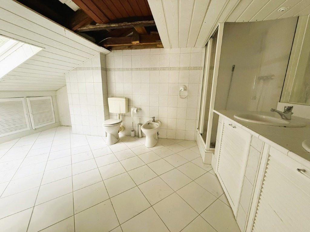 Eine weitere offene Holztreppe erschließt von der mittleren Ebene aus das Dachgeschoss. Die Deckenhöhe in den Bereichen ohne Schrägen beträgt 1,95 m, so dass diese Räume nicht in die Wohnfläche eingeflossen sind. Hier sind ein großes, helles Studio mit Laminatboden und ein angeschlossenes, drittes Badezimmer mit Dusche, Doppelwaschtisch, WC und Bidet in weiß vorhanden. Abgerundet wird das Raumangebot dieser Ebene durch einen Abstellraum.