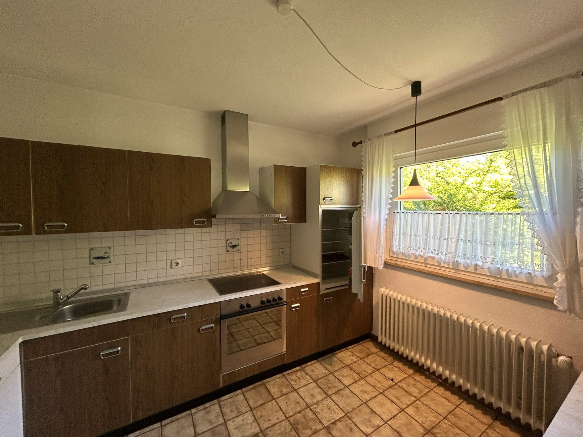 Von der Diele rechts abgehend befindet sich die Küche. Sie ist mit einer Einbauküche älteren Baujahres versehen, wobei die Elektrogeräte bereits erneuert wurden. Eine praktische Durchreiche verkürzt den Weg in das Wohn- und Esszimmer. Mit seiner bodentiefen Fensterfront ist auch hier für optimalen Lichteinfall gesorgt. Genießen Sie gemütliche Stunden auf dem Sofa mit Blick in den wunderschönen Garten. Vom Wohnzimmer aus gelangen Sie auch auf die großzügige, mit Granitplatten versehene Terrasse mit optimaler Südausrichtung. Wird es Ihnen in der Sonne mal zu warm, so ist eine große Markise vorhanden. Praktischen Stauraum bietet hier der von der Terrasse erreichbare Abstellraum.