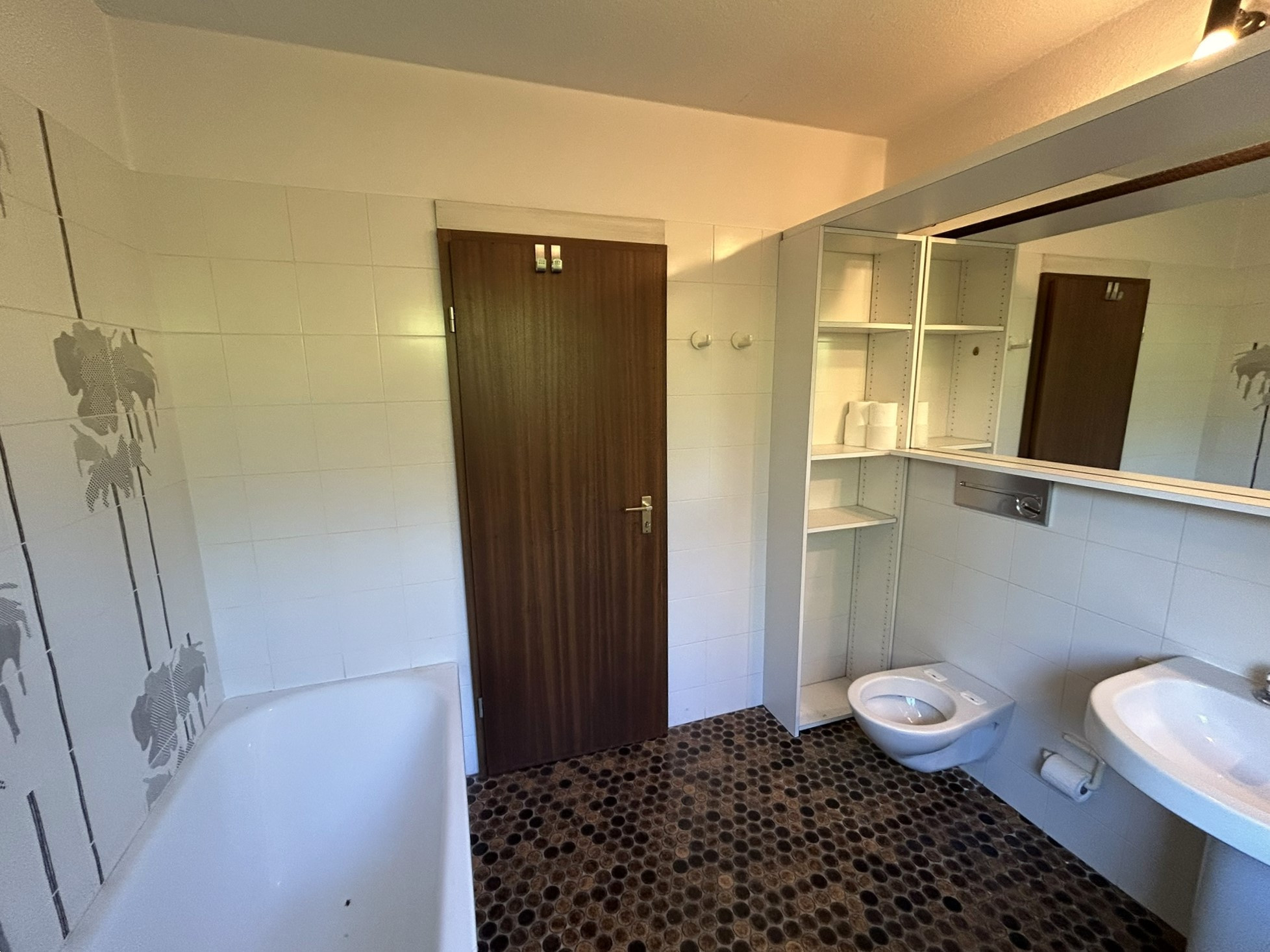 Über die mit Granitpflaster versehene Zuwegung erreichen Sie die Haustür, hinter der Sie die großzügige, helle Diele erwartet. Von ihr sind alle Räume des ca. 109,32 m² großen Erdgeschosses erreichbar. Linker Hand befindet sich ein freundliches, in weiß und blau gehaltenes, barrierefreies Duschbad neueren Datums. Das benachbarte Hauptbadezimmer mit Badewanne hat ebenfalls bereits einzelne Modernisierungsmaßnahmen erfahren und ist weiß-braun gestaltet. Drei helle Zimmer, allesamt zum Garten orientiert, warten auf ihre individuelle Nutzung.