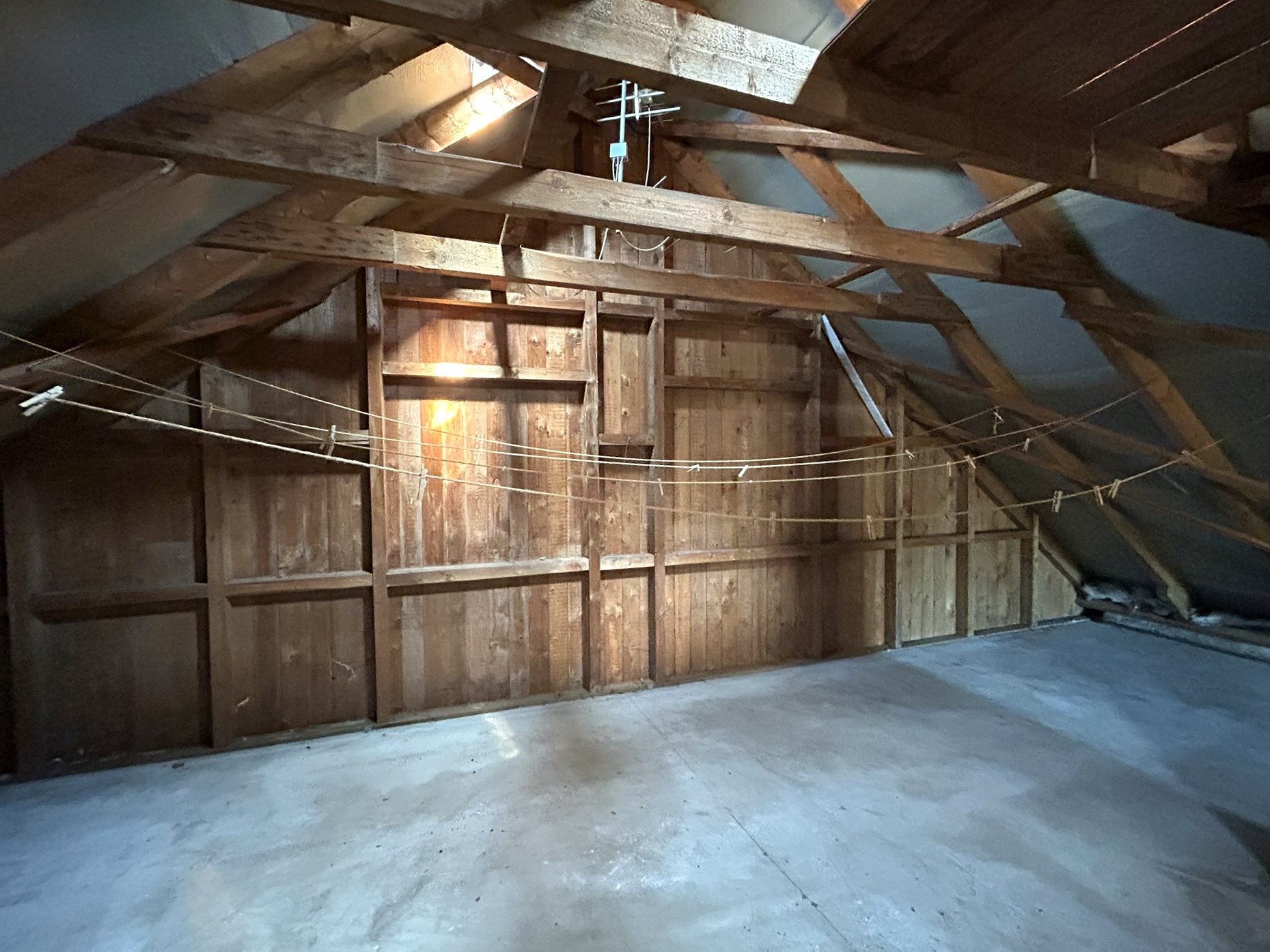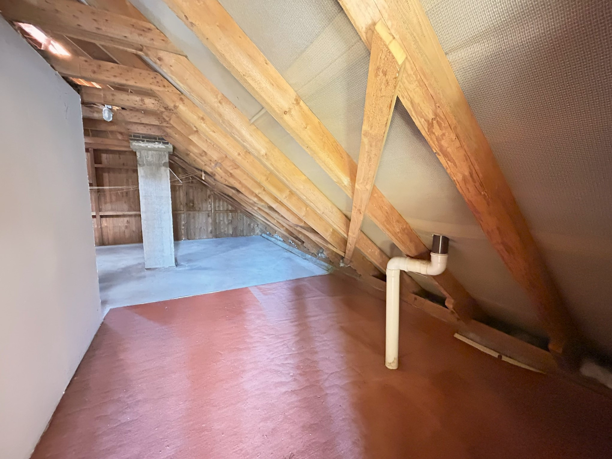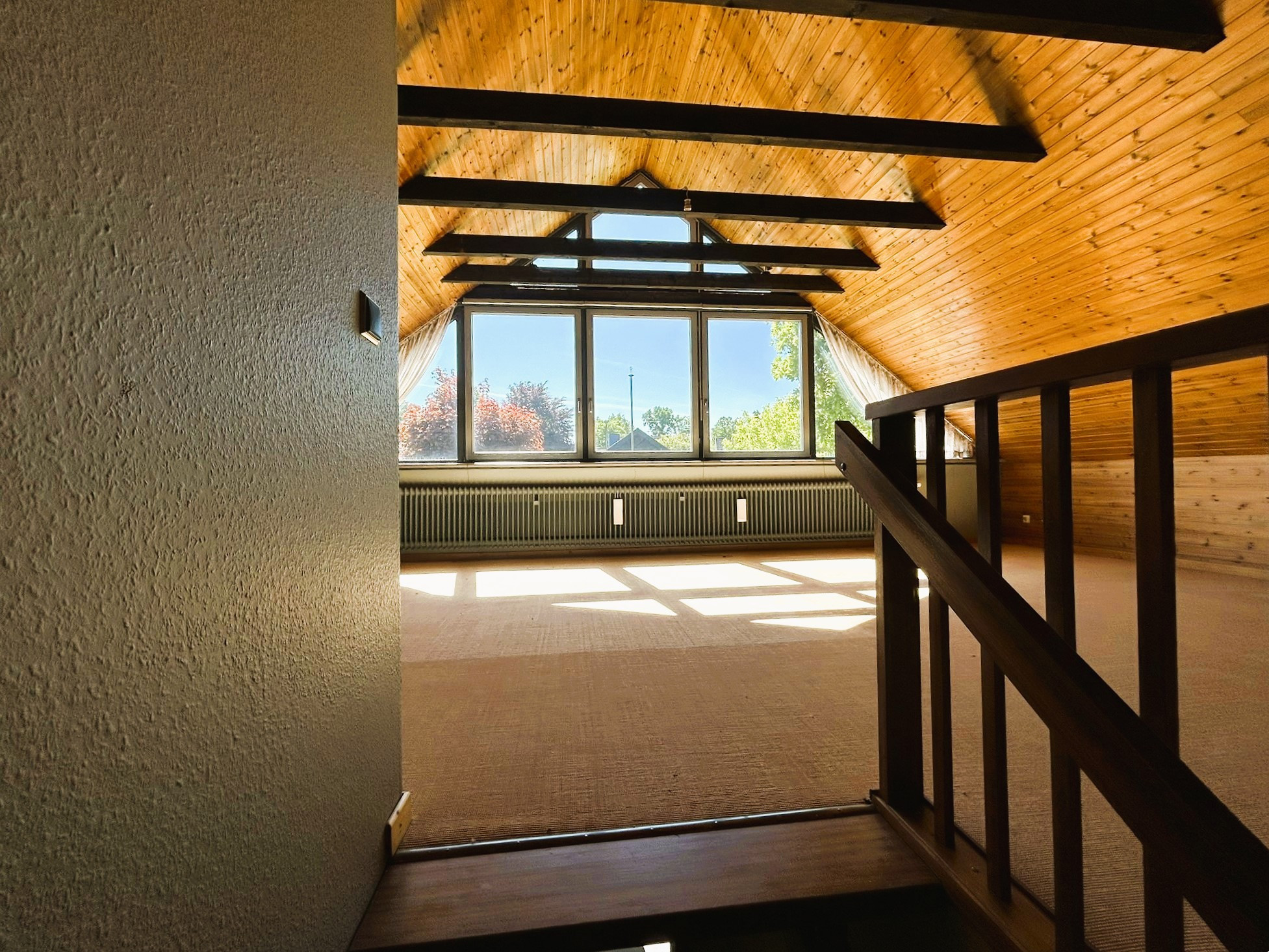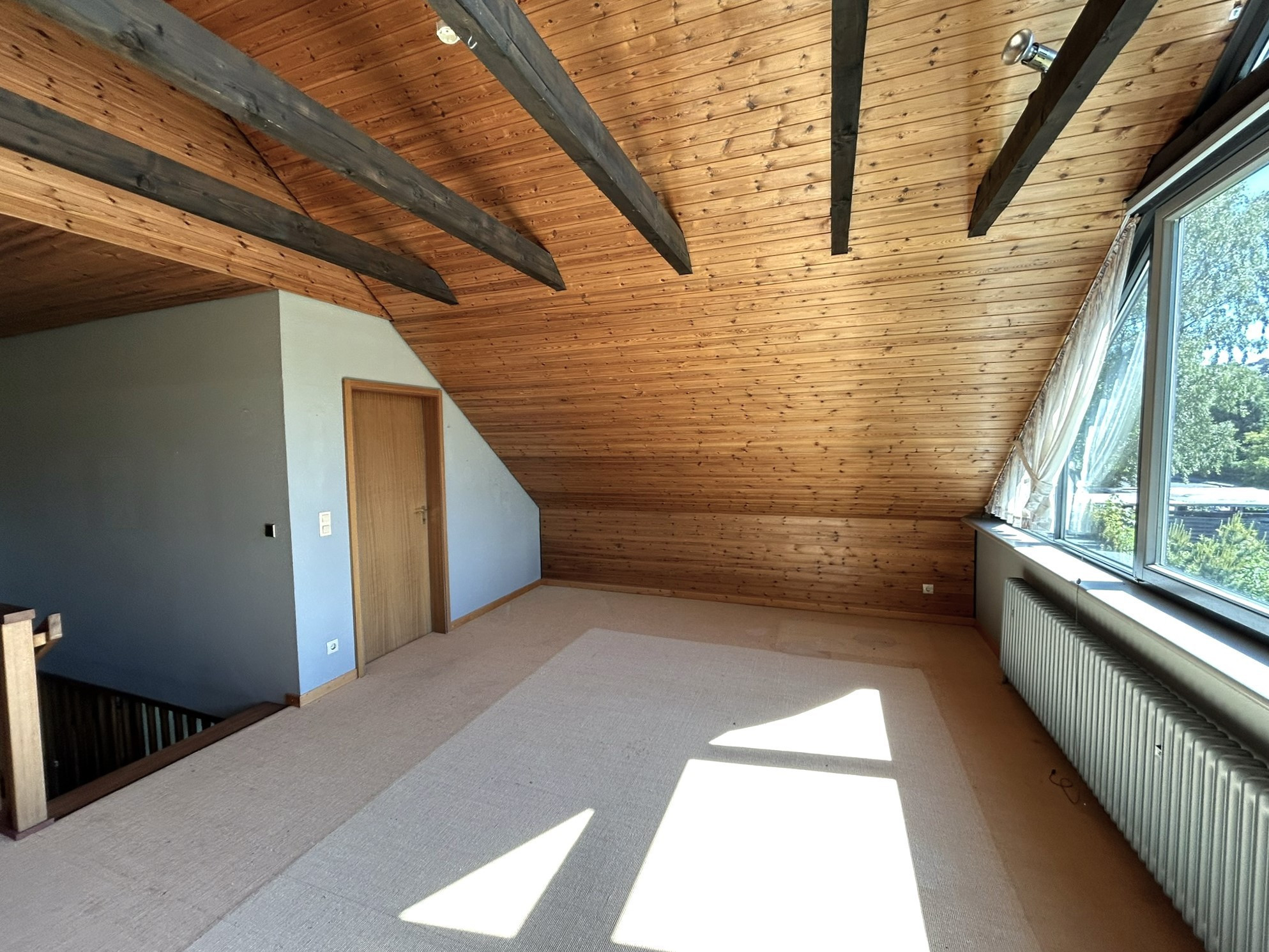 Eine offene Massivholztreppe führt Sie in das zum Teil ausgebaute Obergeschoss. Der weitläufige, studioartige Raum beeindruckt durch seine übergroße Fensterfront sowie die zum Teil freiliegenden Deckenbalken. Hier stehen Ihnen derzeit ca. 38,53 m² Wohnfläche zur Verfügung. Der Rest des Obergeschosses wird aktuell als Dachboden genutzt und bietet Ihnen somit ggf. noch weitere Ausbaumöglichkeiten. Unter Berücksichtigung der Schrägen könnten weitere ca. 40,29 m² Wohnfläche entstehen. Da ein Bebauungsplan nicht besteht, richtet sich die Zulässigkeit nach der Nachbarbebauung. Das konkrete Vorhaben ist mit dem Bauamt abzuklären.Reichlich Abstellfläche und Raum für diverse anderen Nutzungen finden Sie im Vollkeller des Hauses. Er umfasst ca. 112,46 m² verteilt auf sieben Räume und verfügt über eine Deckenhöhe von ca. 2,20 m. Unter anderem befinden sich dort zur Zeit die Waschküche und die Ende des Jahres 2022 installierte Gasbrennwertheizung mit zentraler Warmwasseraufbereitung von Buderus.