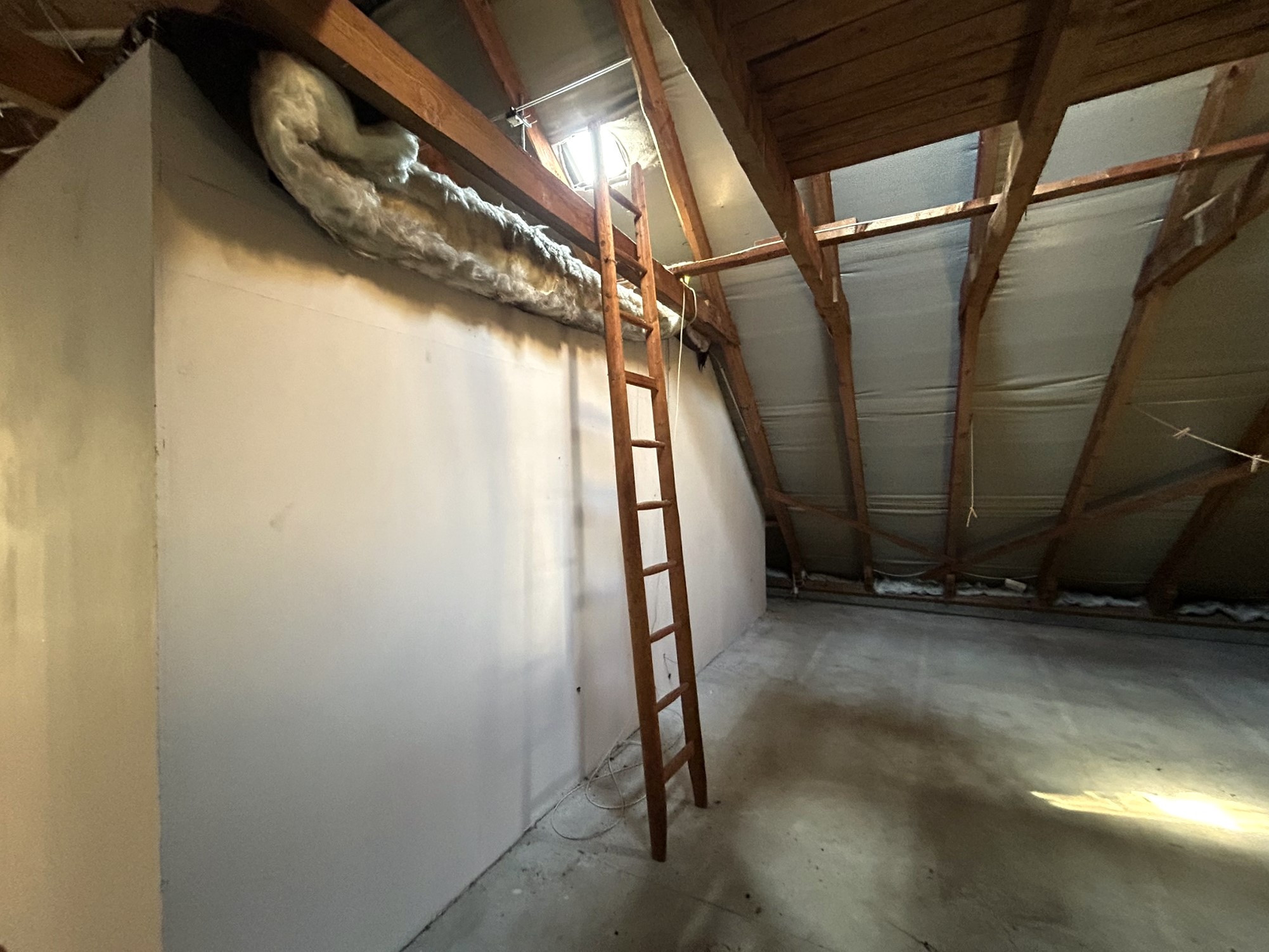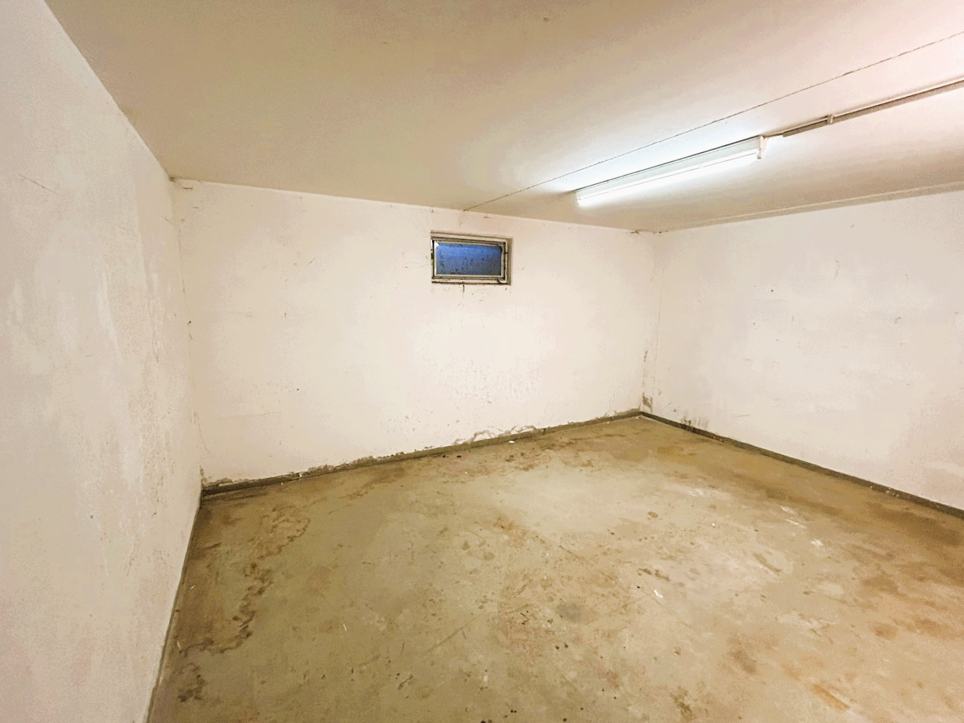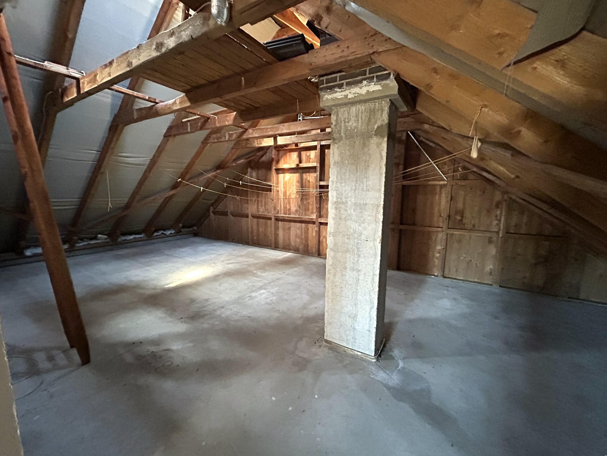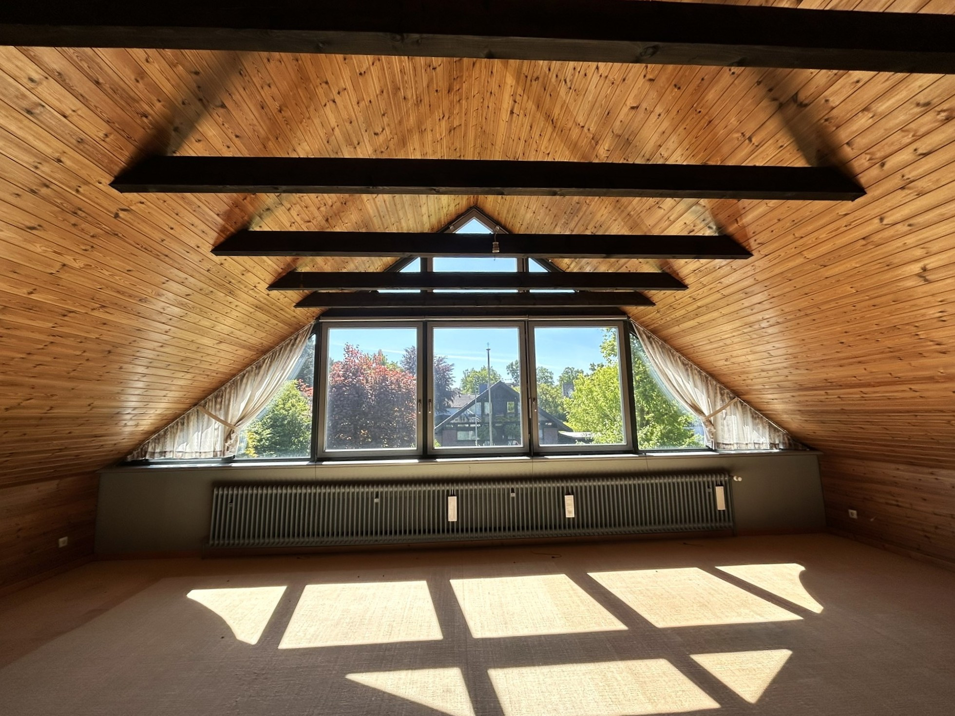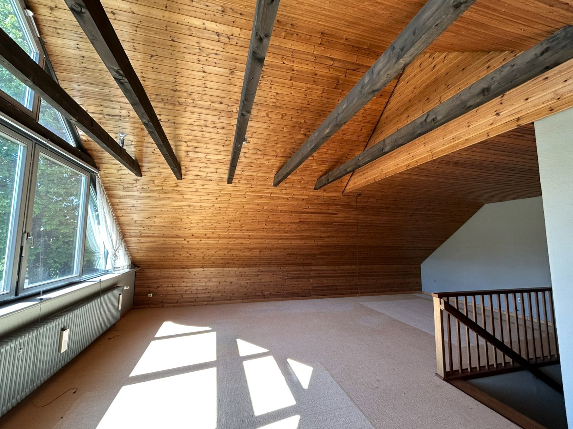 Eine offene Massivholztreppe führt Sie in das zum Teil ausgebaute Obergeschoss. Der weitläufige, studioartige Raum beeindruckt durch seine übergroße Fensterfront sowie die zum Teil freiliegenden Deckenbalken. Hier stehen Ihnen derzeit ca. 38,53 m² Wohnfläche zur Verfügung. Der Rest des Obergeschosses wird aktuell als Dachboden genutzt und bietet Ihnen somit ggf. noch weitere Ausbaumöglichkeiten. Unter Berücksichtigung der Schrägen könnten weitere ca. 40,29 m² Wohnfläche entstehen. Da ein Bebauungsplan nicht besteht, richtet sich die Zulässigkeit nach der Nachbarbebauung. Das konkrete Vorhaben ist mit dem Bauamt abzuklären.Reichlich Abstellfläche und Raum für diverse anderen Nutzungen finden Sie im Vollkeller des Hauses. Er umfasst ca. 112,46 m² verteilt auf sieben Räume und verfügt über eine Deckenhöhe von ca. 2,20 m. Unter anderem befinden sich dort zur Zeit die Waschküche und die Ende des Jahres 2022 installierte Gasbrennwertheizung mit zentraler Warmwasseraufbereitung von Buderus.