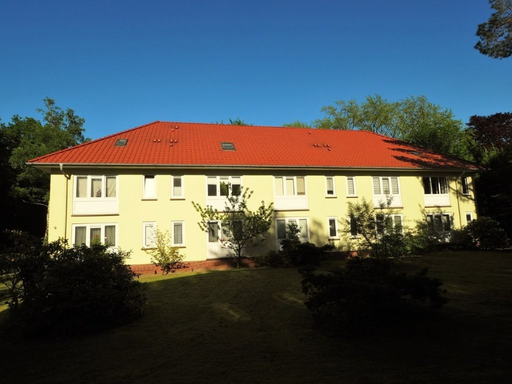 Die Wohnung ist Teil einer Wohnanlage, die aus insgesamt 56 Wohnungen verteilt auf drei im Jahre 1954 massiv errichteten Gebäuden sowie einem Garagengebäude mit fünf Garagen besteht. Die Dächer wurden vor einiger Zeit bereits erneuert und sorgen im Zusammenspiel mit der gelb gestrichenen Putzfassade und den weißen Fenstern für eine zeitgemäße Optik. Das weitläufige insgesamt 3.832 m² große Grundstück bietet in Verbindung mit der Lage direkt gegenüber eines weitläufigen Waldgebietes ein angenehmes Wohnumfeld.