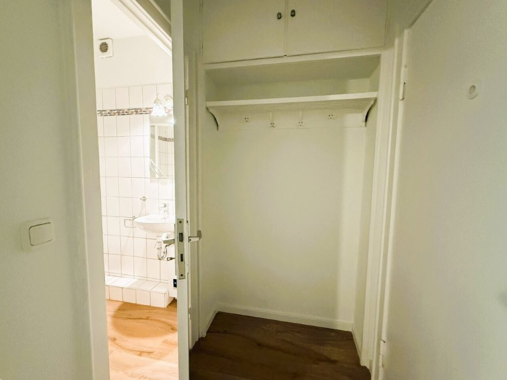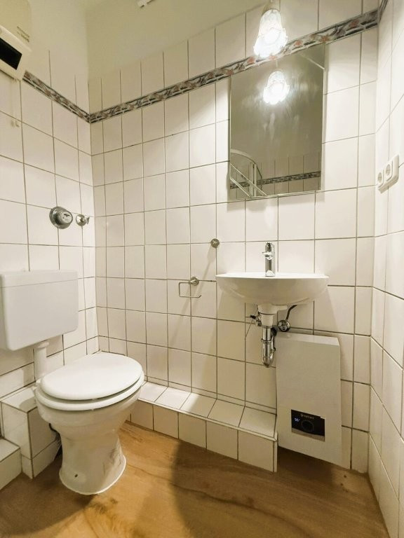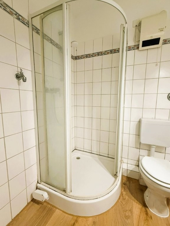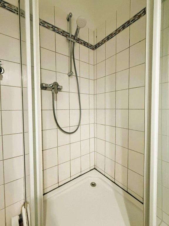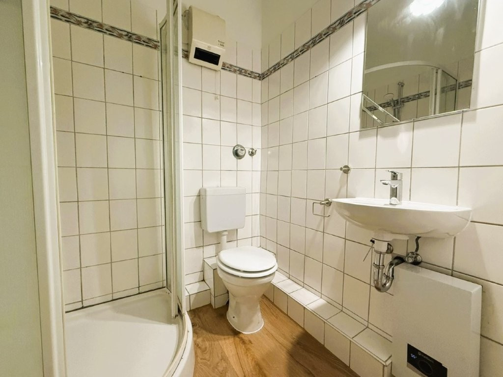 Wenn Sie die 35,4 m² große Wohnung im 1. OG betreten, gelangen Sie zunächst in den Vorflur. Rechts befinden sich die Garderobe und ein kleiner Einbauschrank. Geradezu gelangen sie in das weiß geflieste Duschbad, in dem auch ein Waschmaschinenanschluss vorhanden ist. Das WC, der Spülkasten, das Waschbecken und die Armaturen von Grohe sind neu. Für die Entlüftung sorgt ein elektrischer Lüfter. Links führt Sie eine Tür mit Glaseinsatz in das Wohnzimmer, dem zentralen Raum der Wohnung. Von ihm sind sowohl die Küche als auch das Schlafzimmer mit einem geräumigen Einbauschrank erreichbar.